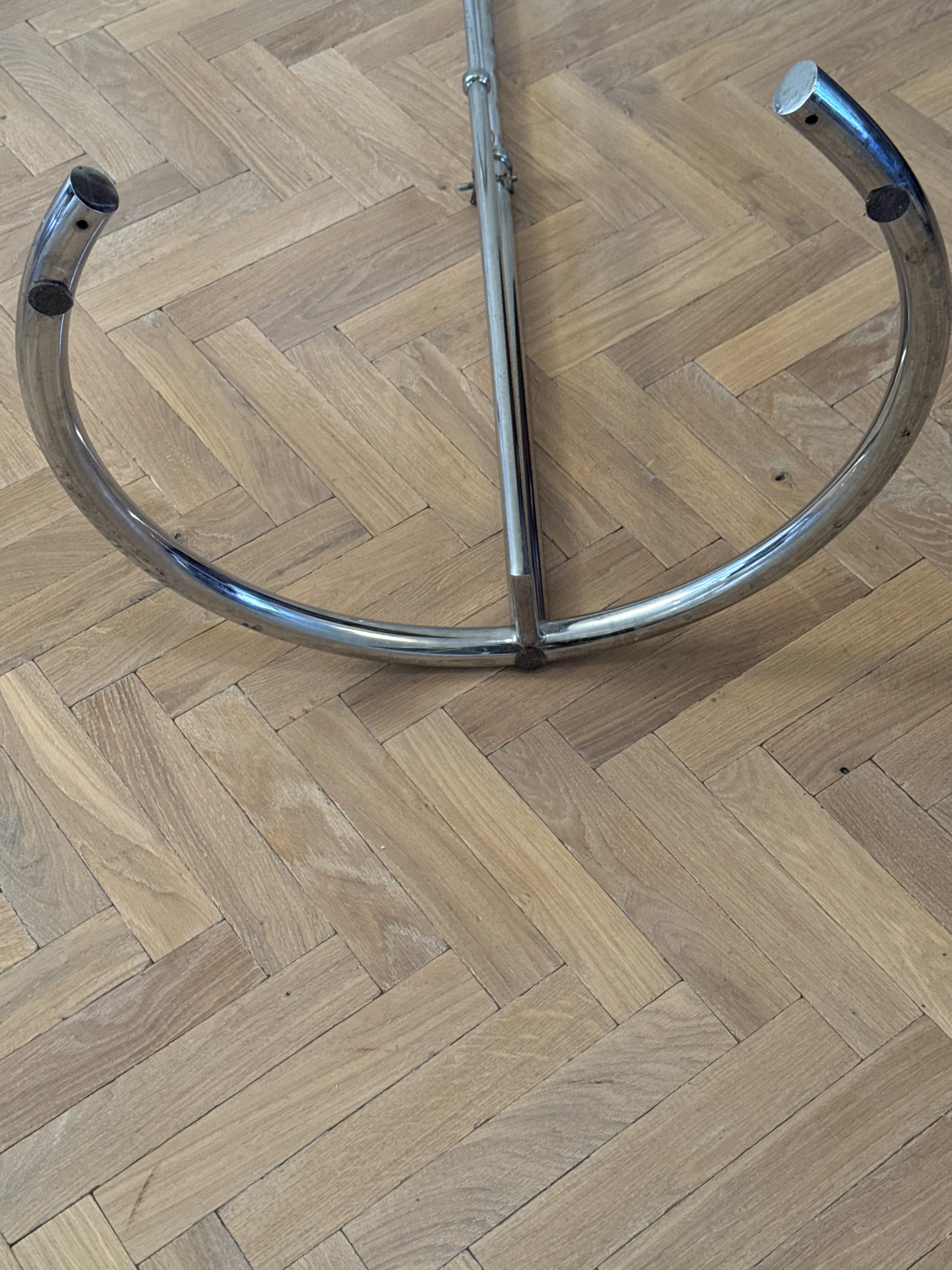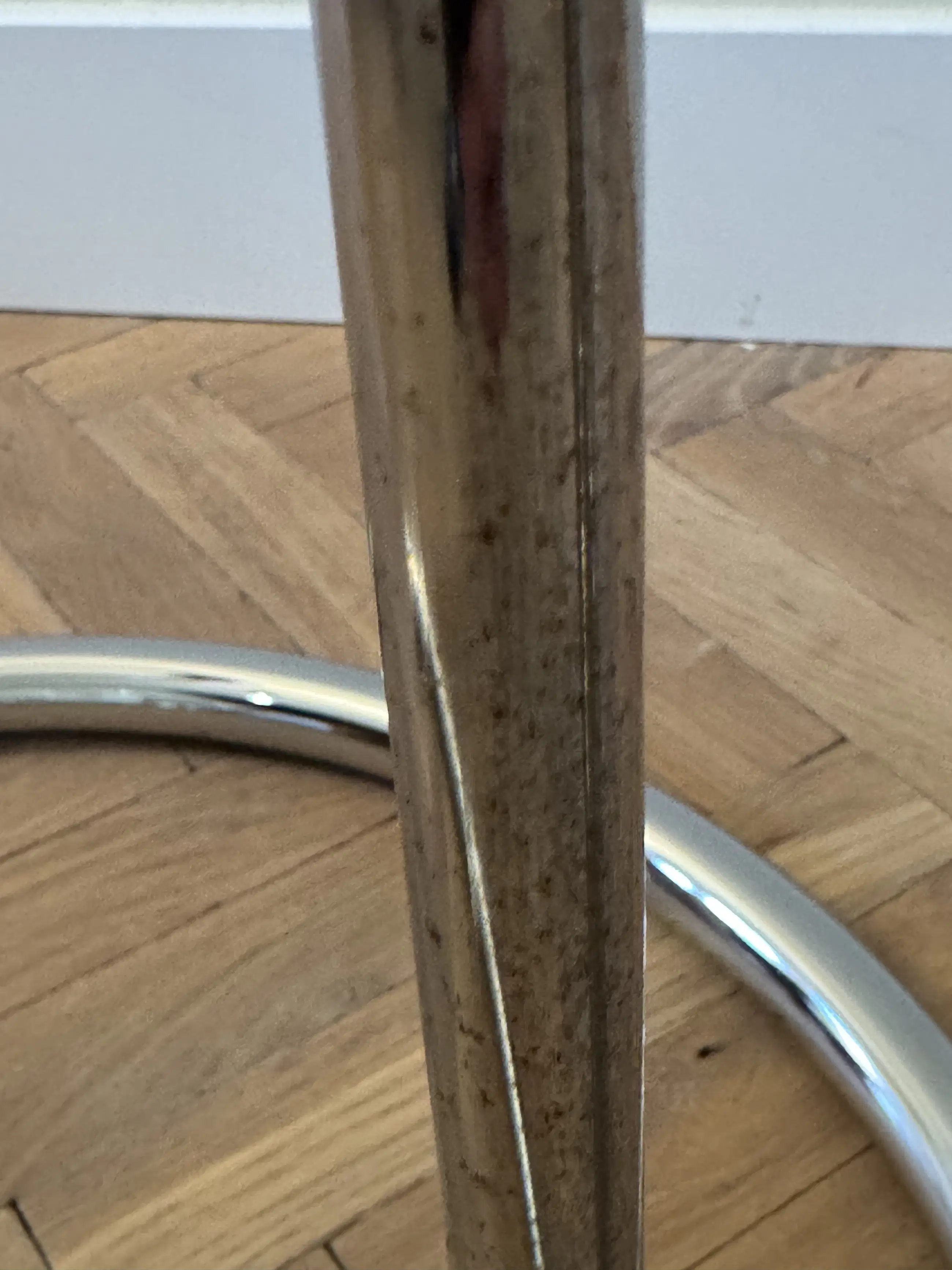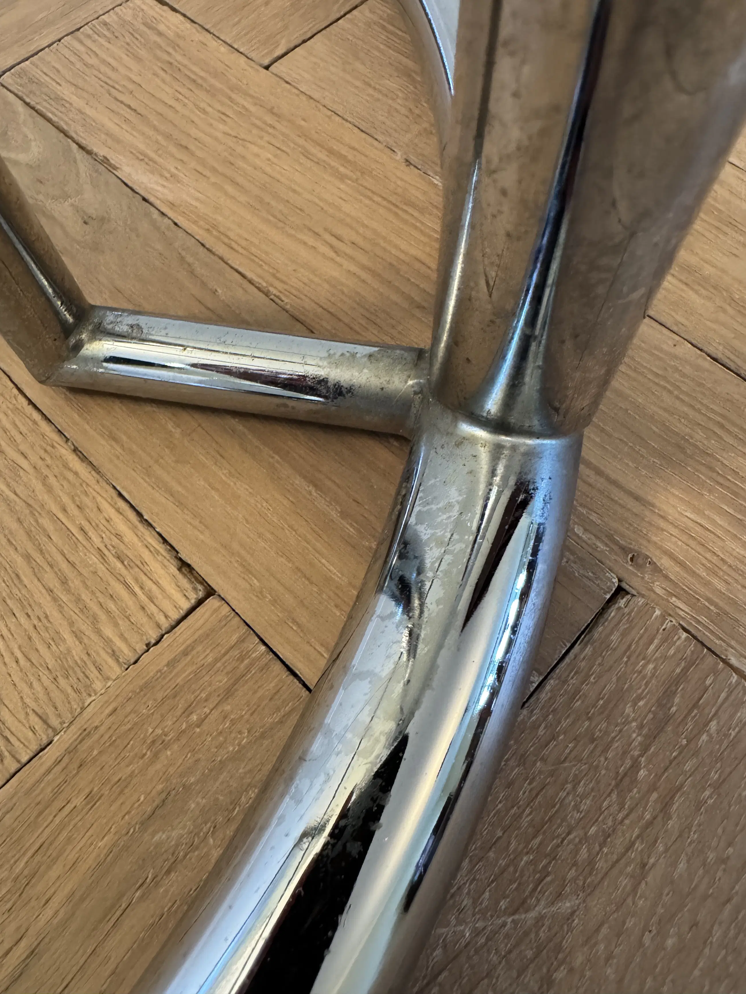 De tafel verkeert in goede vintage staat met zeer lichte gebruikssporen. Het glazen blad is vrijwel krasvrij (geen zichtbare krassen met het blote oog). Aan de binnenzijde van het chroom zijn kleine vlekjes/puntjes zichtbaar, passend bij de leeftijd. Met chroompoets is dit mogelijk verder te verhelpen. Zie alle foto’s voor een compleet beeld – deze maken deel uit van de omschrijving.