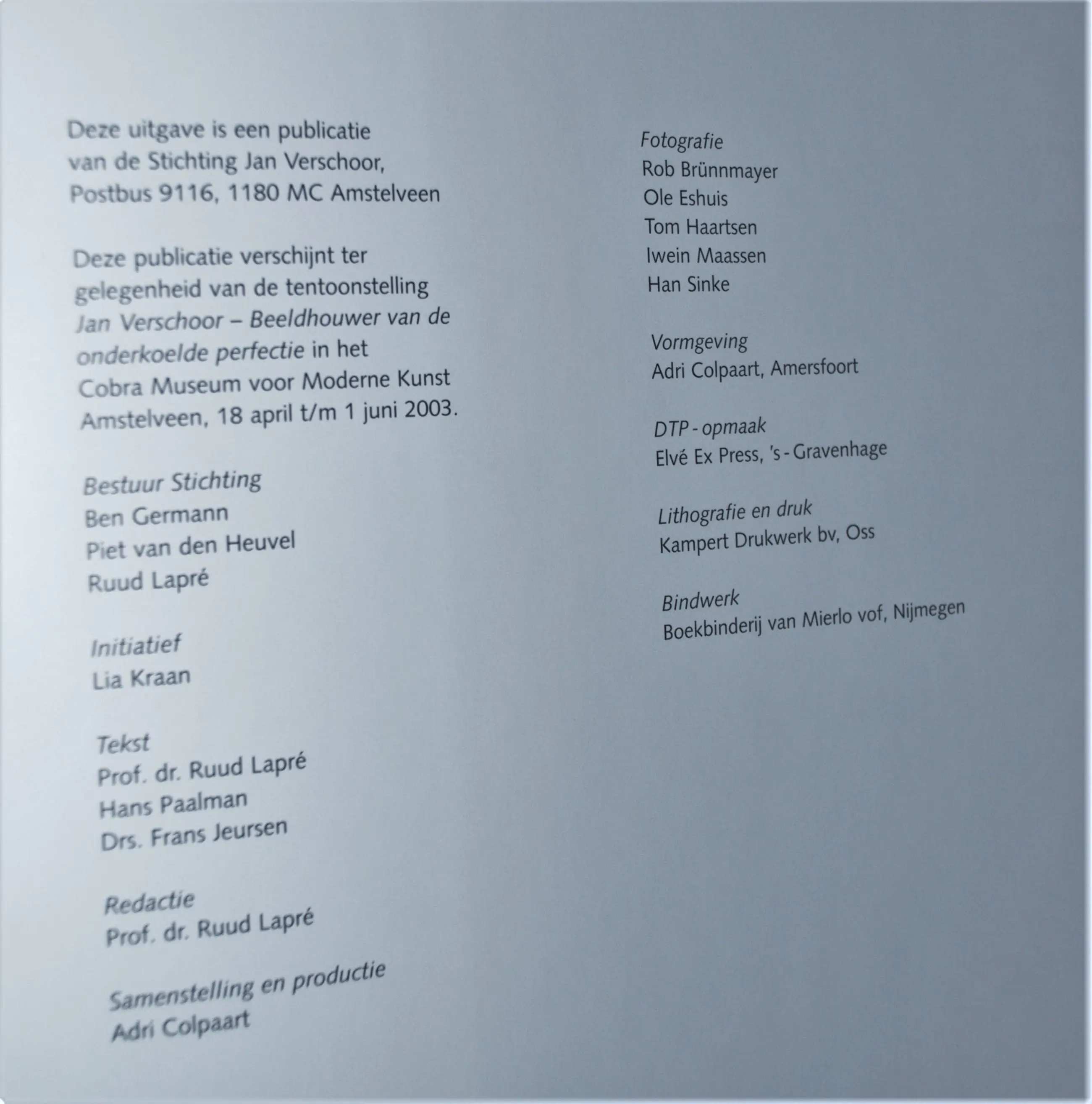 Boekwerk over beeldhouwer Jan Verschoor. Hardcover met omslag. 175 pag. 30x25 cm. In goede gebruikte staat. Gesigneerd.