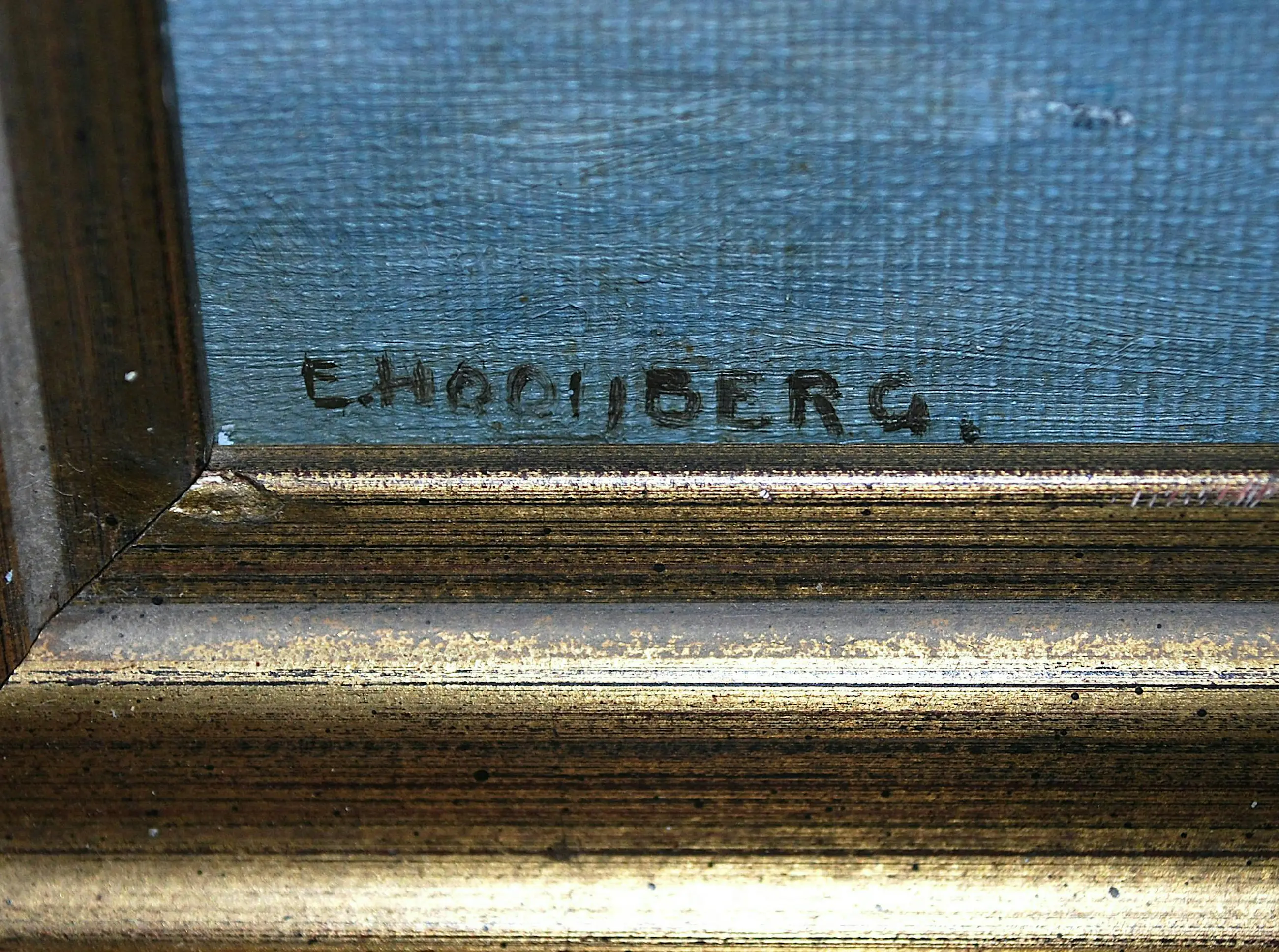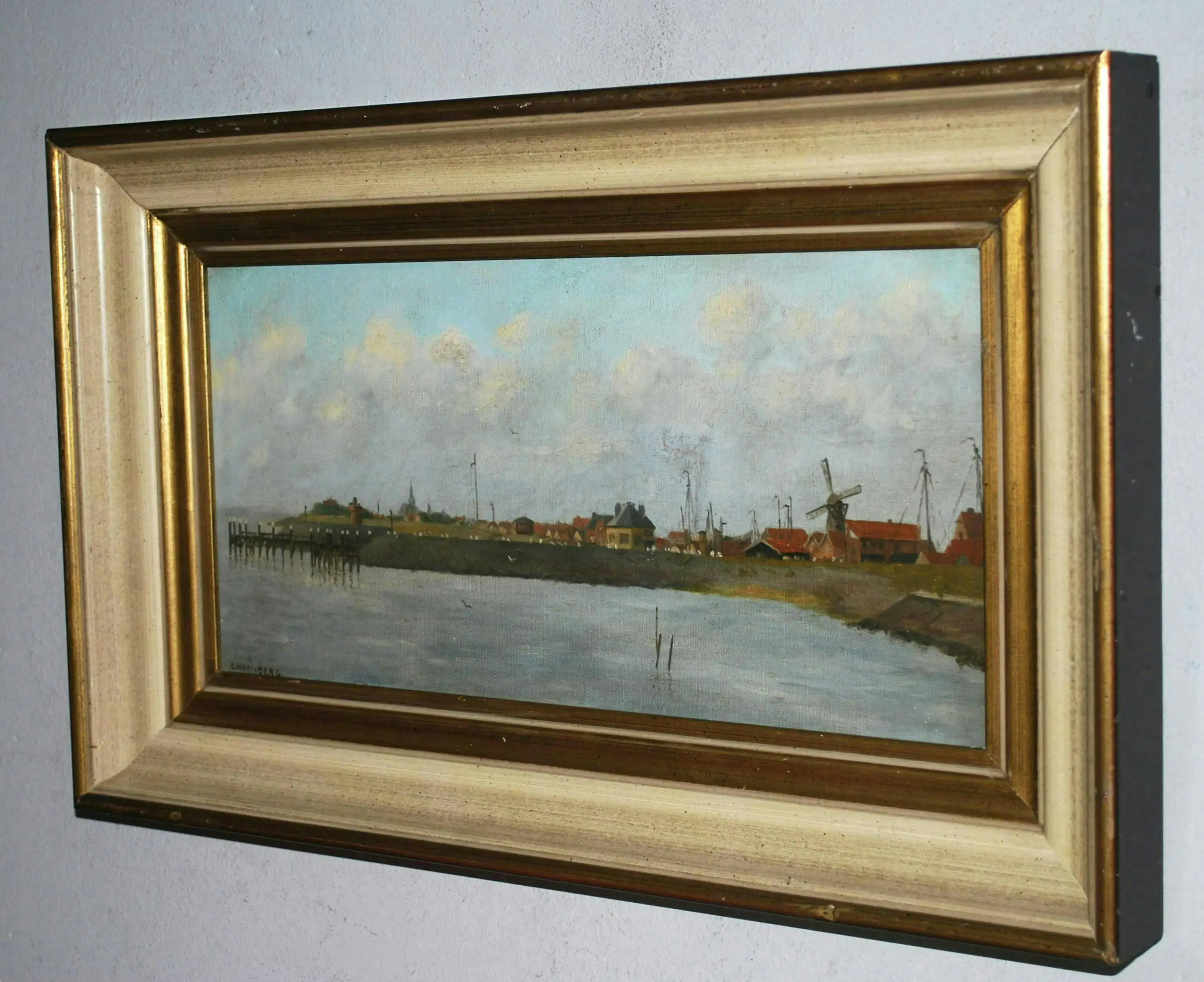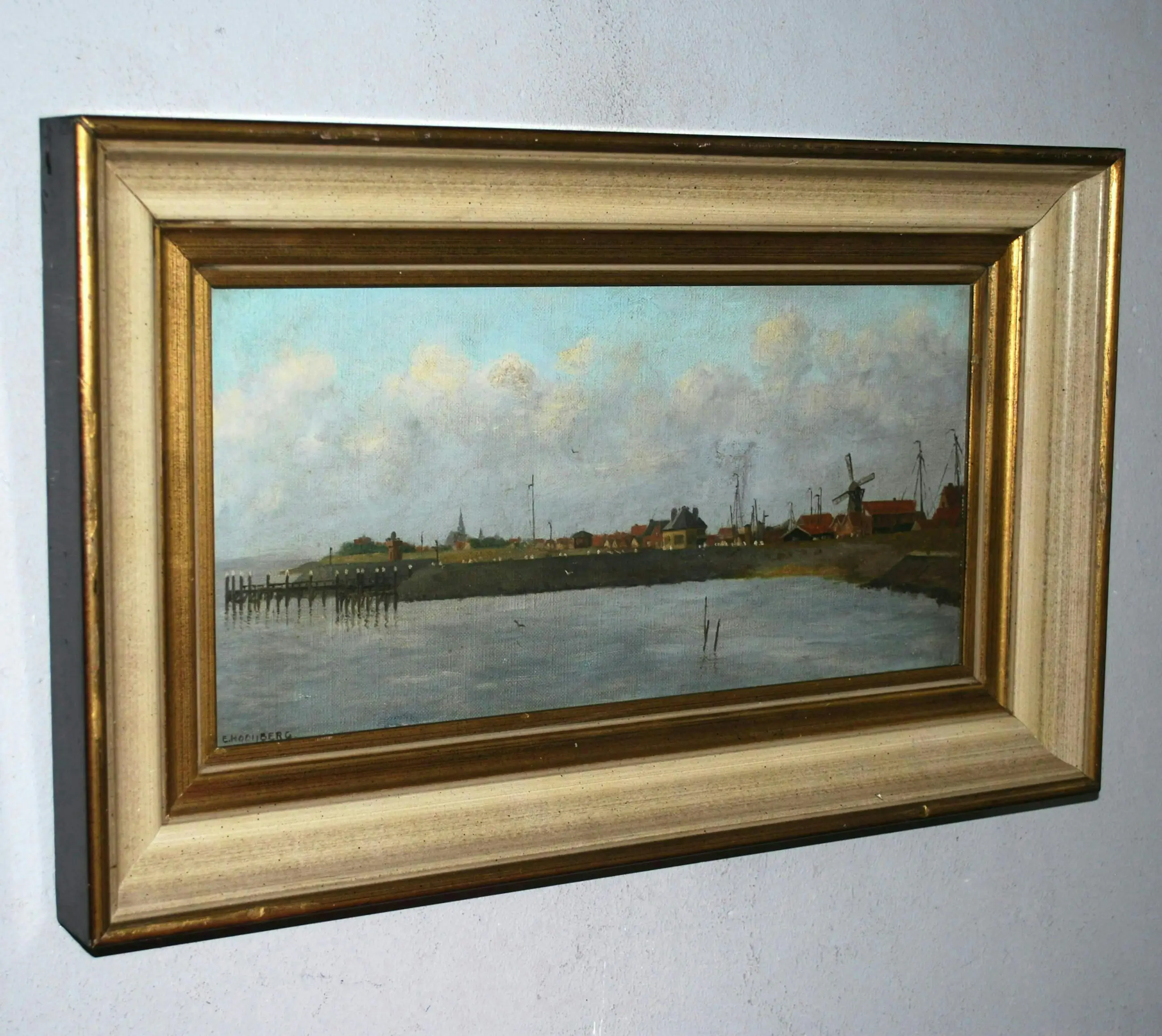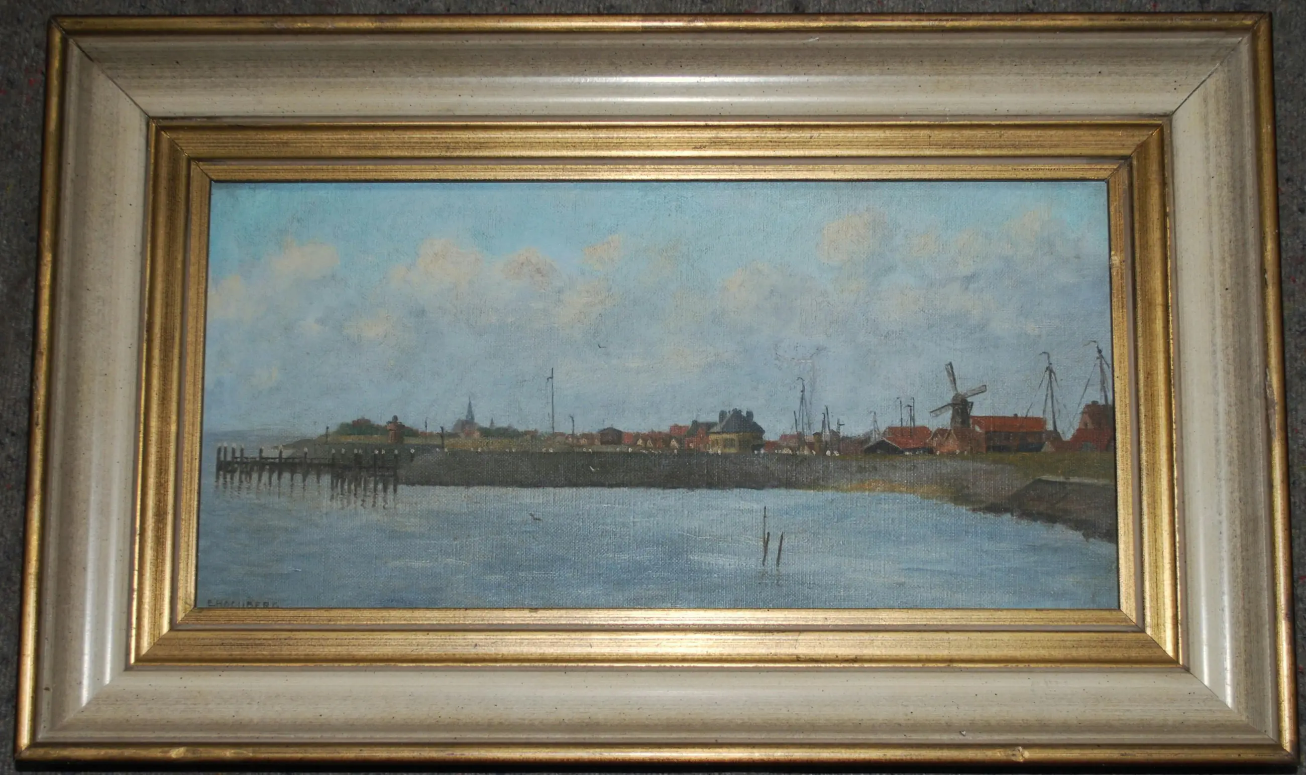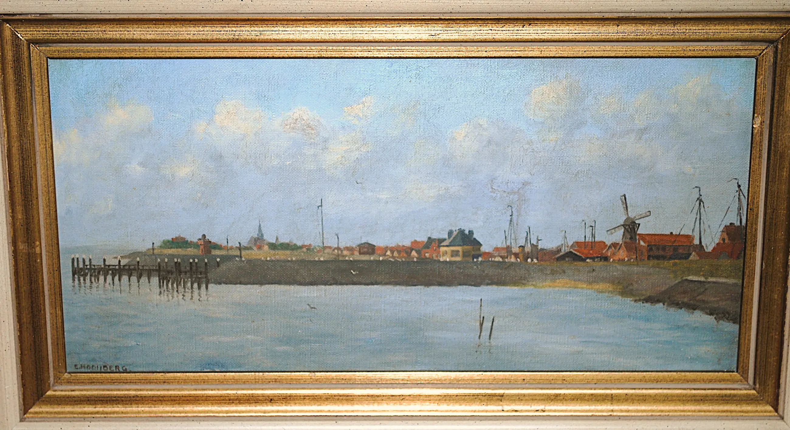 Vroeg werk van Hooijberg. Zou de haven van Oudeschild (Texel) kunnen zijn. Olieverf op doek op spieraam. Het doek heeft op 2 plekken restaureerde scheurtjes. Gesigneerd l.o. In een fraaie houten lijst.