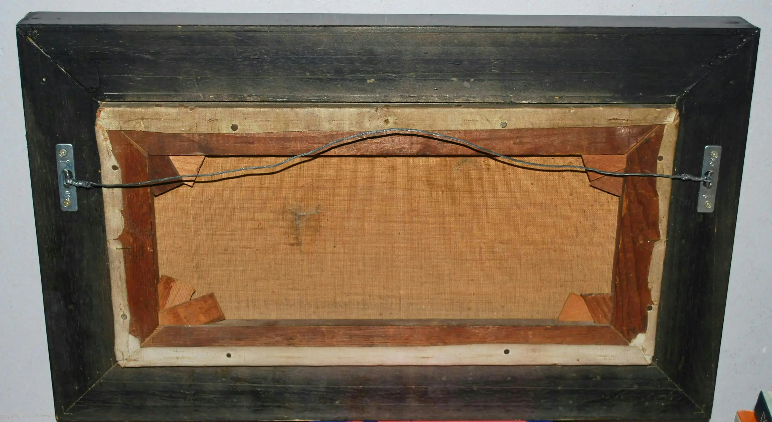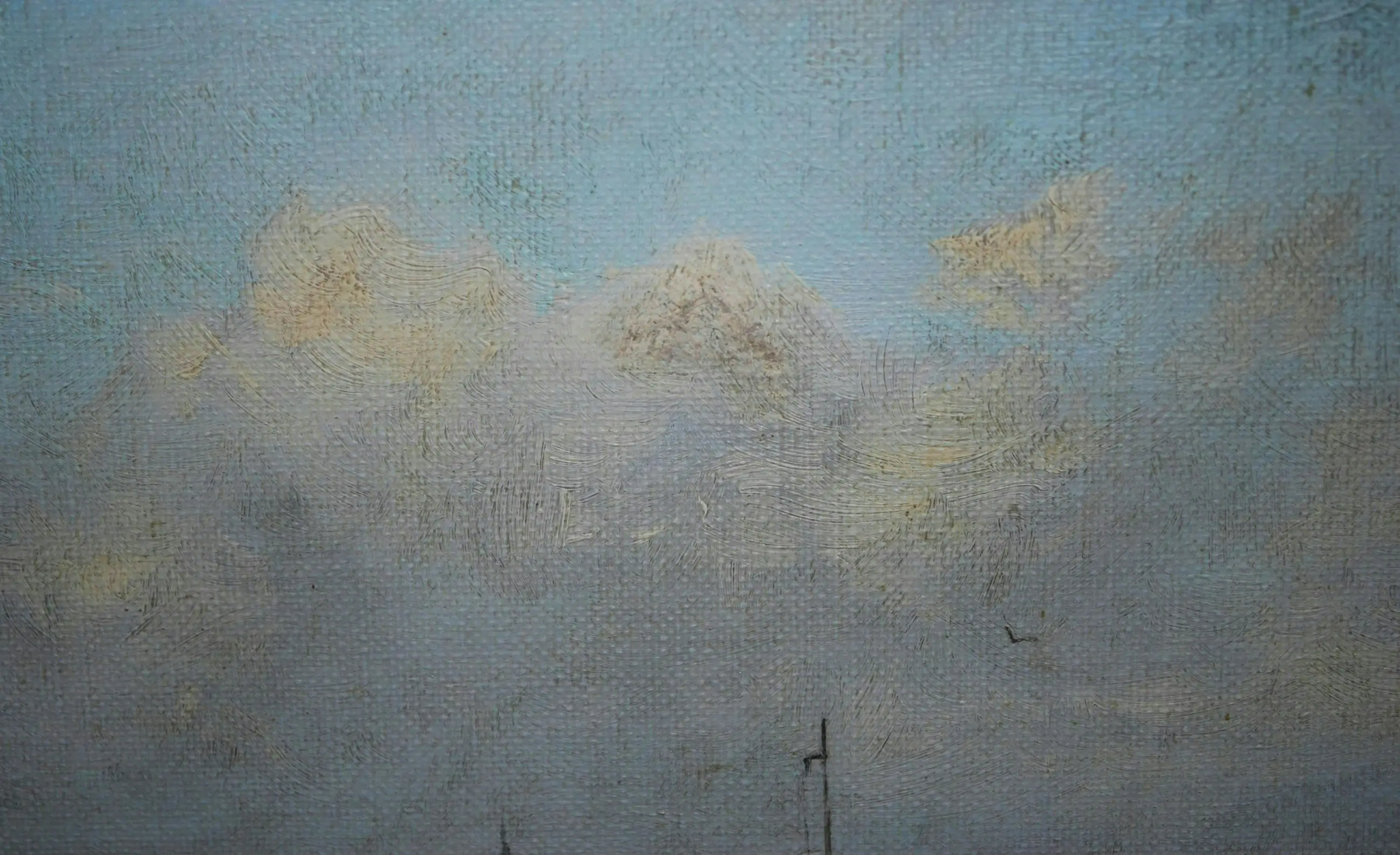 Het doek heeft 2 gerestaureerde scheurtjes , l.b. in de wolken en in het midden achter een mast, in de lucht. Verder in goede gebruikte staat, wat randschade/4 gaatjes in de hoeken (het doek zal plein-air zijn geschilderd)