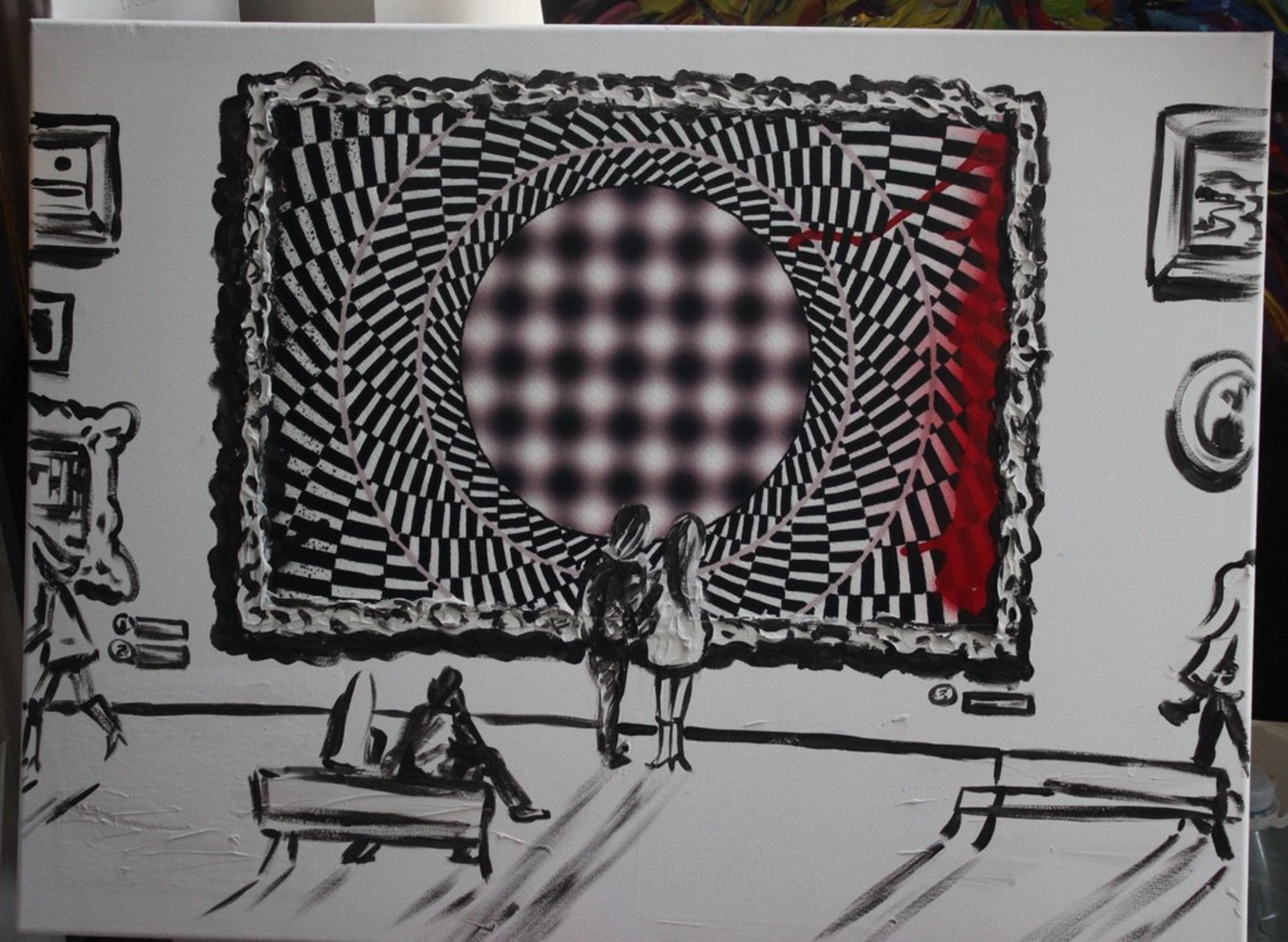 Acrylverf en prent op doek.