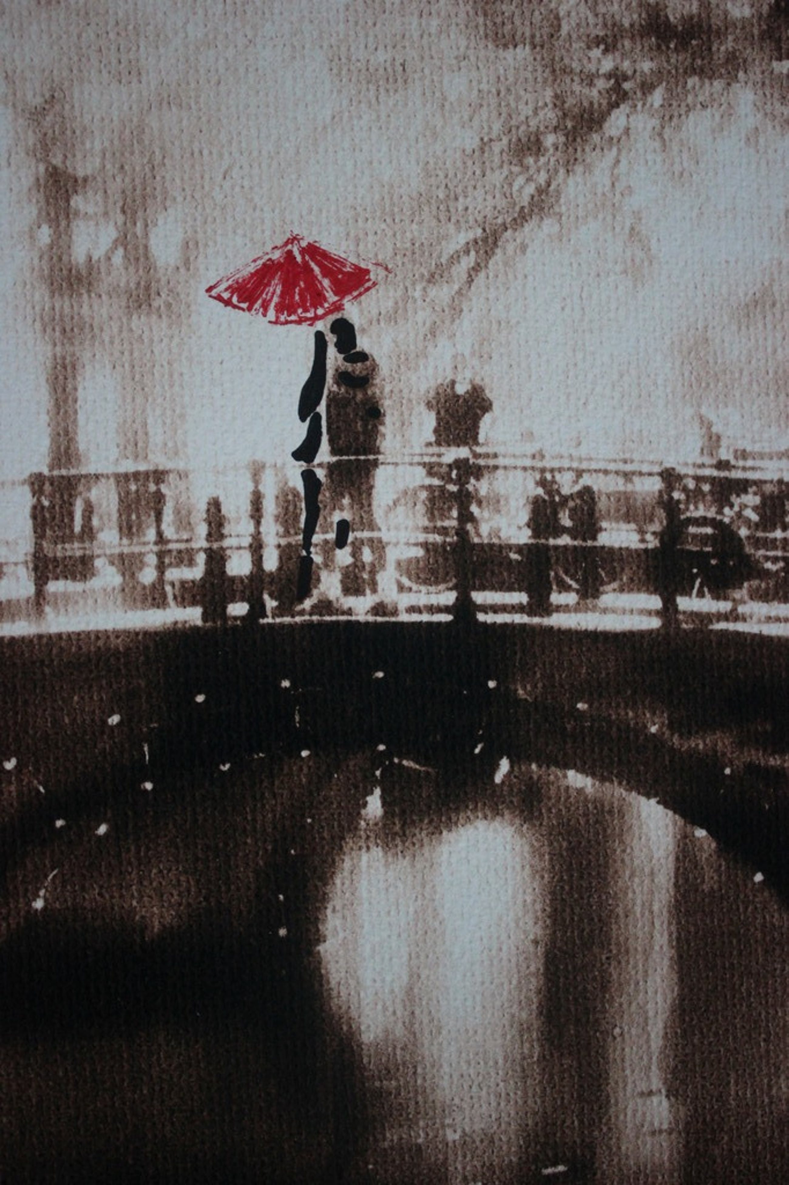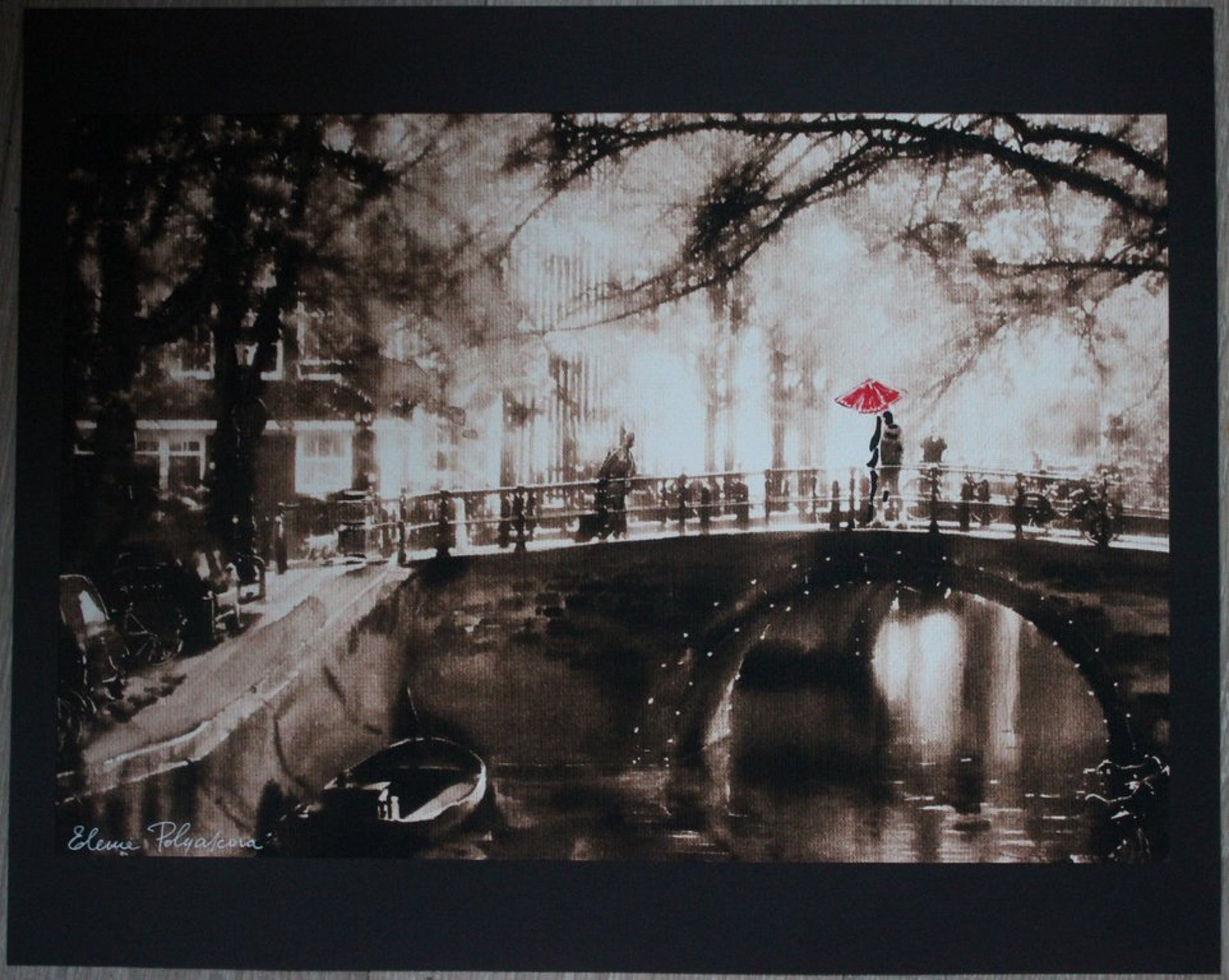 Gemengde techniek (inkt, aquarelverf, acrylverf) op druk op karton.