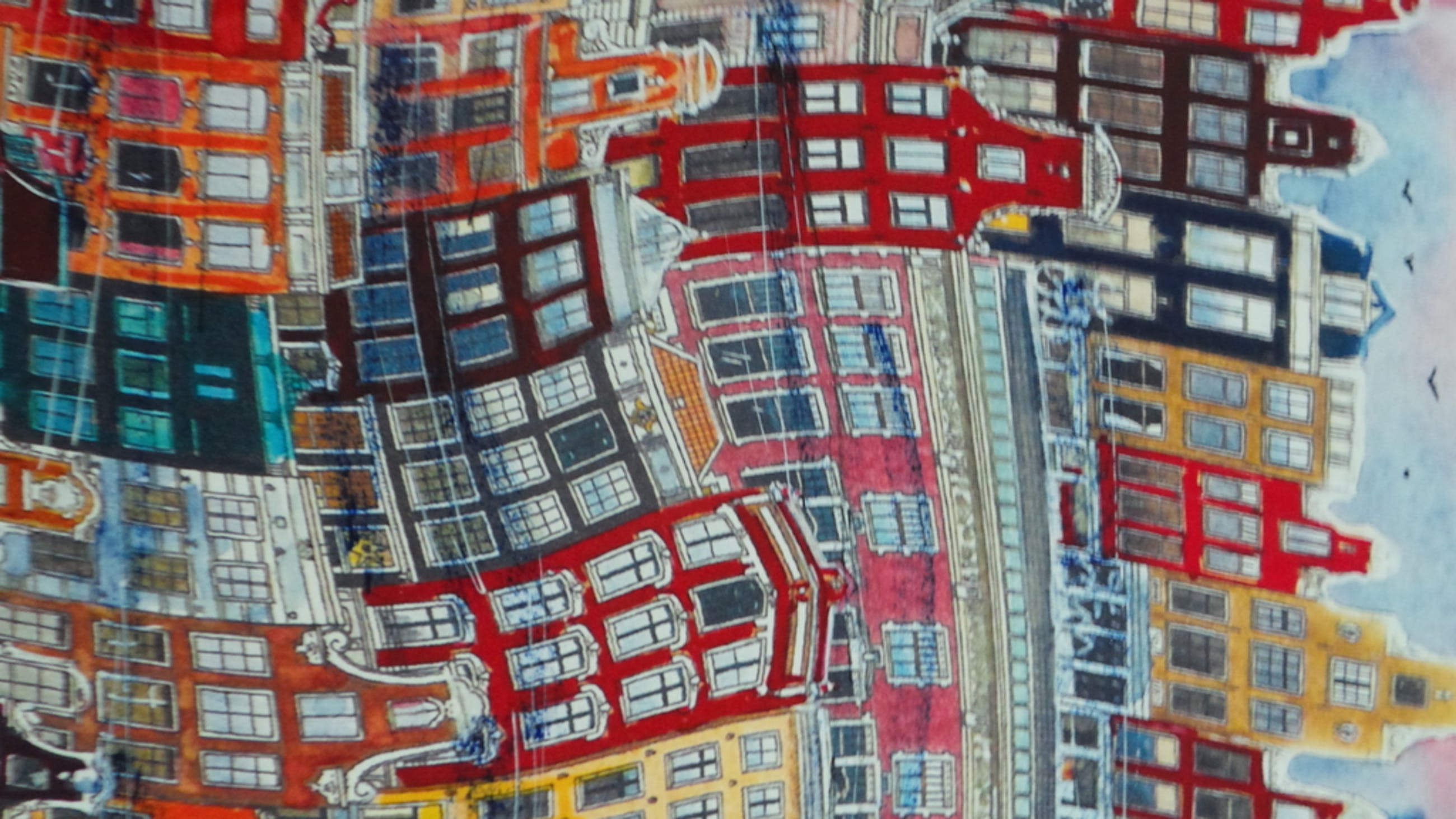 Gemengde techniek (inkt, aquarelverf, acrylverf) over druk op papier.