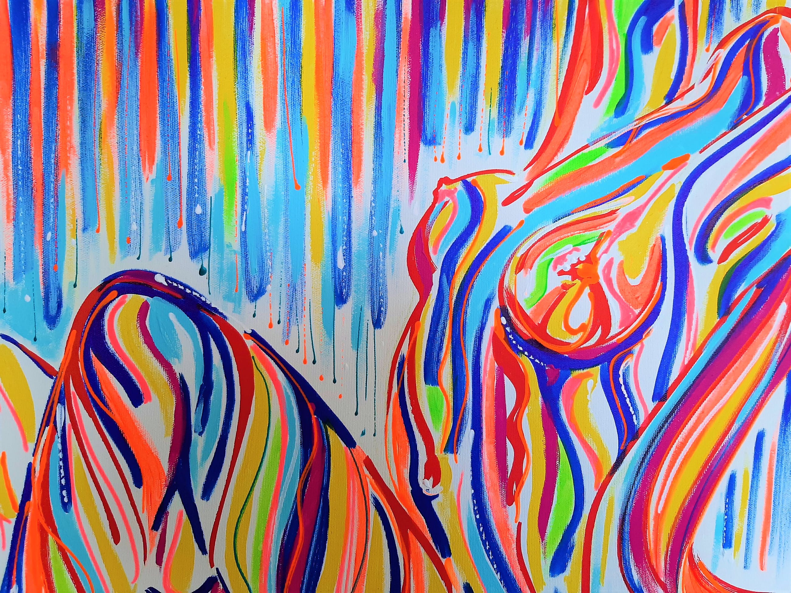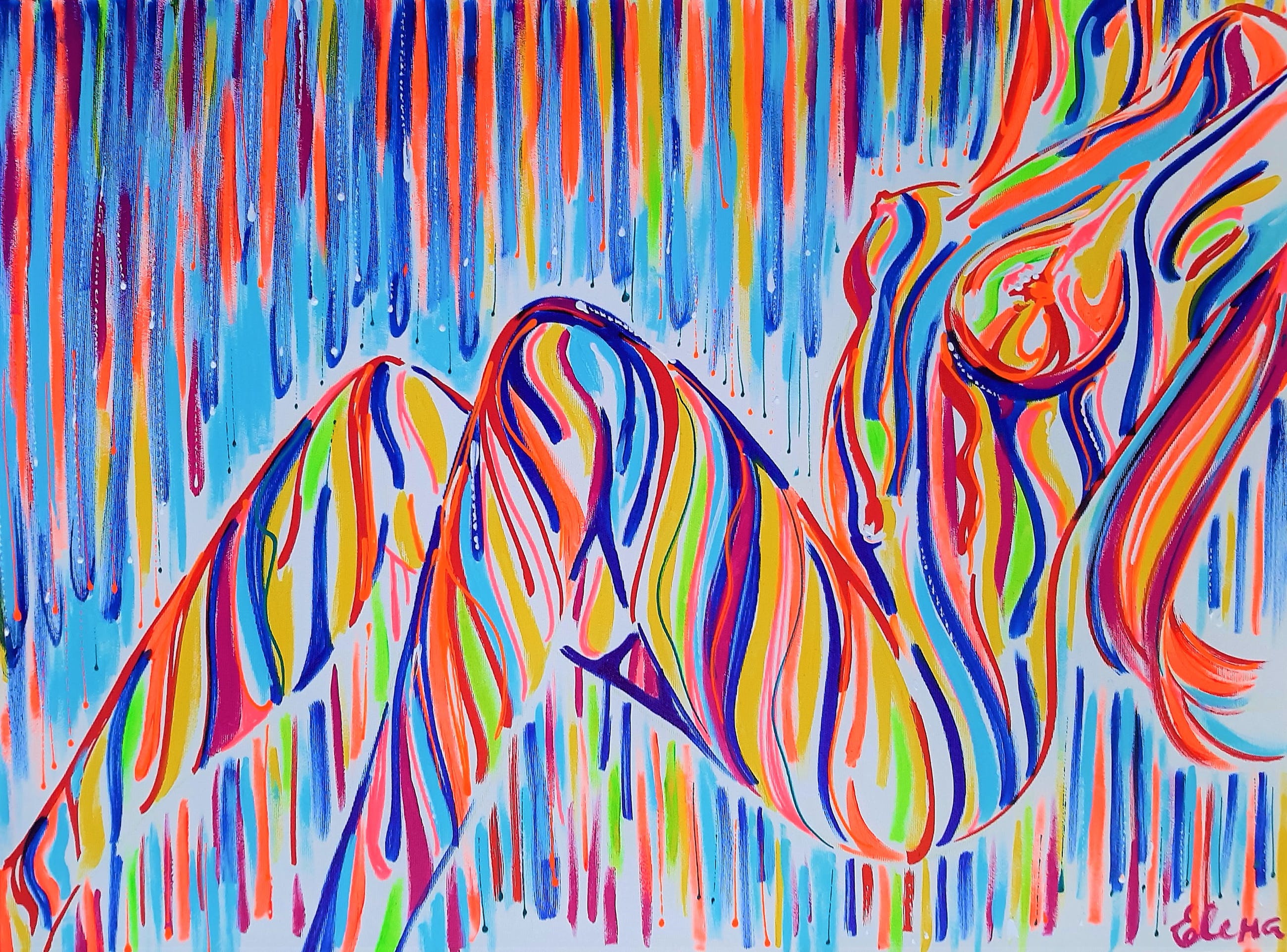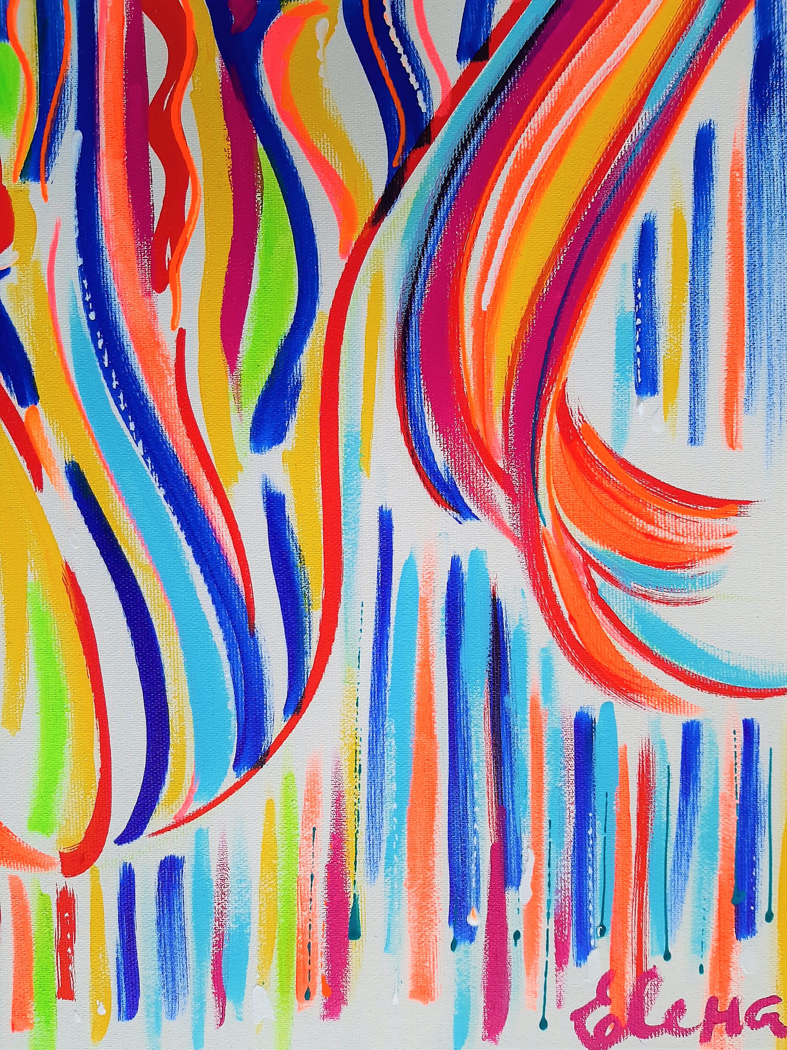 Elena Polyakova-Elva maakt schilderijen die rijk zijn aan energie en vitale sensualiteit. Elena werkt met een messchildertechniek en borstelt ook, waardoor ze deze explosieve beelden kan maken. Het werk laat een volledige bewegingsvrijheid toe en de resulterende kunst is expressief en uniek. De kunstenaar toont een voorliefde voor schitterende, dynamische schilderijen die een invloed van de sfeer en de intensiteit van de kleuren die zo kenmerkend zijn voor zijn beeld, laten zien. Elena leeft voor kleuren. Certificaat van echtheid zit erbij. Conditie: in nieuwstaat uit eigen atelier.