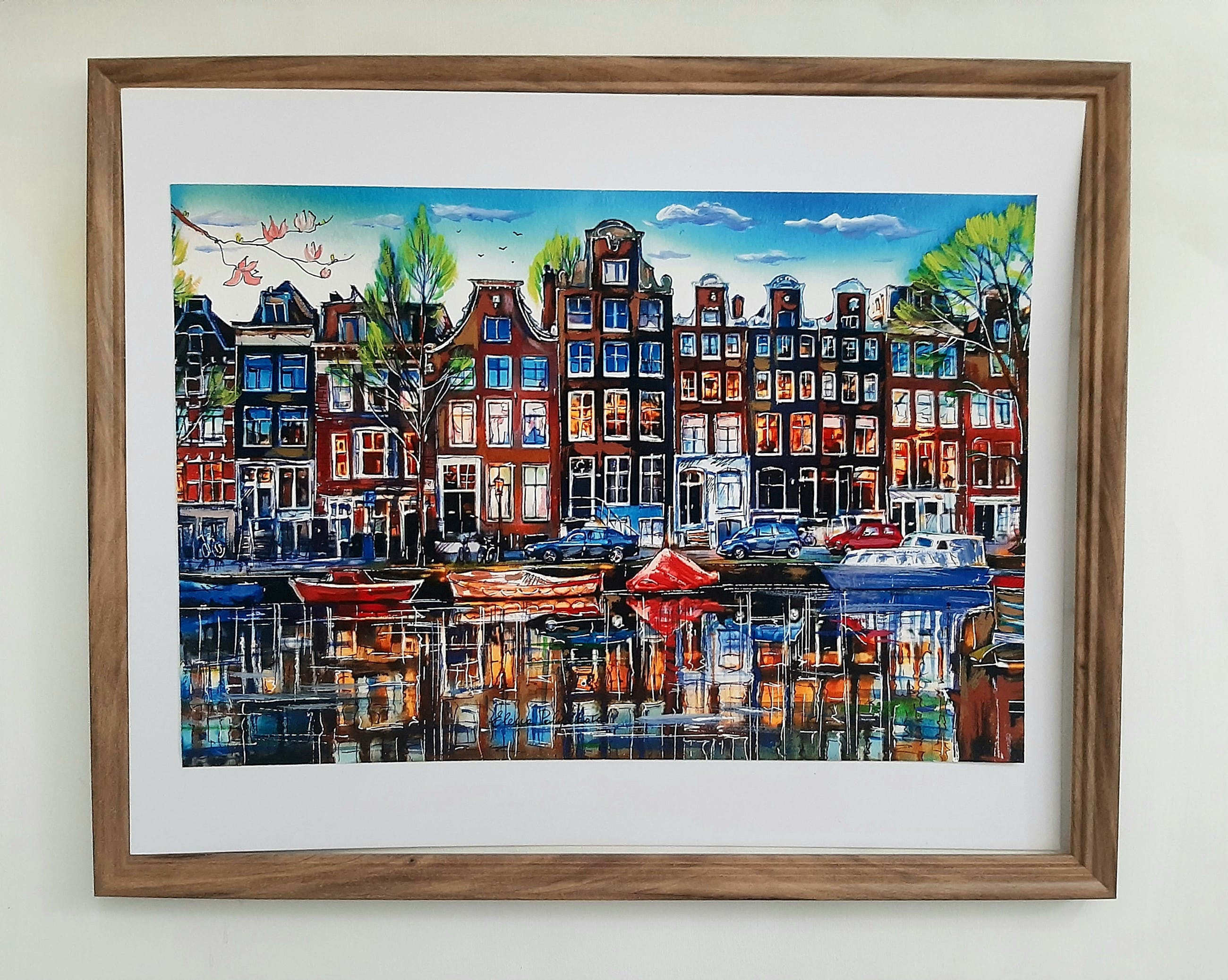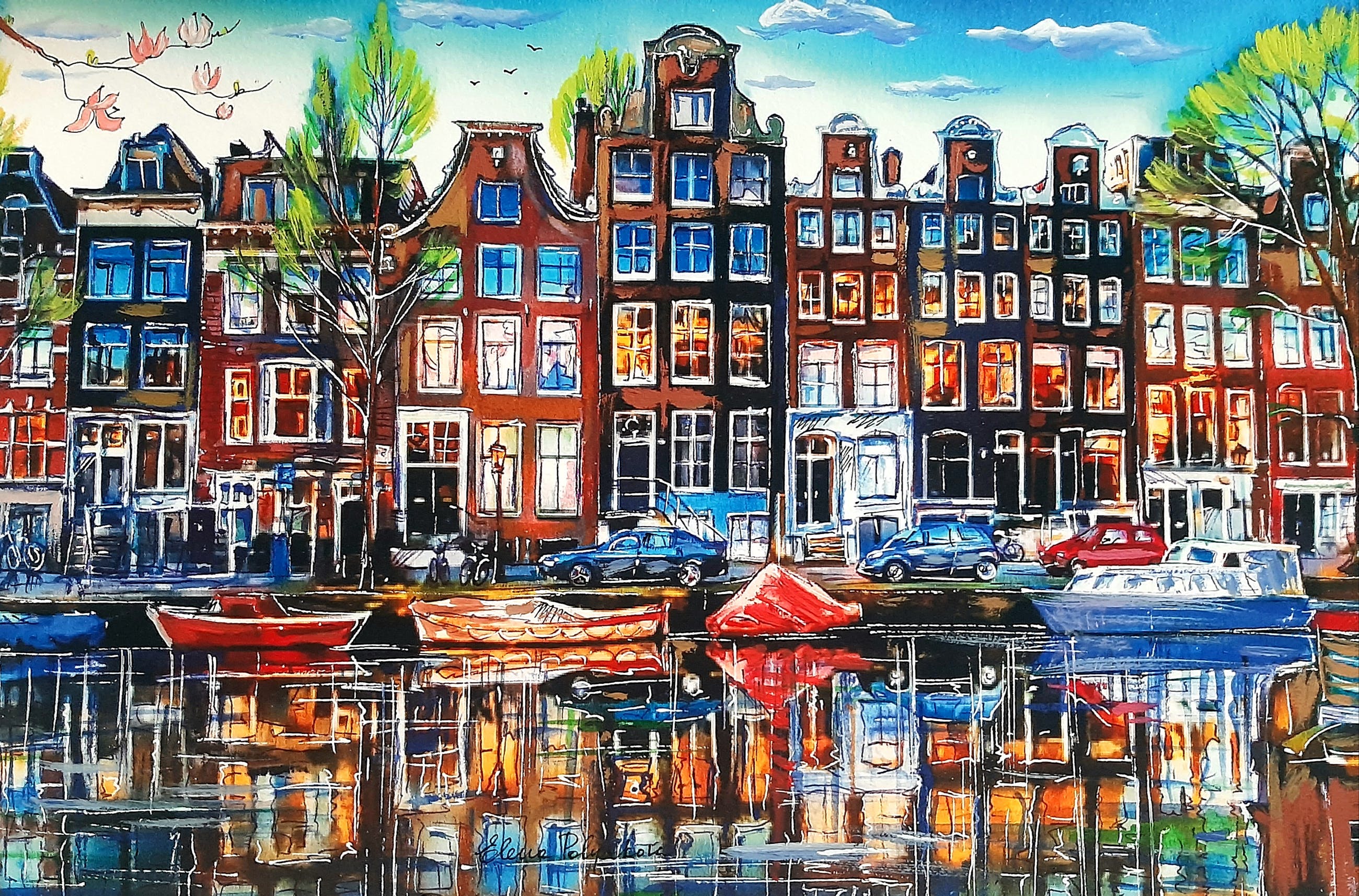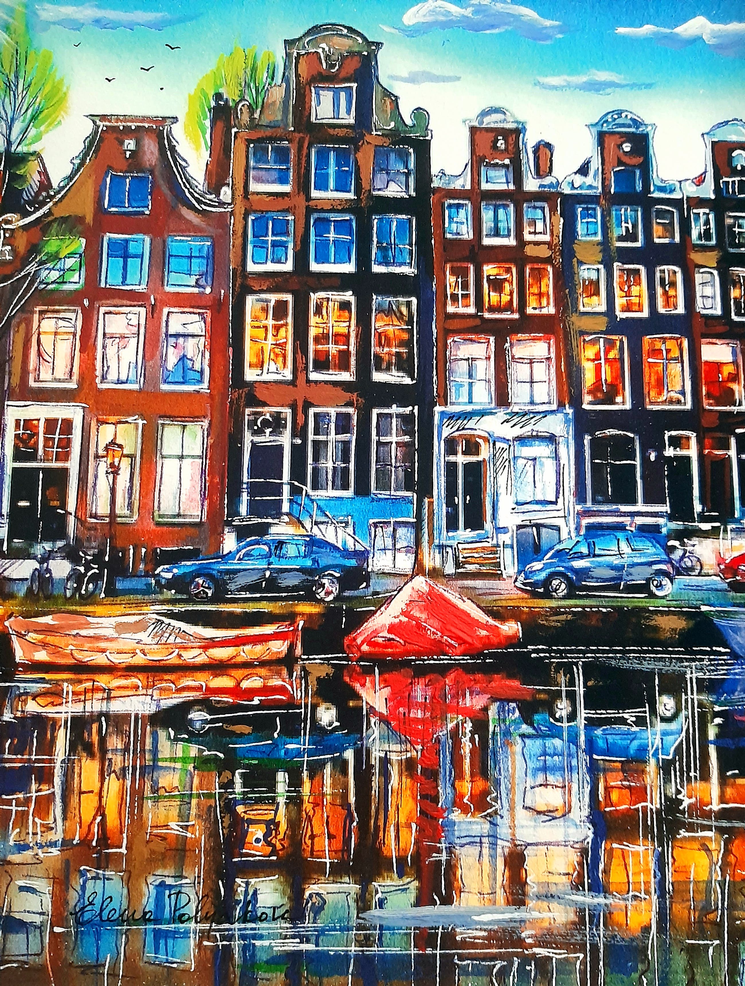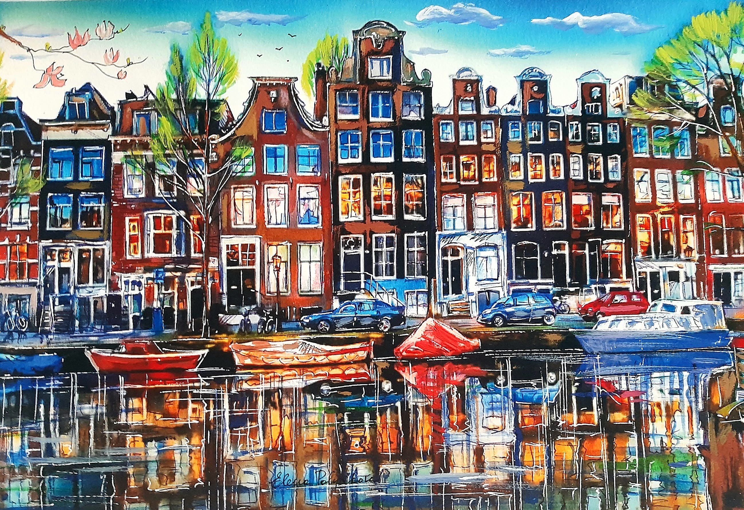 Acrylverf en inkt over giclee op papier - Uniek werk van kunstenaar Elena Polyakova. De kunstenaar zoekt de emotie van licht en beweging. Techniek op grens expressieve en impressionistische schilderijen, met zijn eigen unieke stijl. Certificaat van echtheid is inbegrepen.