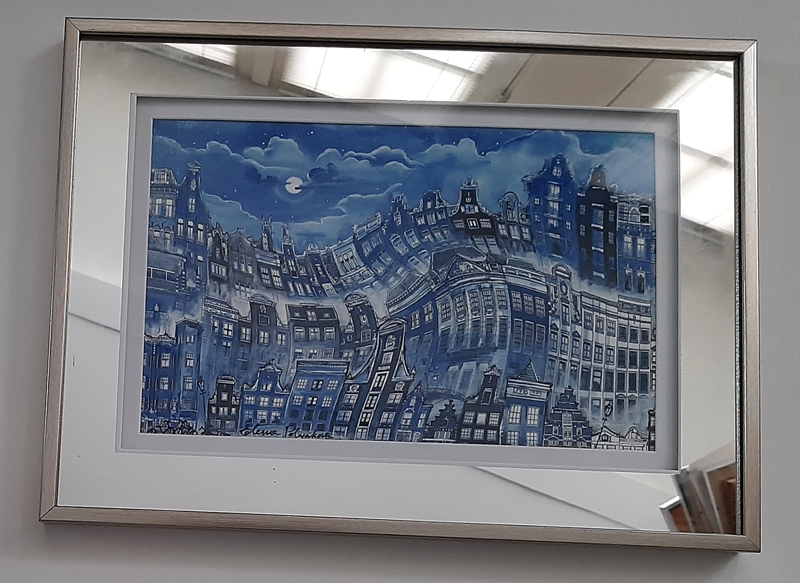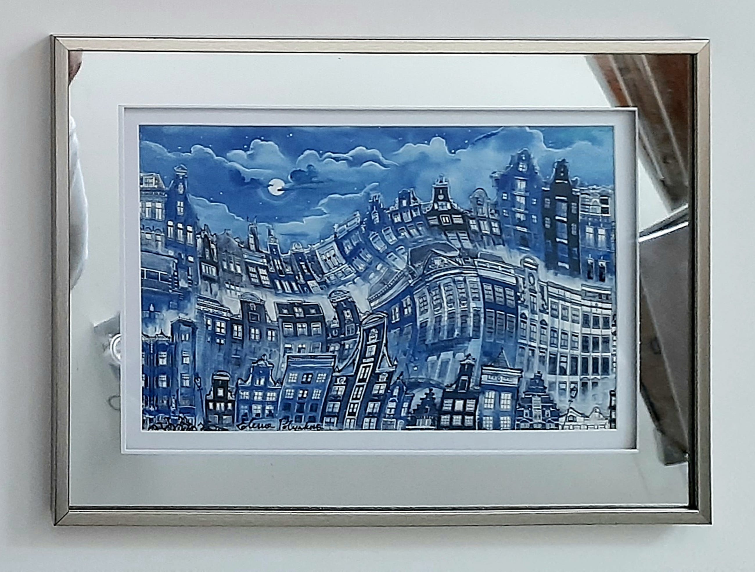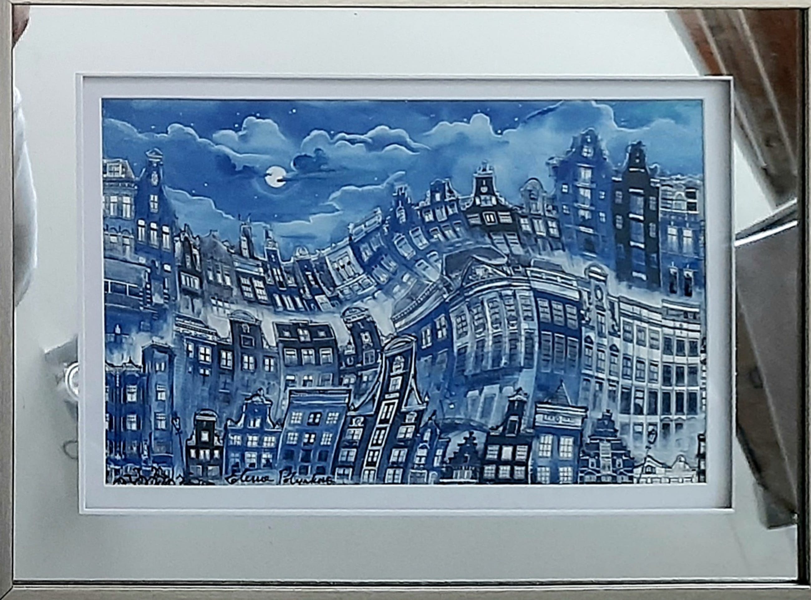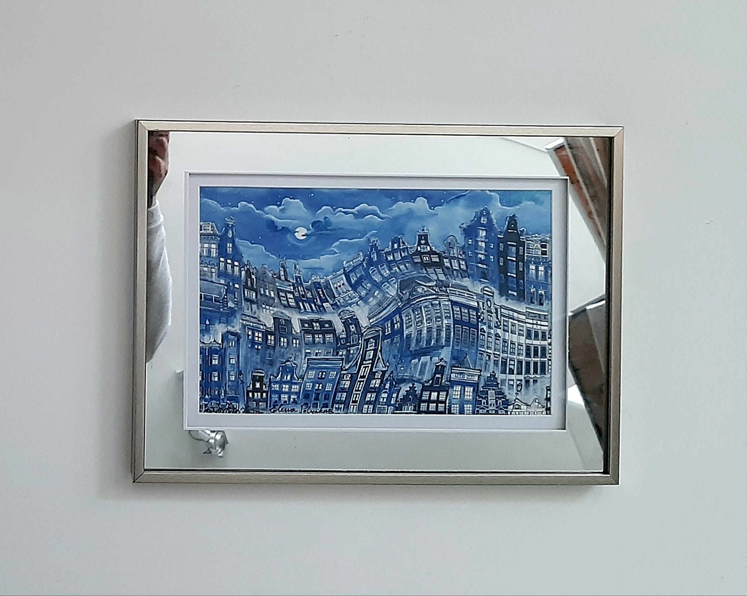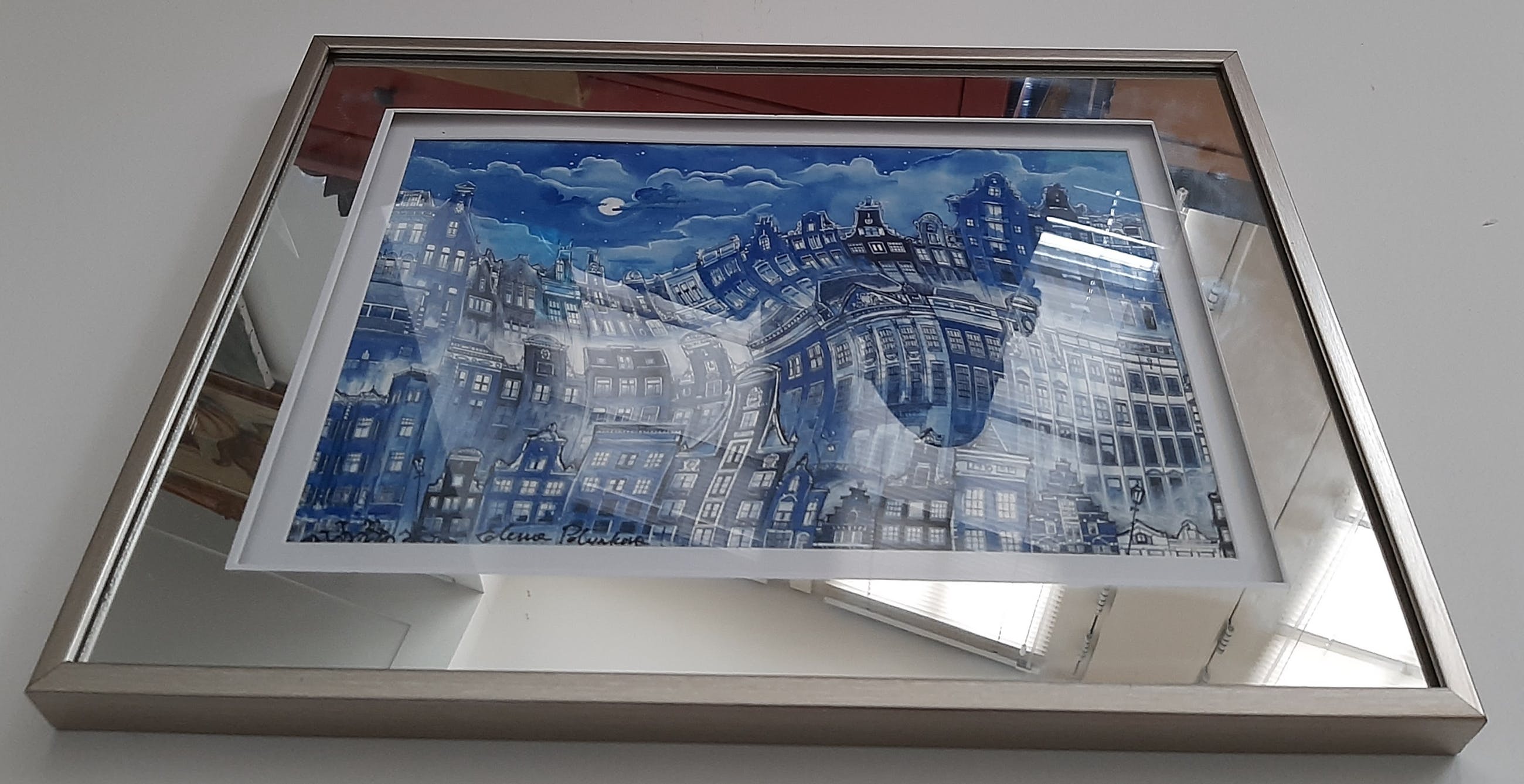 Gemengde techniek over giclee, met olieverf op papier, origineel. Ingelijst in 3D-paspartoe met spiegeleffect.