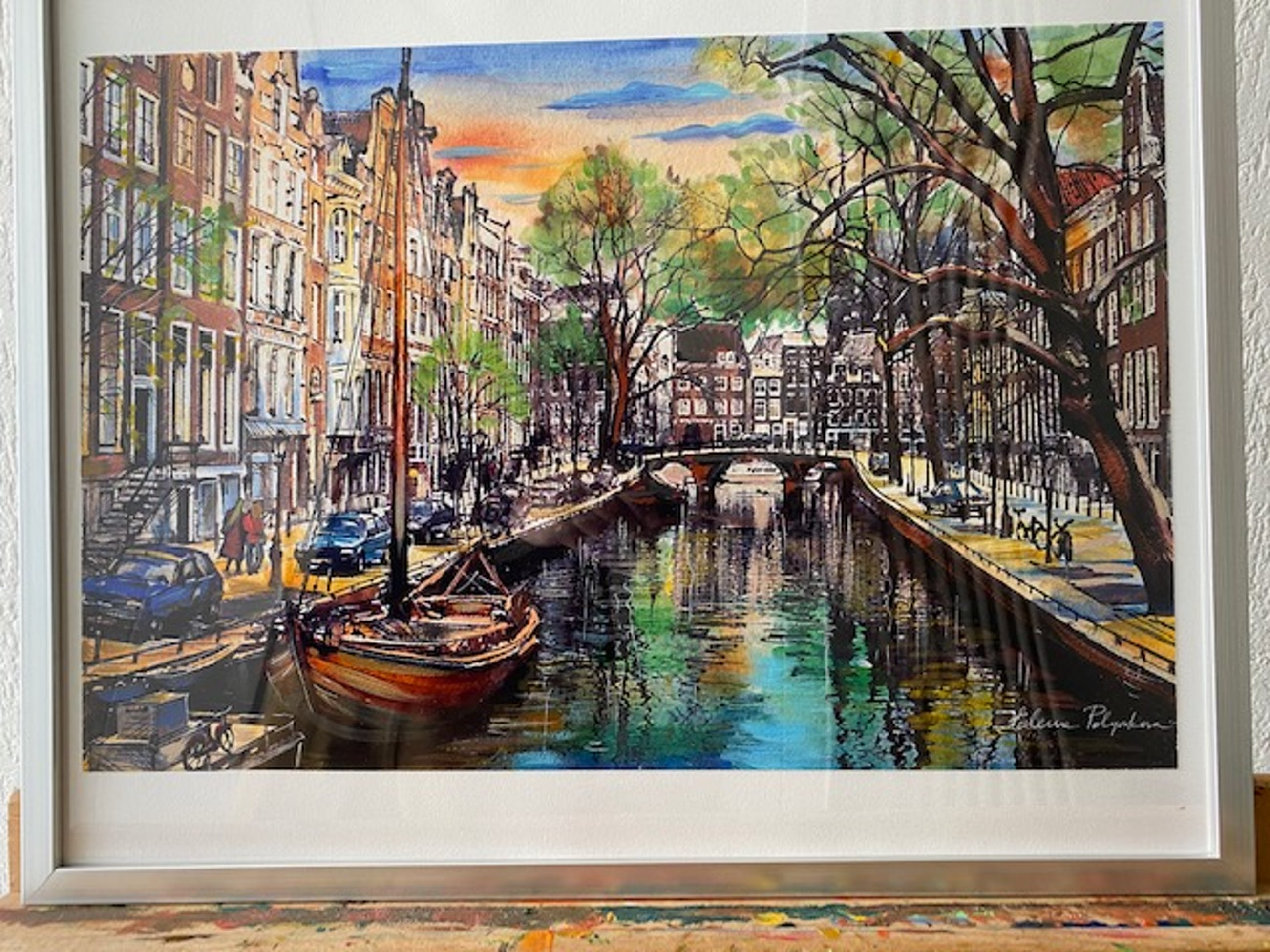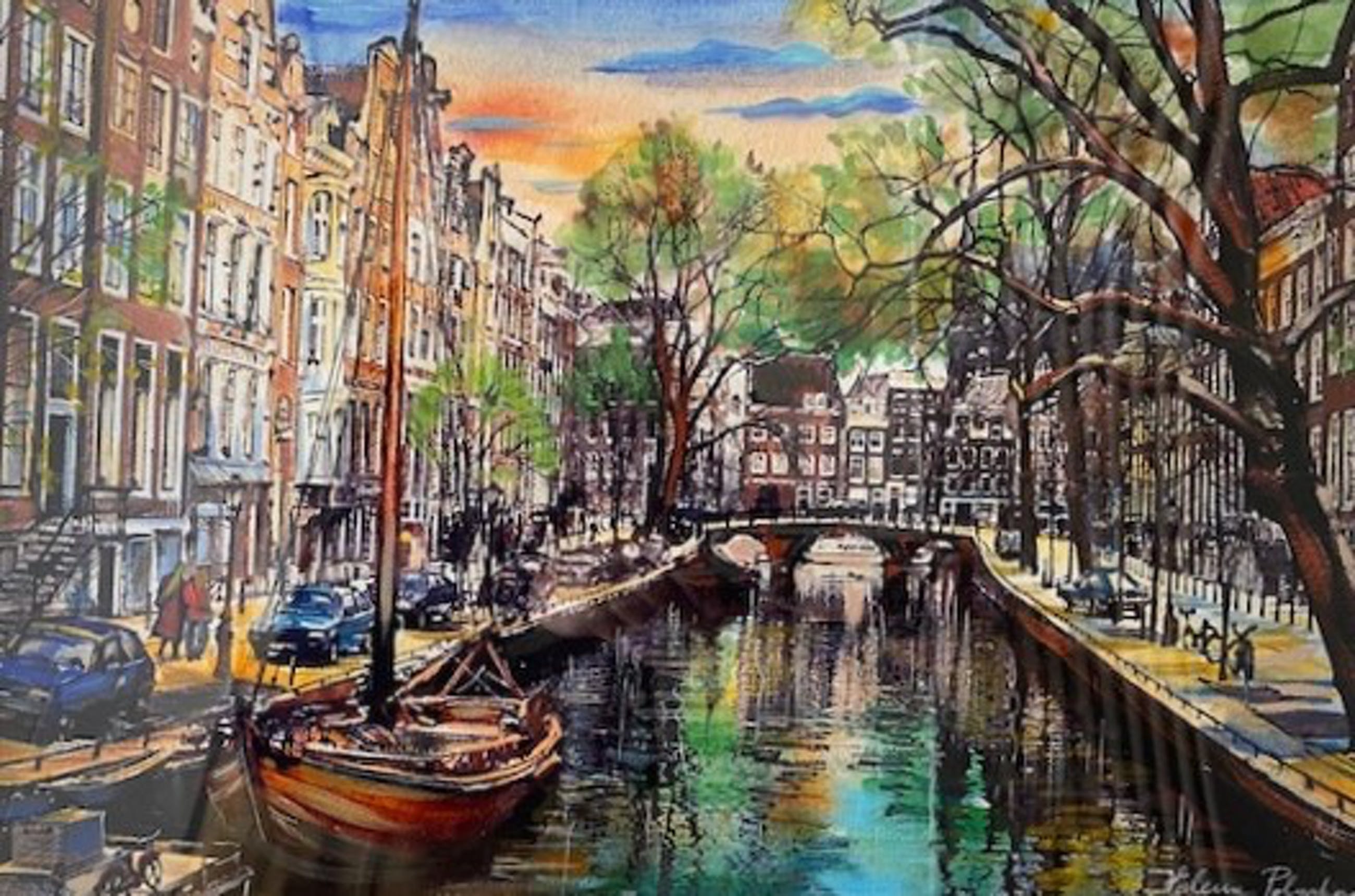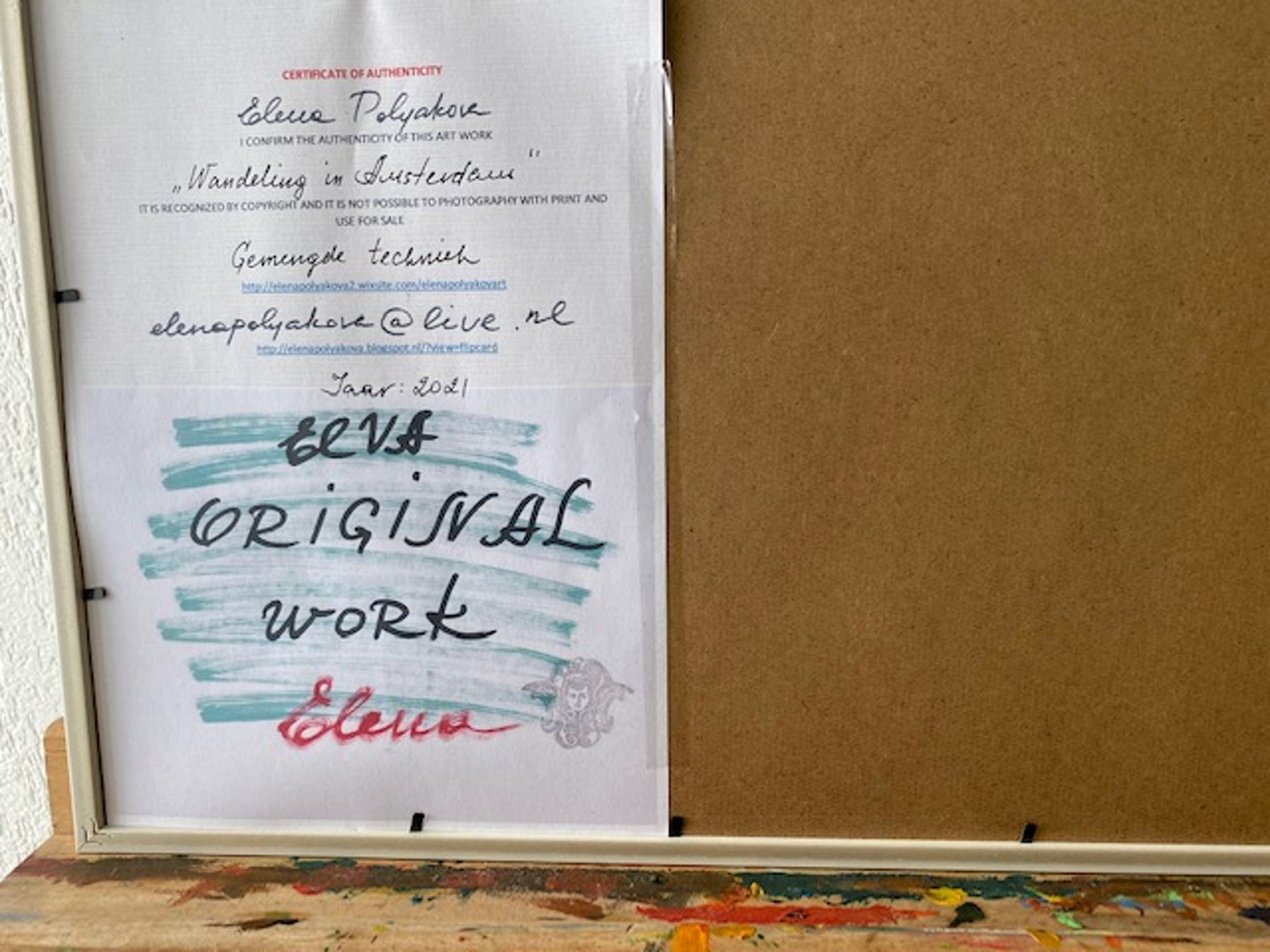 Elena Polyakova (Rusland) is geboren en heeft haar kunstopleiding genoten in Sint Petersburg alvorens zich enkele jaren geleden in Amsterdam te vestigen als zelfstandig kunstenaar. Ze laat zich graag inspireren door de karakteristieken van de Nederlandse hoofdstad, zowel door de stedenbouw en architectuur alsook door het alledaagse leven. Ze legt de taferelen vast in een sfeer waarbij ze de grenzen tussen expressie en impressie opzoekt. Echter altijd vrolijk en kleurrijk en met een knipoog naar de realiteit. Haar werken zijn uniek en door de fraaie lichttonen zeer herkenbaar. Certificaat van echtheid aanwezig!