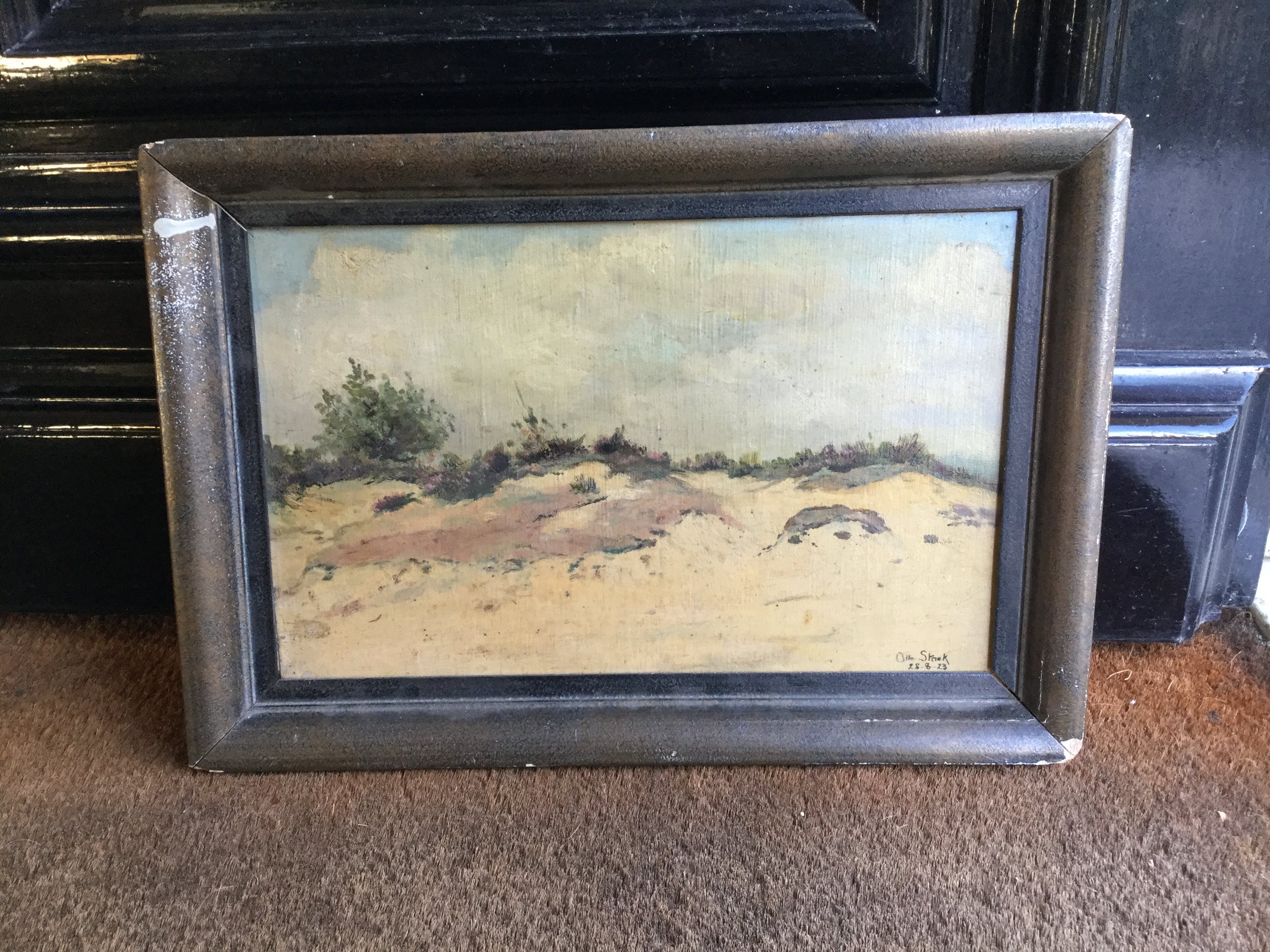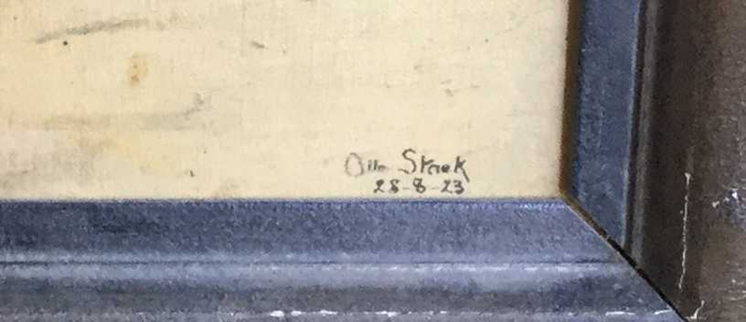 | Vernis vergeeld, oppervlaktevuil, lijst bevat oppervlaktevuil, een verfvlekje, slijtschade door de tijd. | |