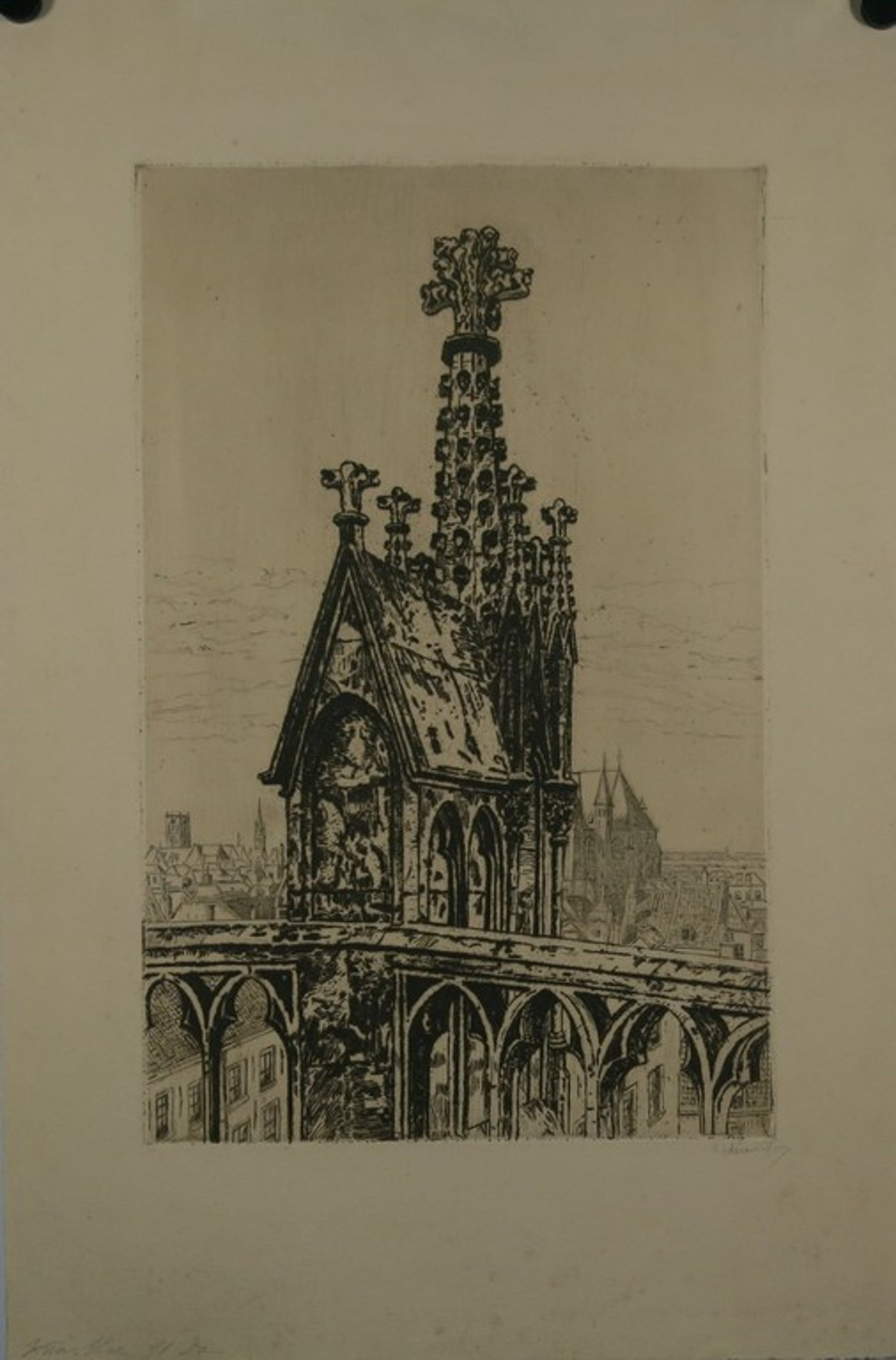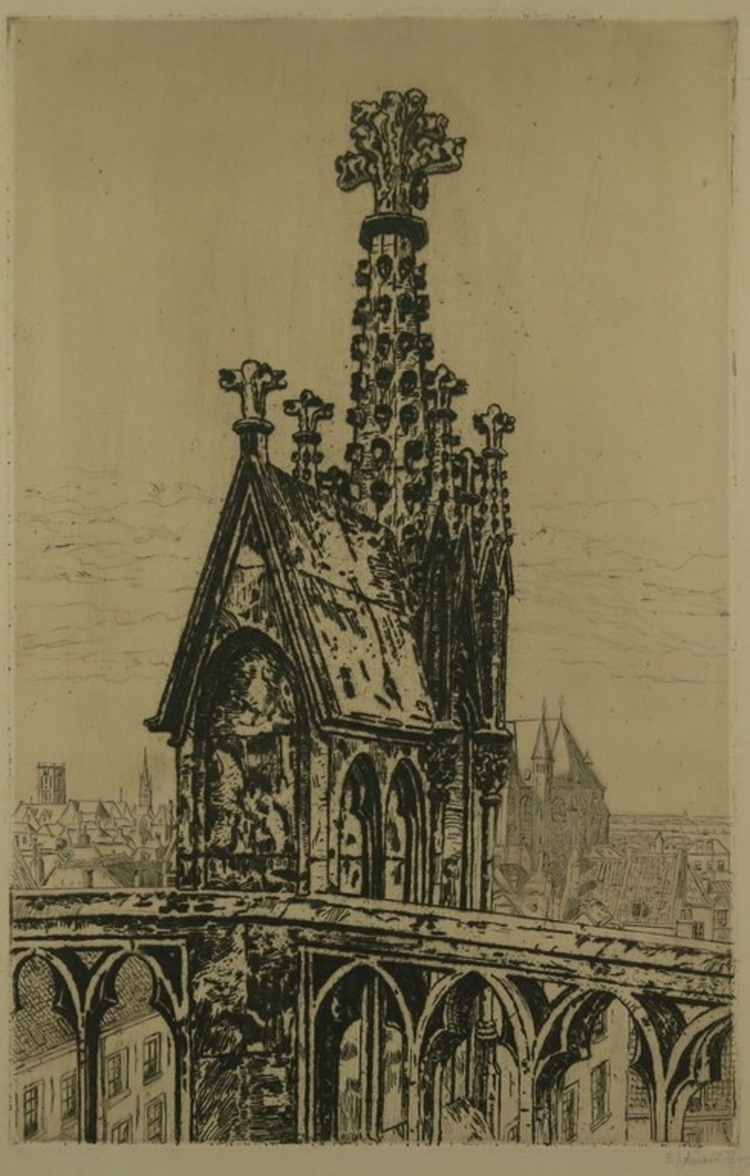 Conditie: Beeld in goede staat, maar het blad is egaal vergeeld, heeft wat (oxidatie)vlekjes en vouwlijntjes buiten het beeld. Ingelijst met passe-partout nauwelijks zichtbaar.