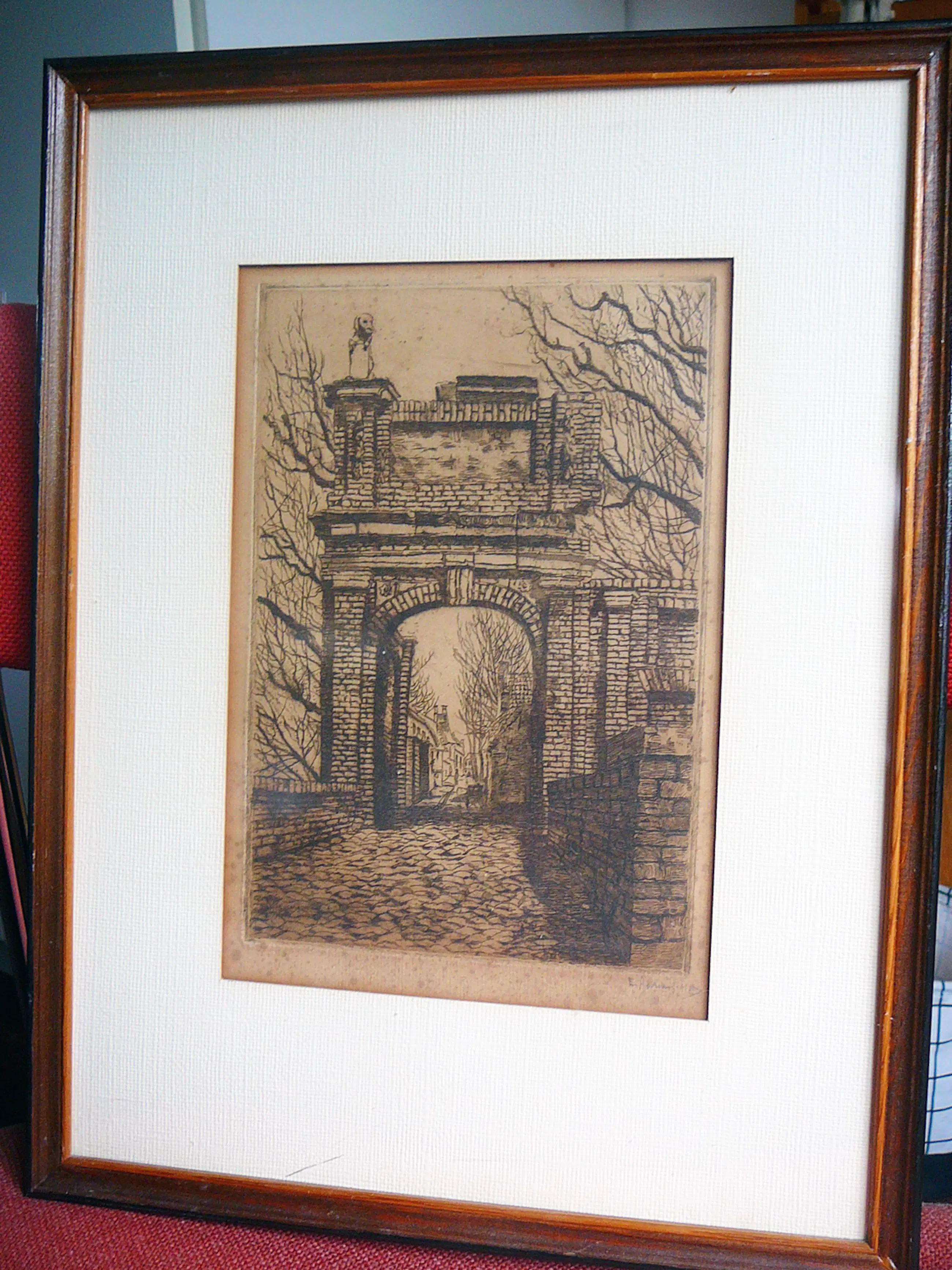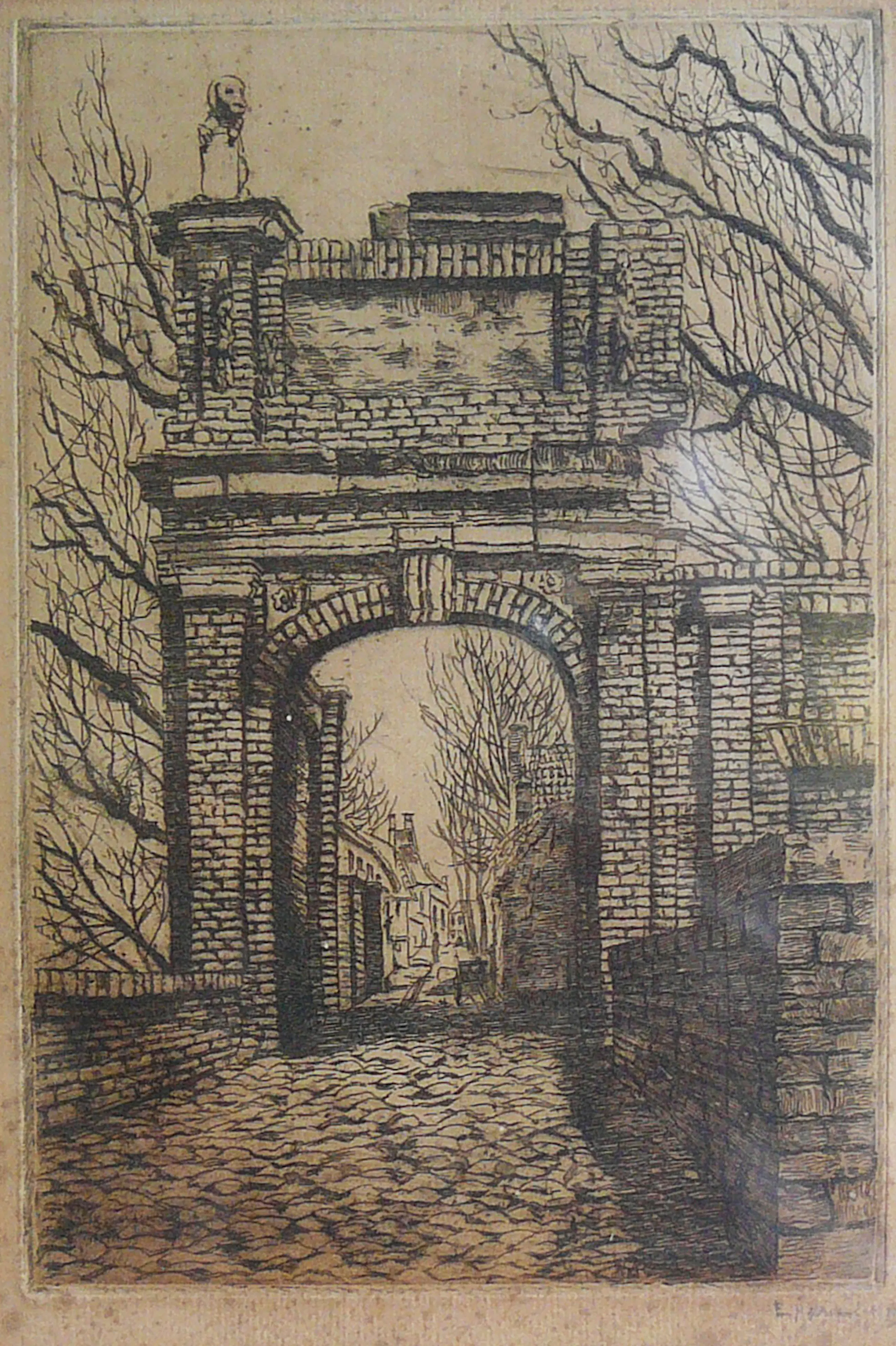 Ets van de hand van Elisabeth Adriani-Hovy, eerste helft 20e eeuw met een afbeelding van een poortgebouw vermoedelijk omgeving sterrenwacht Sonnenborgh te Utrecht. Meer werk van Hovy is te zien in het Centraal Museum Utrecht.