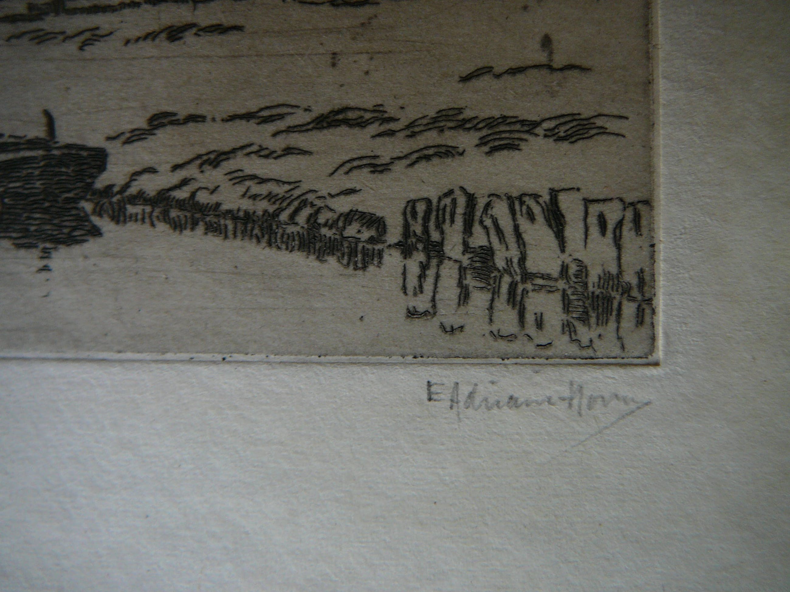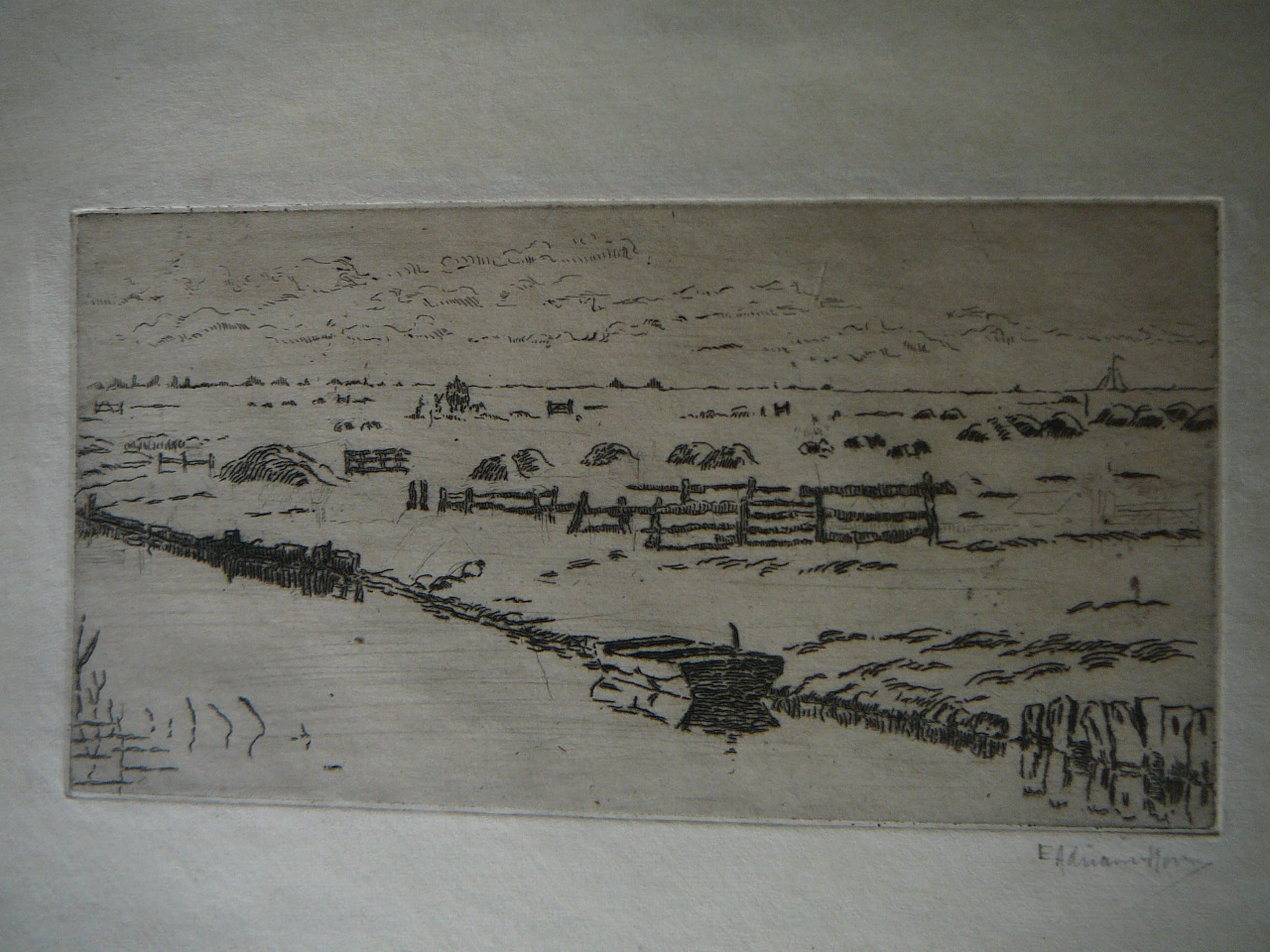 Heel mooie originele ets van Elisabeth Adriani-Hovy Weidelandschap (sneeuw?) met sloot en houten hek