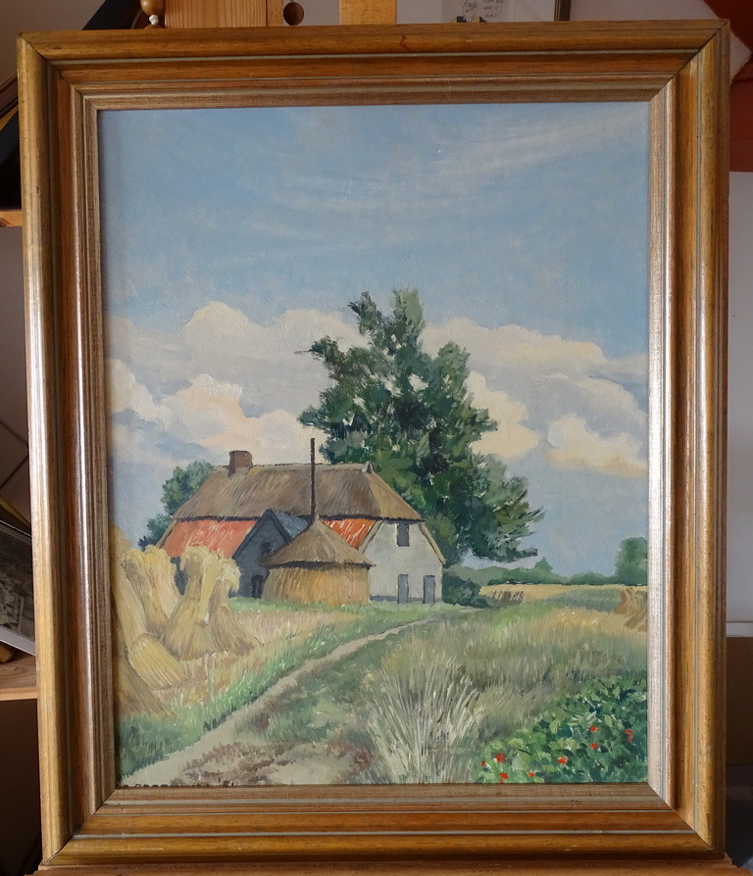 Sfeervol landschap met boerderij, olieverf op paneel (50x40 cm), linksonder gesigneerd E.S. Posthuma en gedateerd (1951). De signatuur zit deels achter de prima houten lijst (59x49 cm).