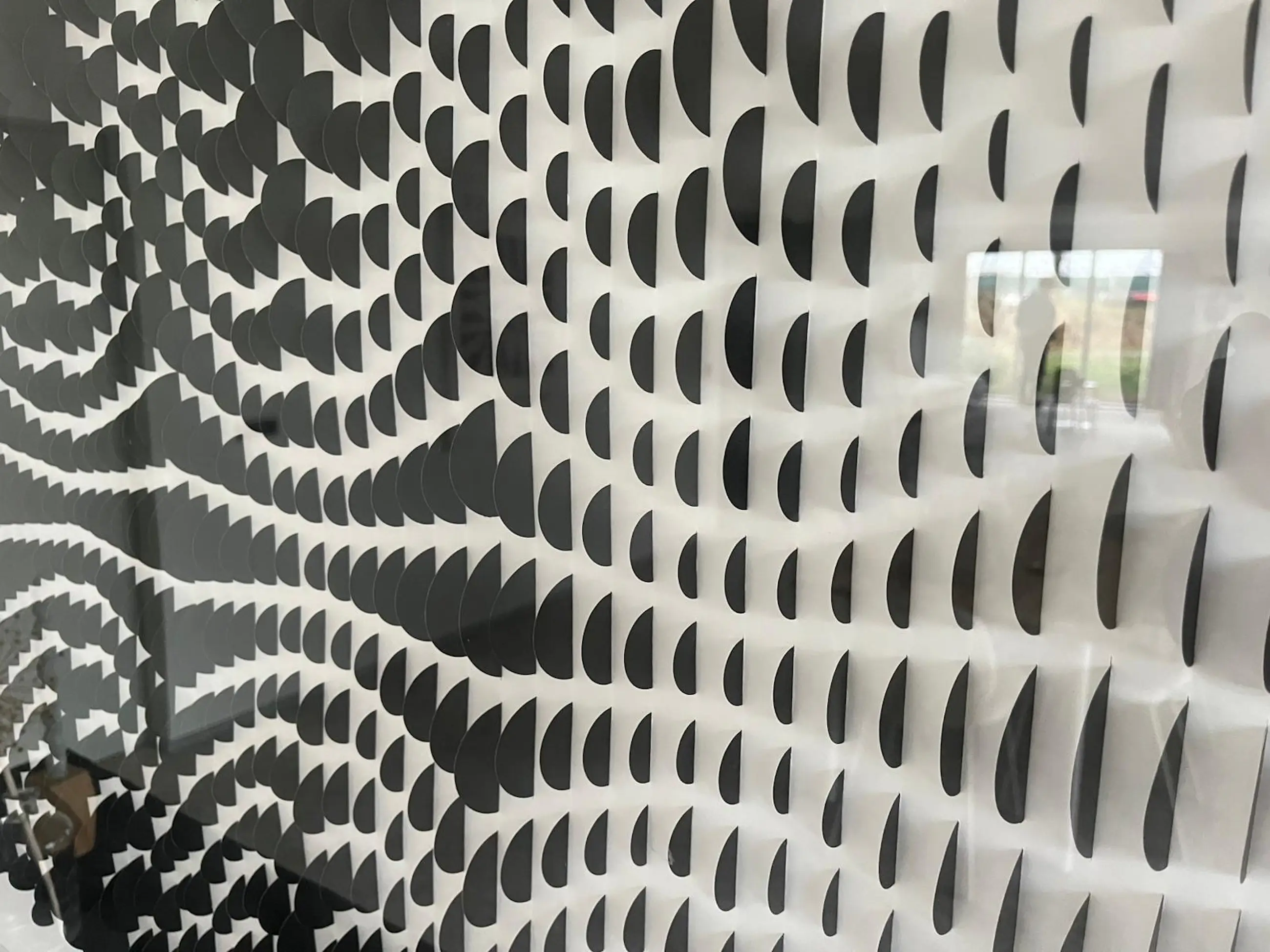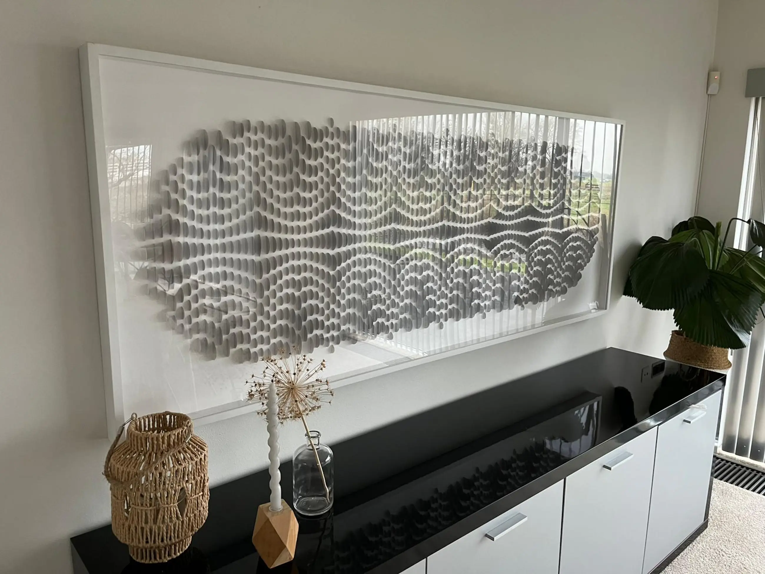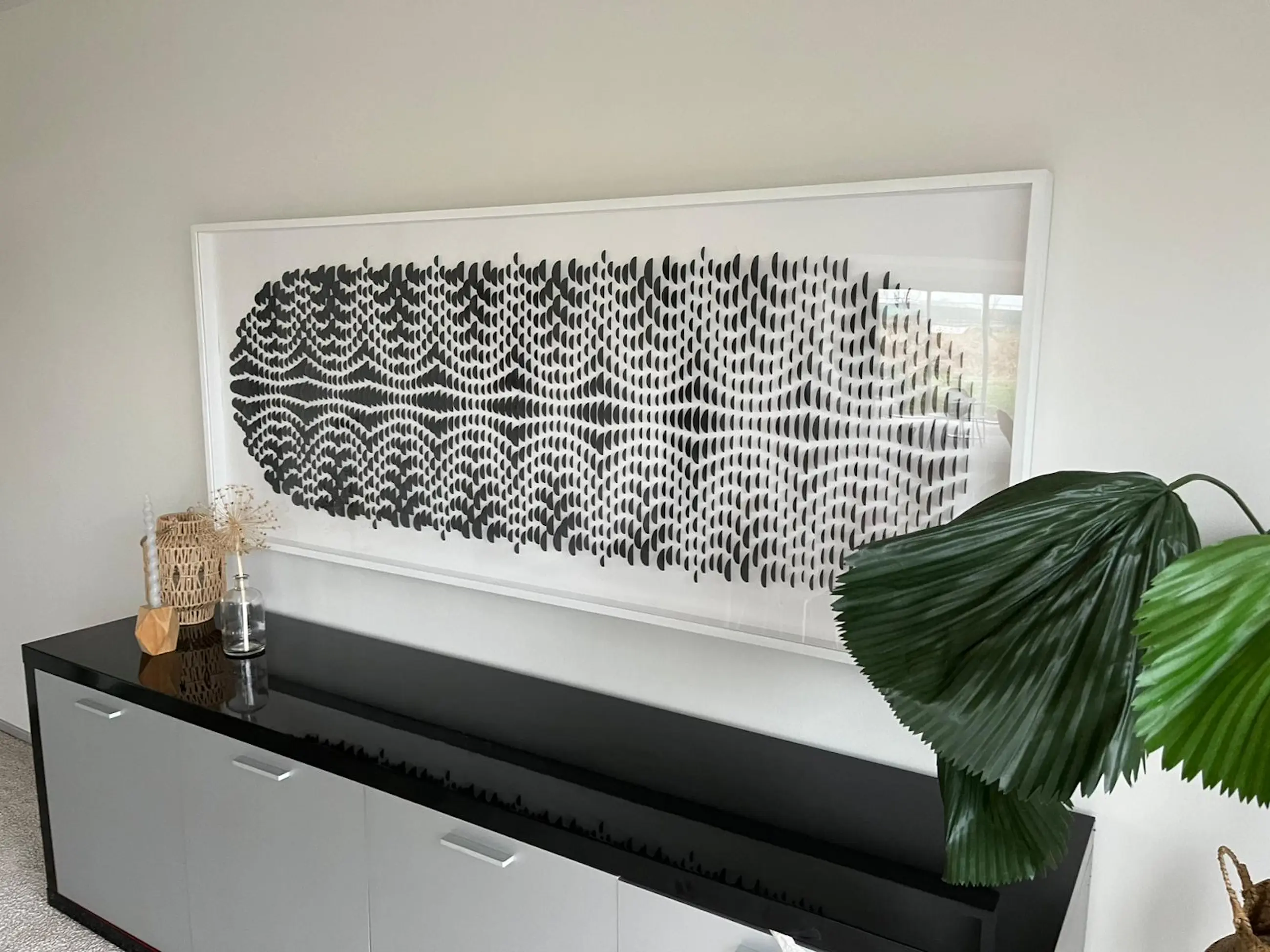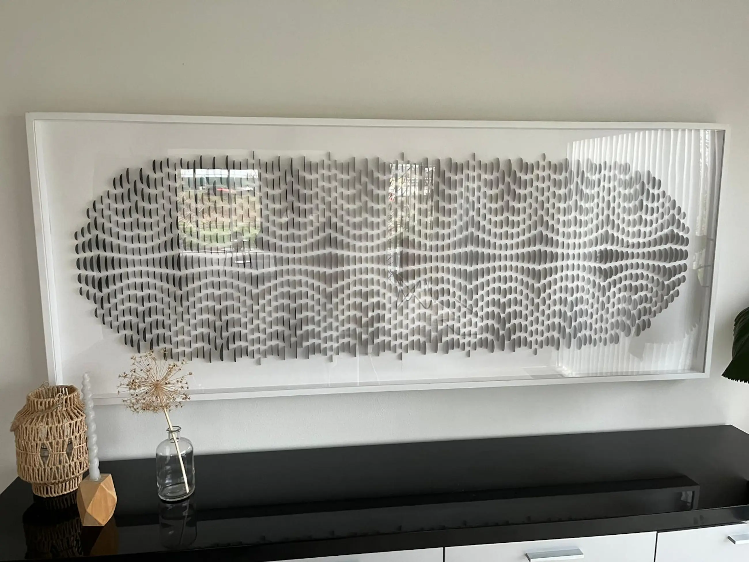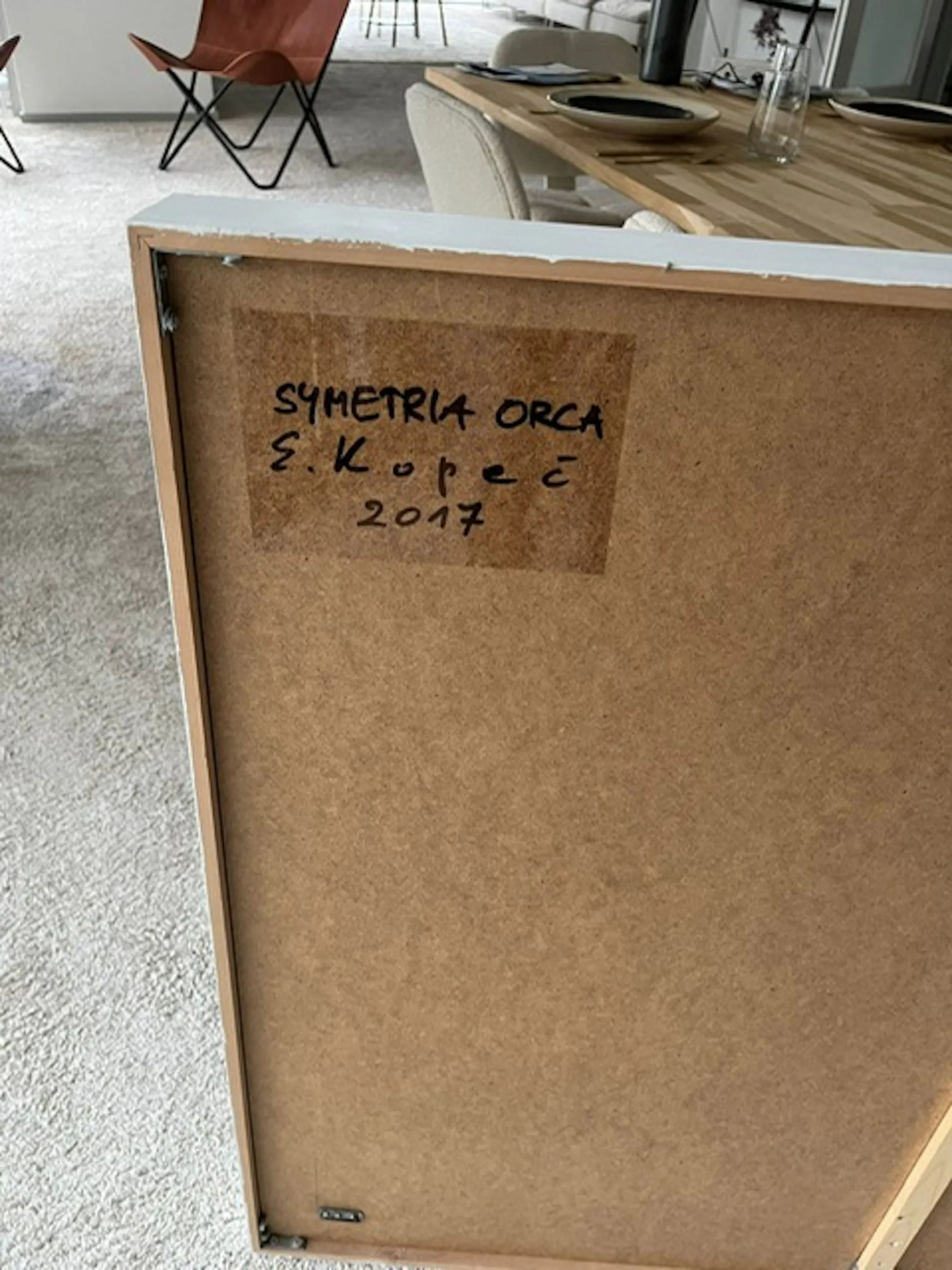 Dit kunstwerk heet Symetria Orca uit 2017. Grootte 89x223x7cm. Het is een geometrisch figuur, een abstrahering van een orca. We zien een liggende ovaal, bestaande uit rechtopstaande half ronde, handgesneden papieren schijven. De kleur van de schijven is zwart tegen een witte papieren achtergrond. Het kunstwerk bevindt zich in een withouten lijst met plexiglas plaat. Een uniek en verfijnd stuk.