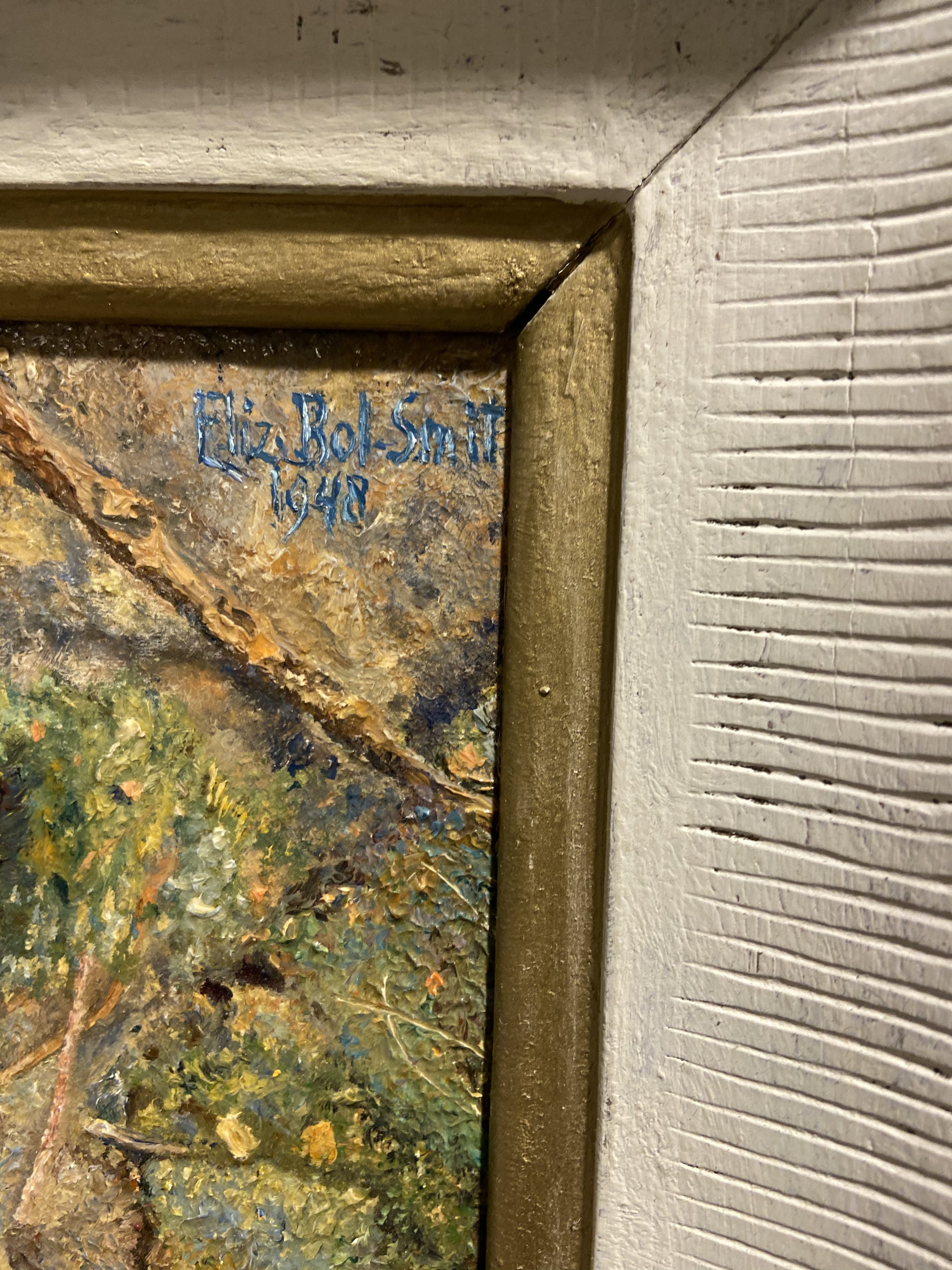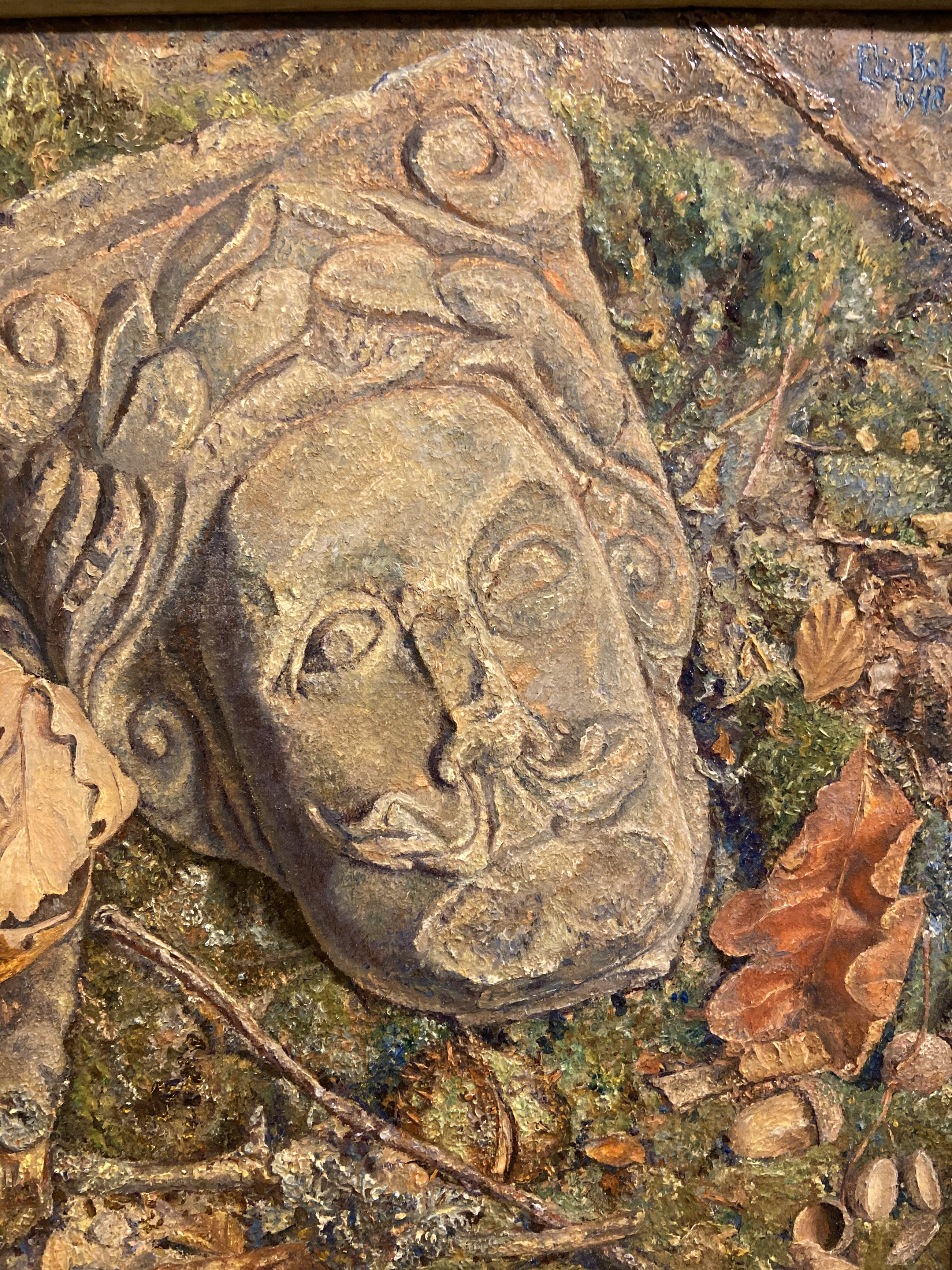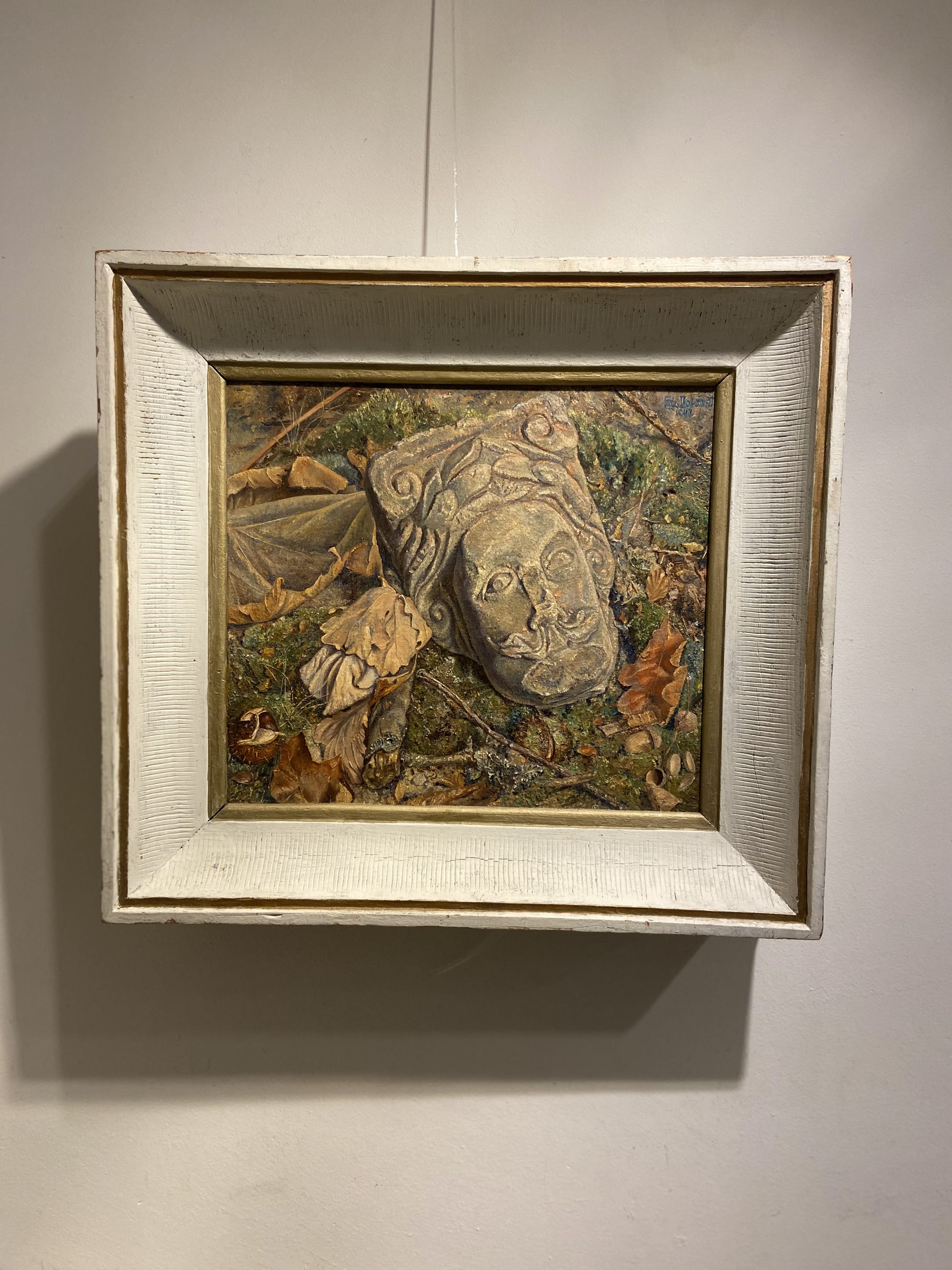 Bijzonder schilderij met een stenen kop op een bosgrond . Gesigneerd + gedateerd bovenaan rechts . Met de originele lijst uit 1948.