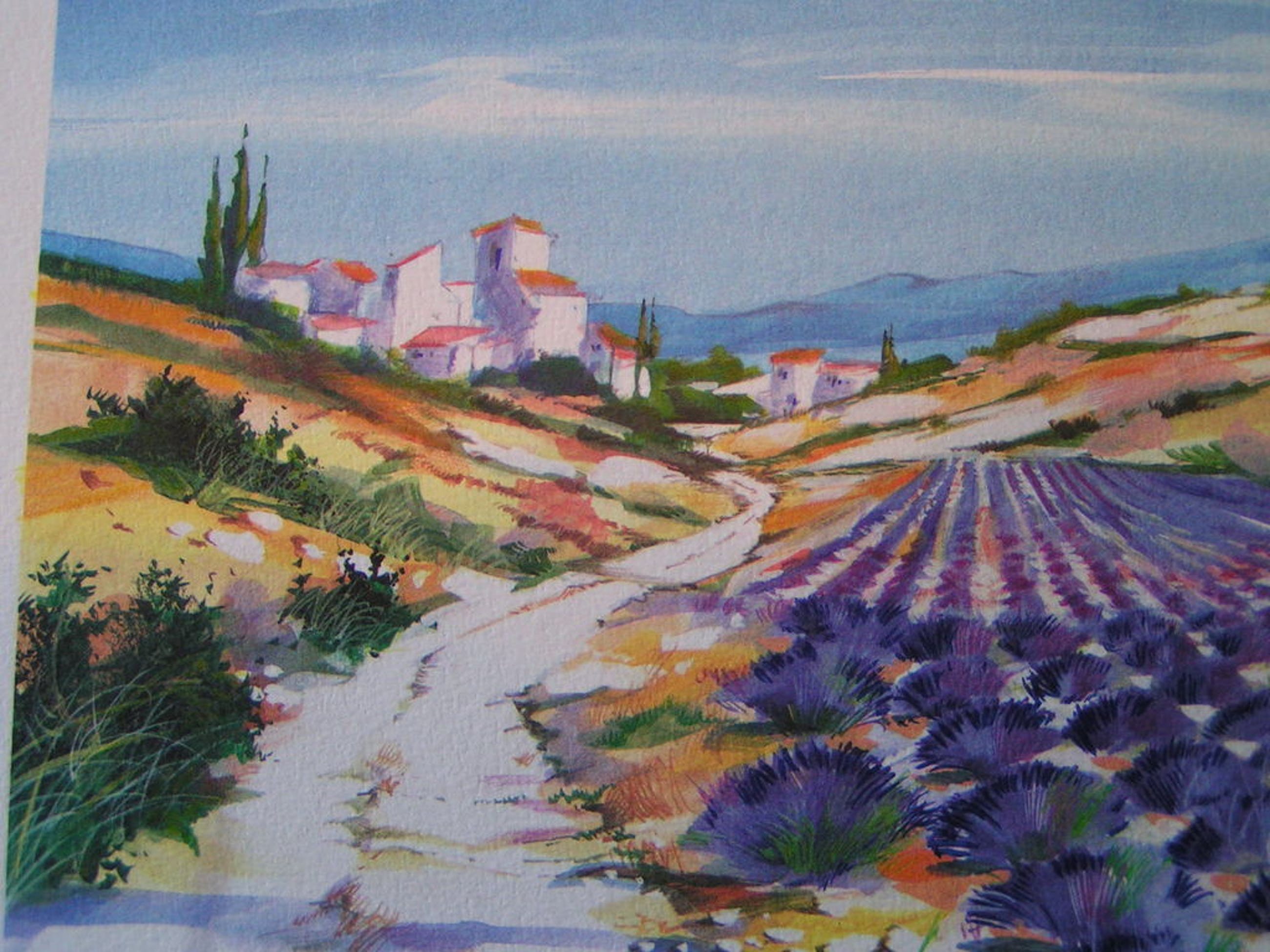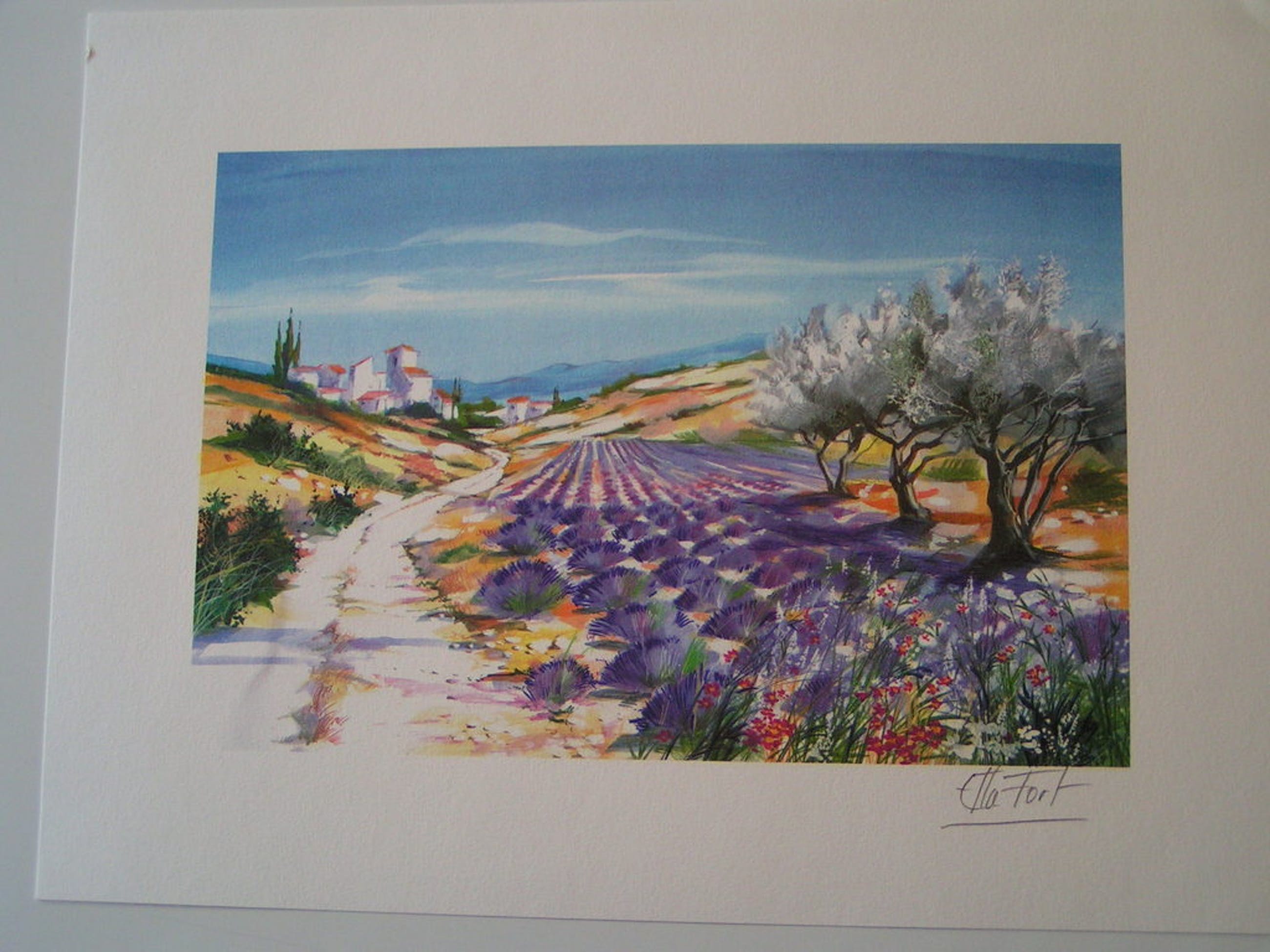 Ella Fort "Landschap met een dorp op de achtergrond, olijfbomen en lavendelvelden in de Provence".