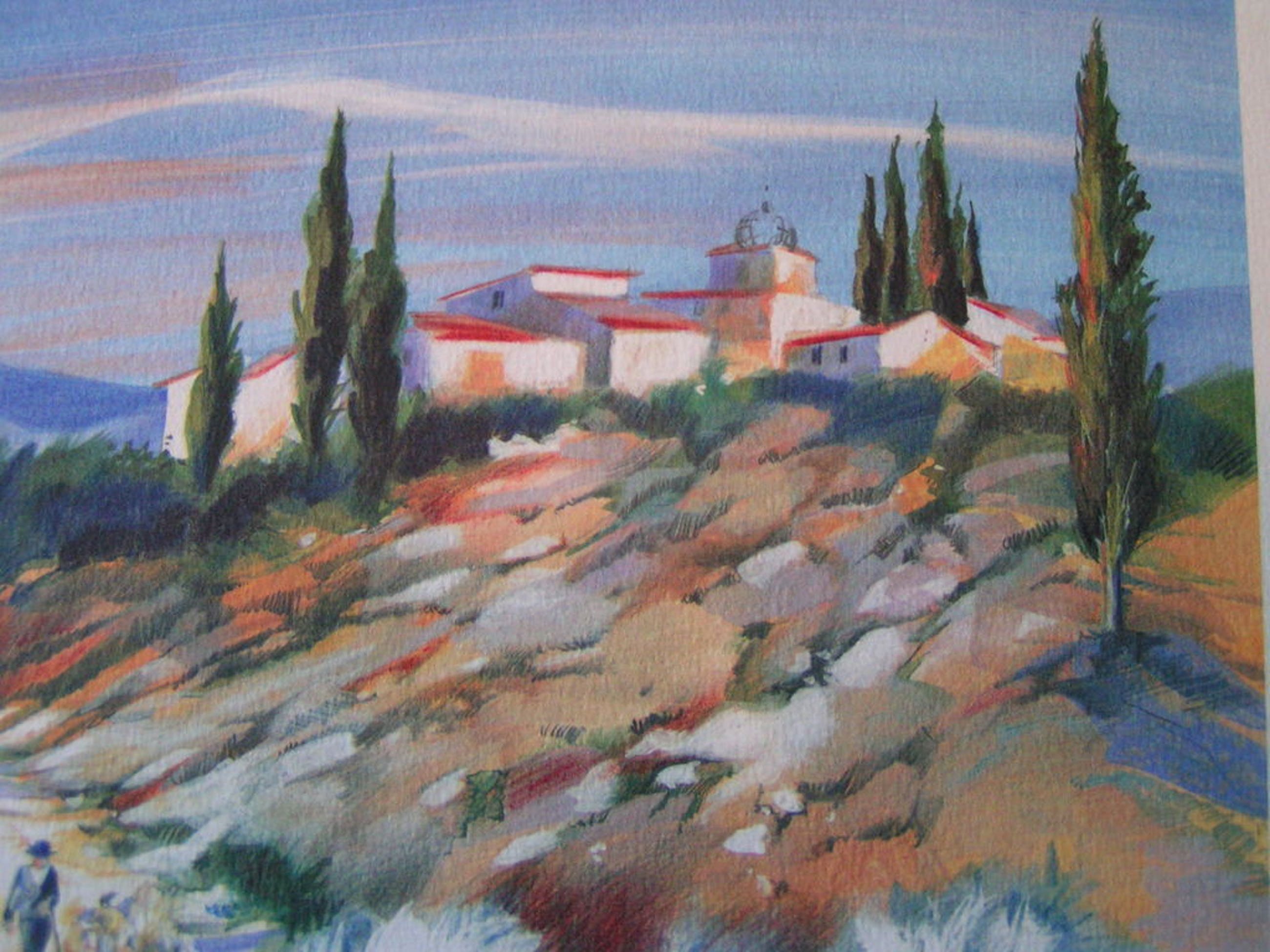 Ella Fort "Landschap met een dorp, olijfbomen en een schaapskudde in de Provence".