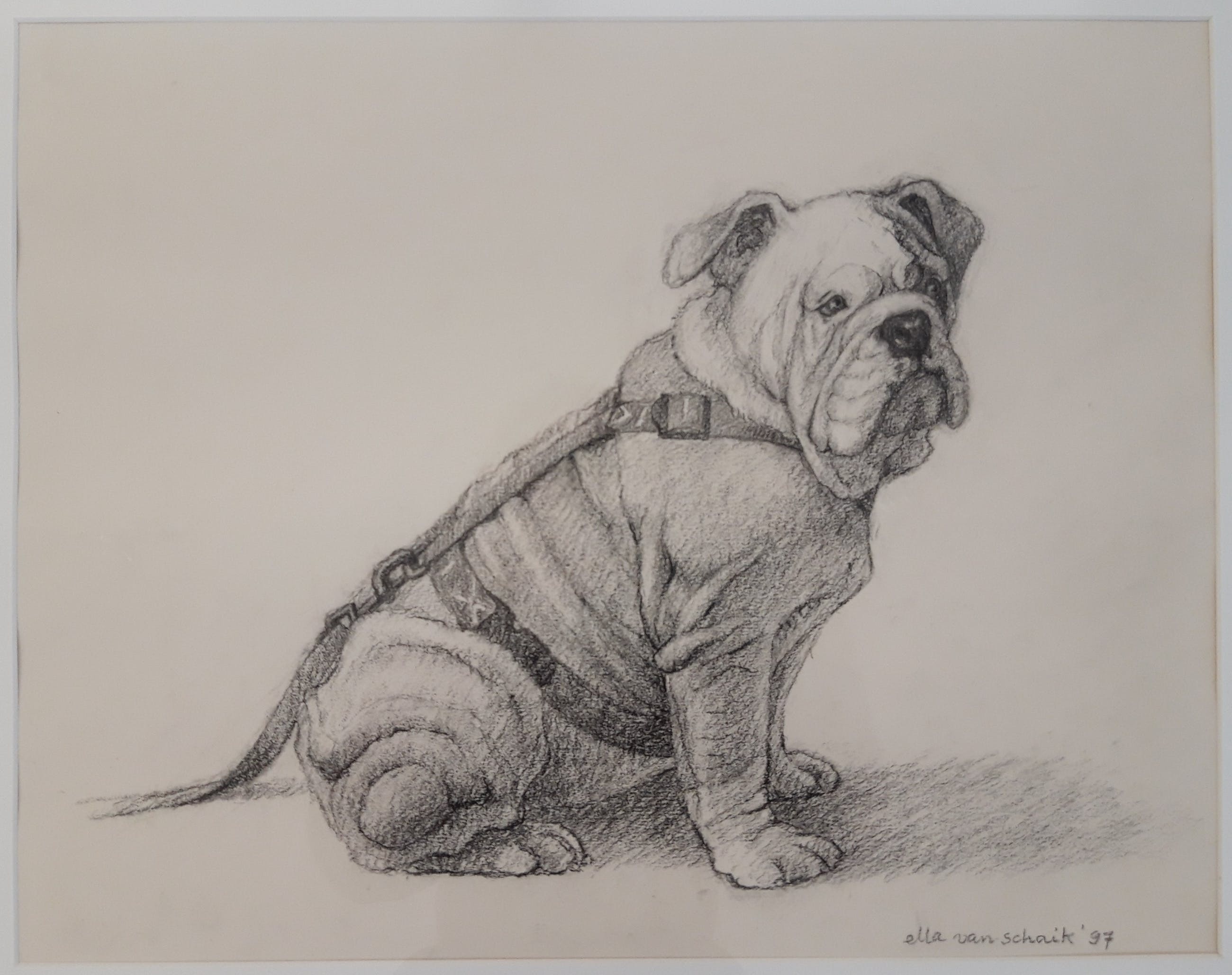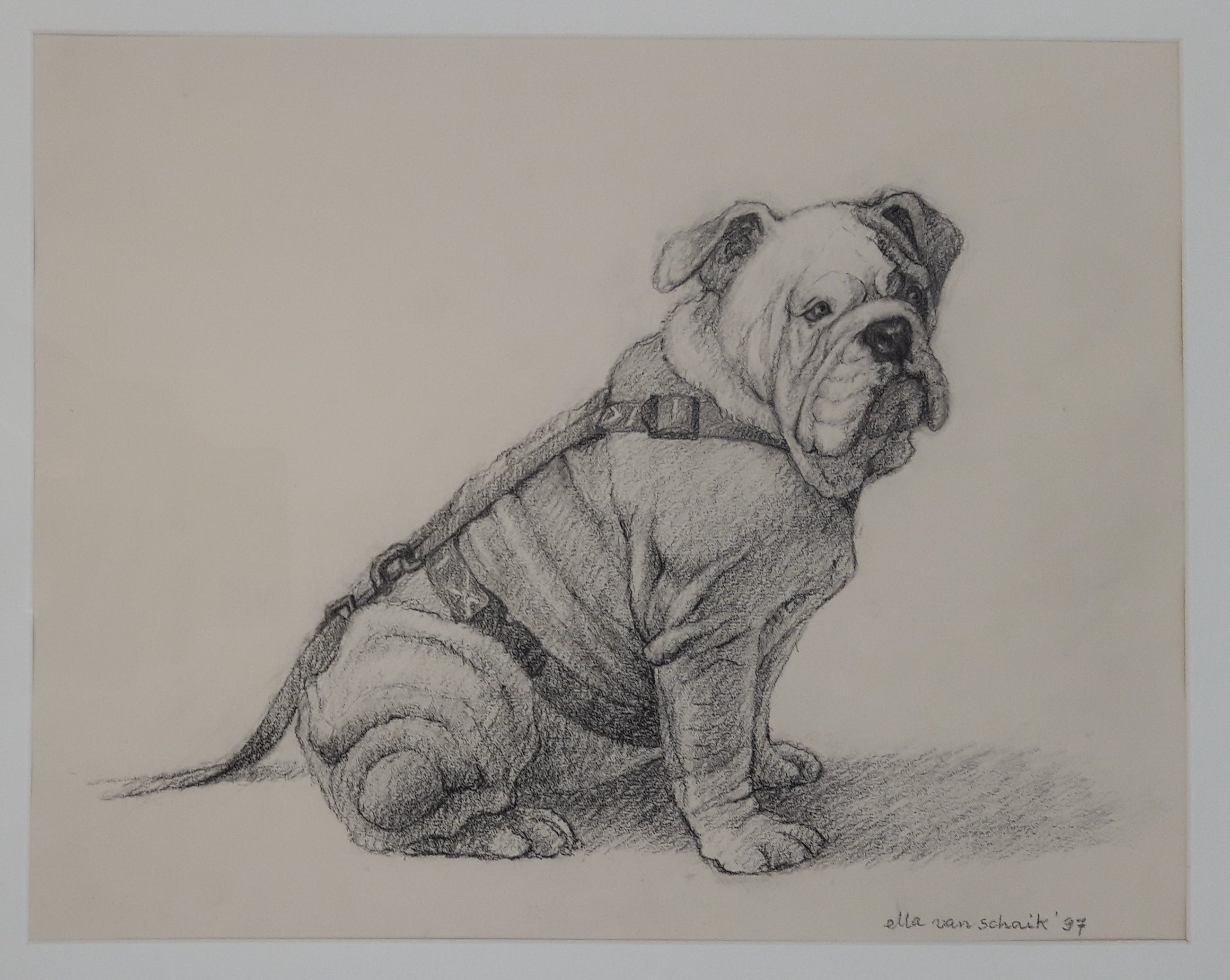 Ella van Schaik (1940) is vooral bekend om haar etsen, tekeningen en schilderijen met katten. Zij is vooral bekend geworden door de uitgave van het Poezenkwartet. Ook maakte Ella illustraties voor boeken en tijdschriften. Hier dus een hond.