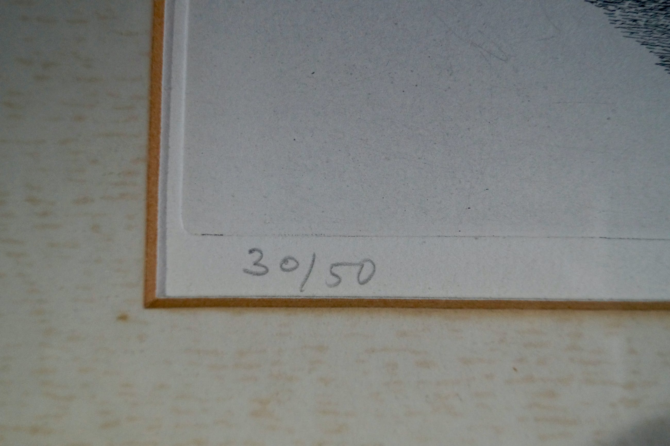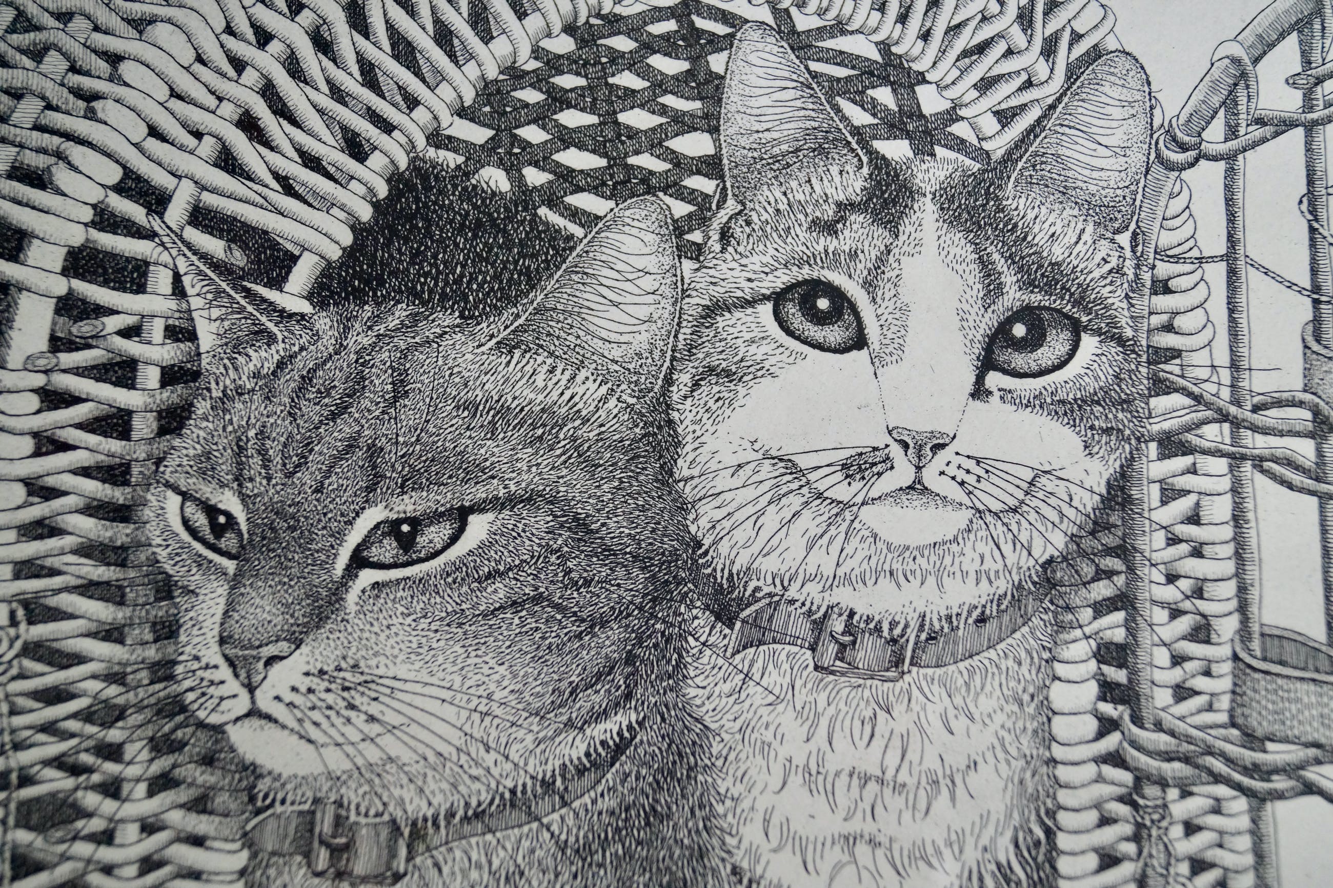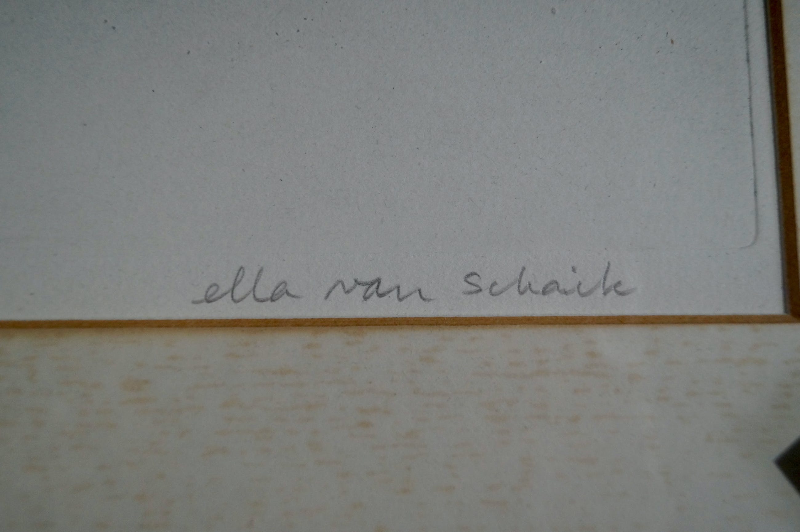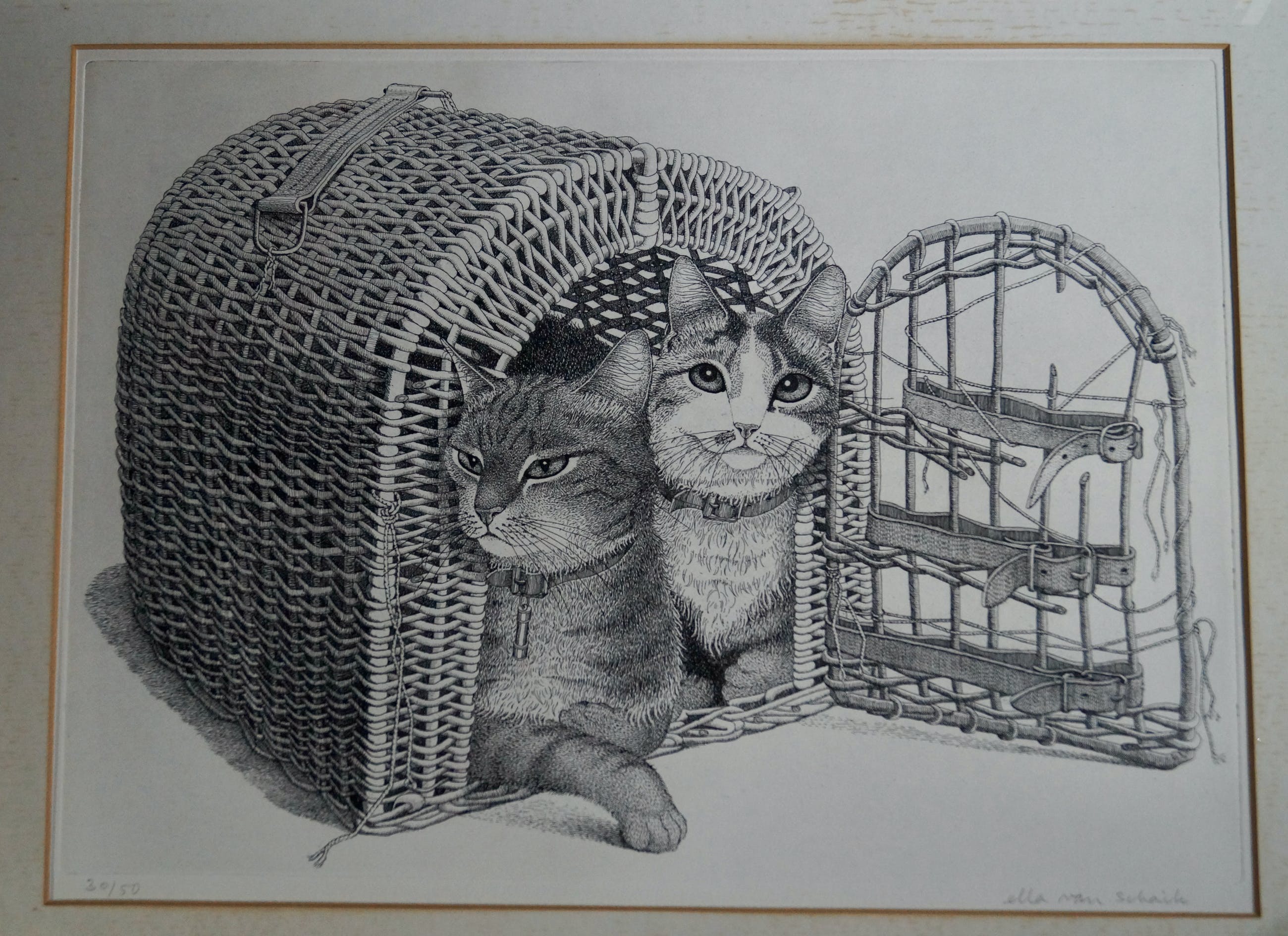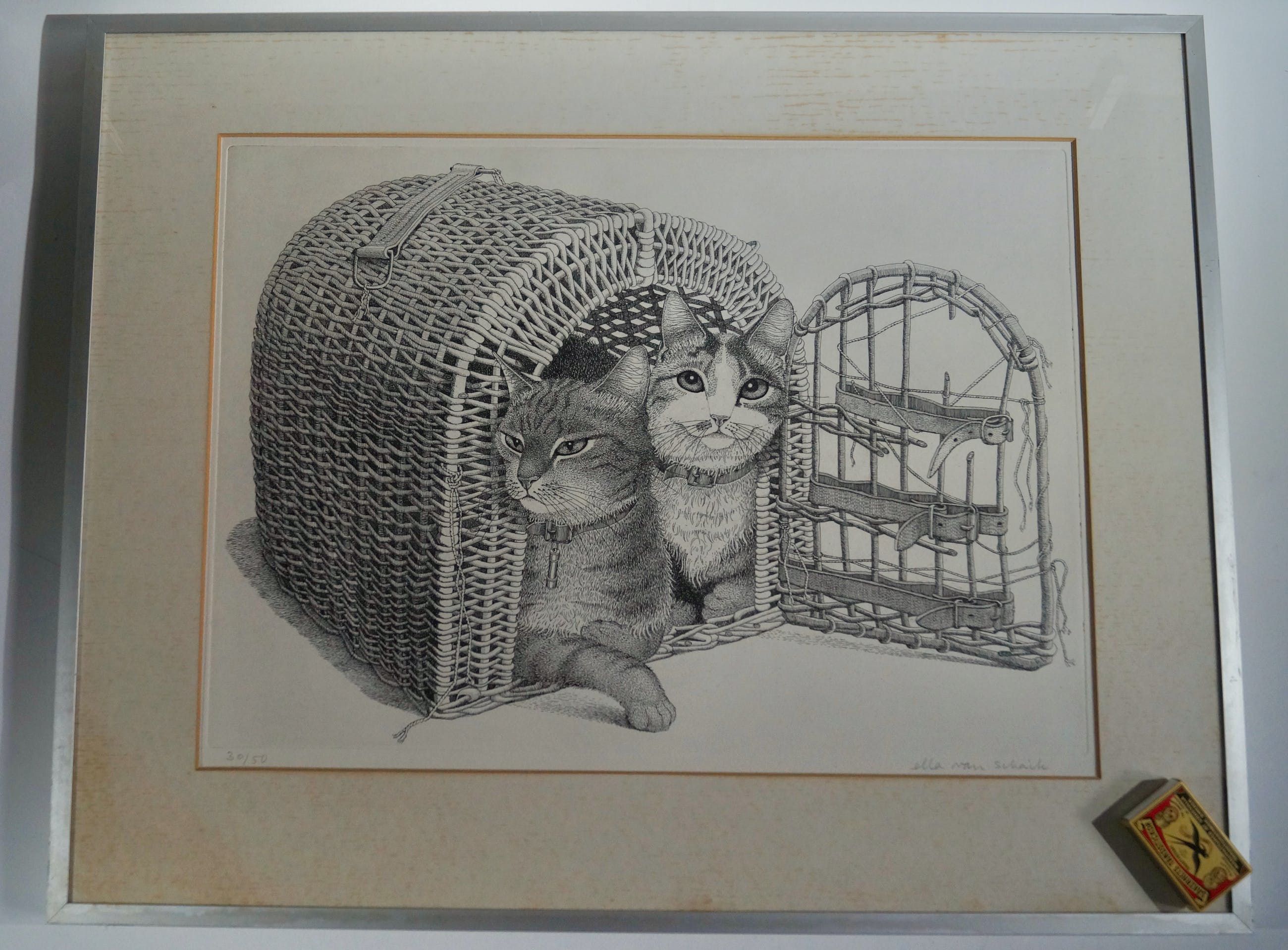 mooie ets van de Haagse kunstenares Ella van Schaik Zij heeft heel veel etsen gemaakt met haar eigen poezen als onderwerp. achter glas in aluminium lijst rechts onder gesigneerd met potlood "Ella van Schaik" linksonder staat: 30/50 (d.w.z. druk 30 van een oplage van 50)