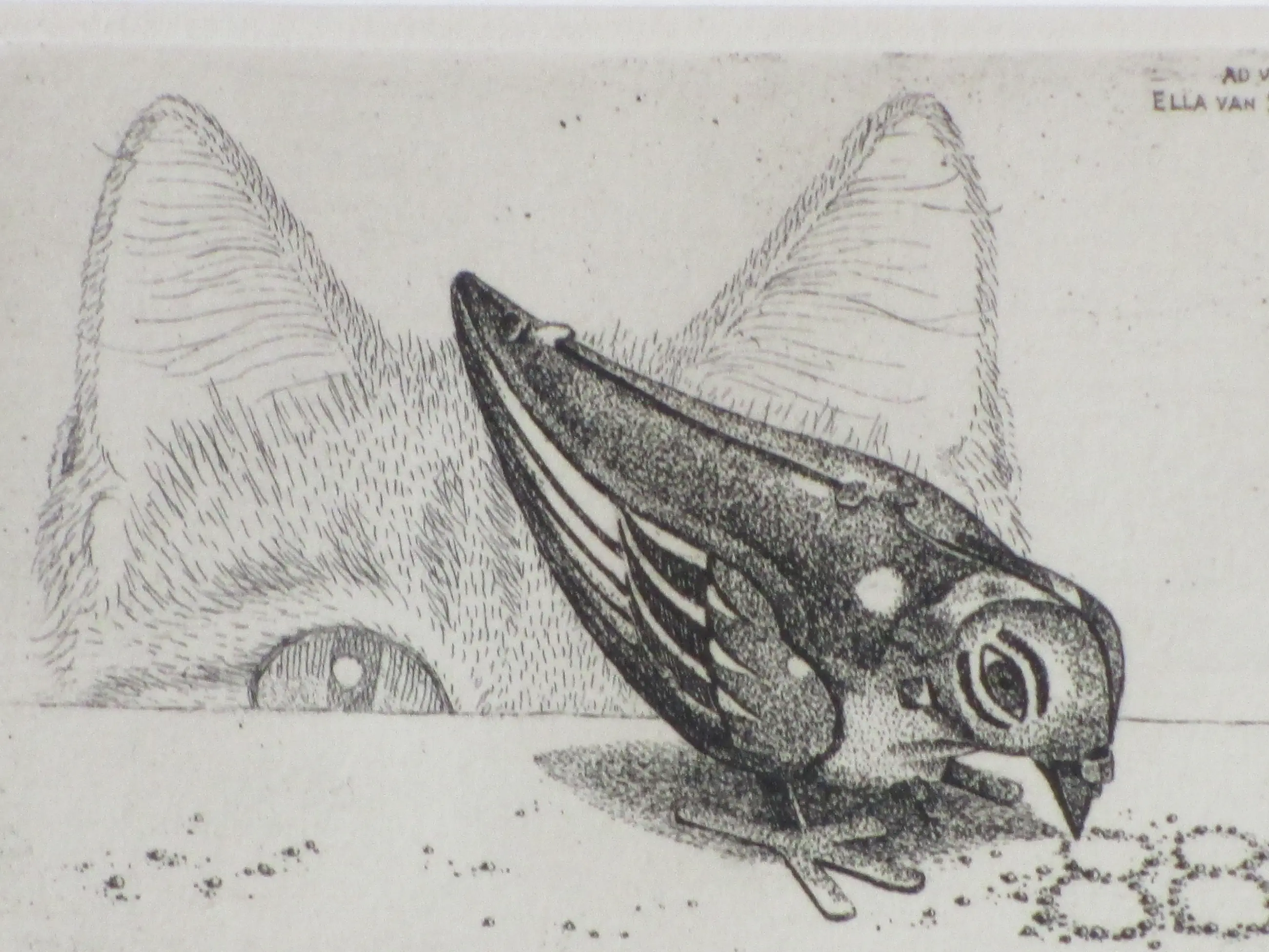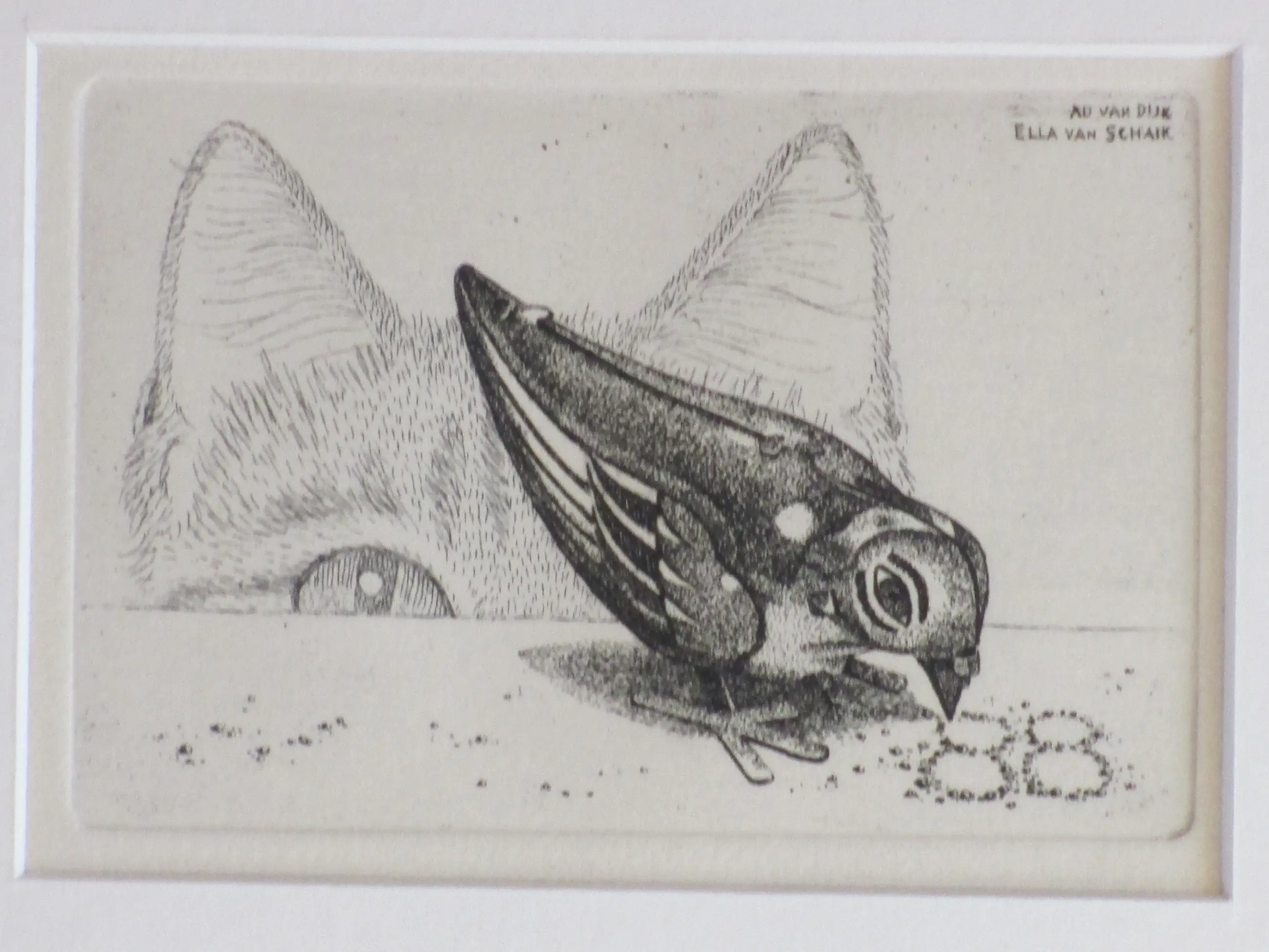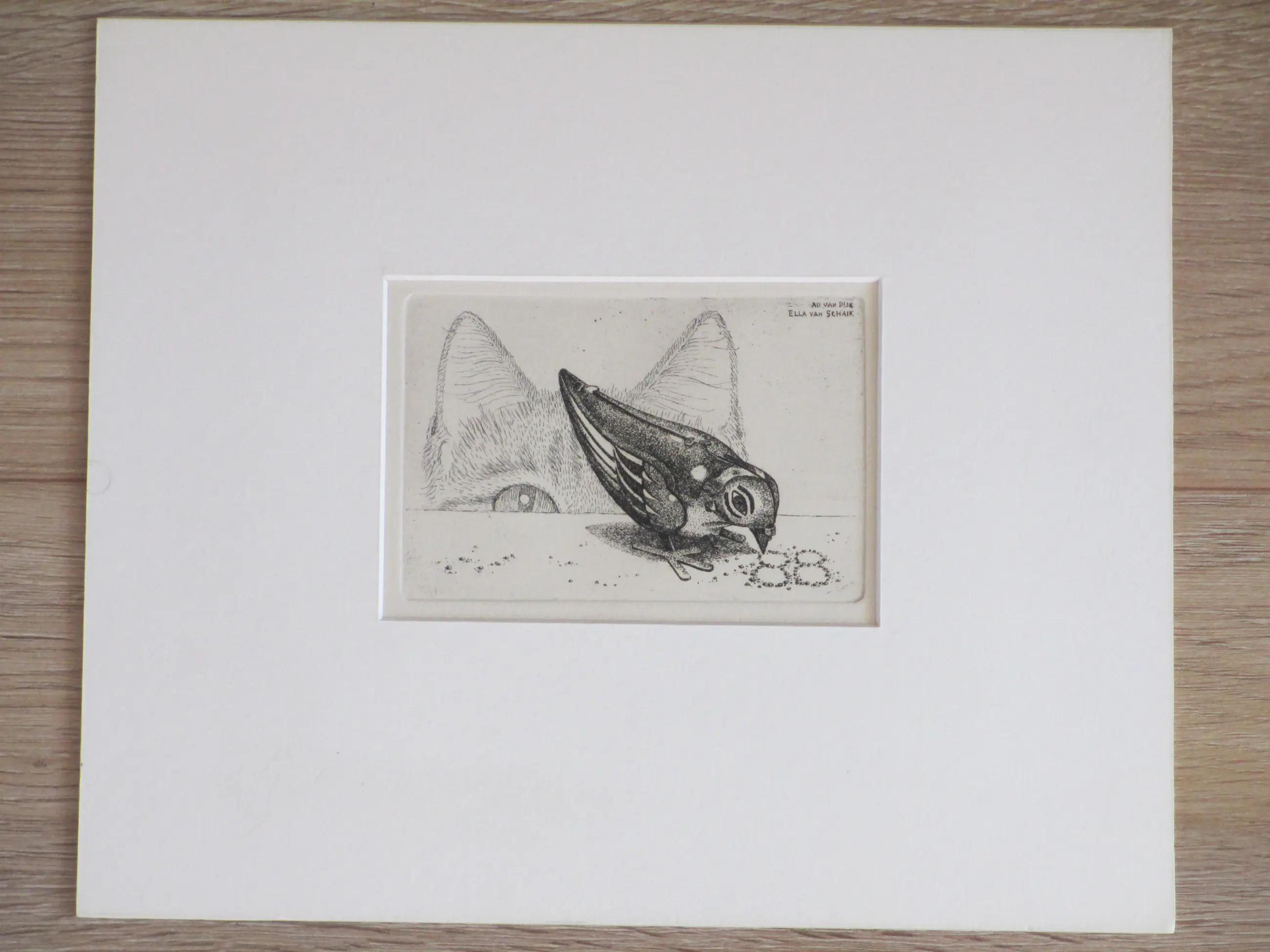 Ets door Ella van Schaik Voorstelling van een vogel en een kat Ets onder passepartout, beeldmaat 8x11, p.p.maat 22x26 Gesigneerd in de druk r.b.: 'Ella van Schaik' en 'Ad van Dijk' Mogelijk bedoeld als Nieuwjaarswens voor 1988 Rechtsonder pikt de vogel in zaad in de vorm van de cijfers '88' Authenticiteit volledig gegarandeerd