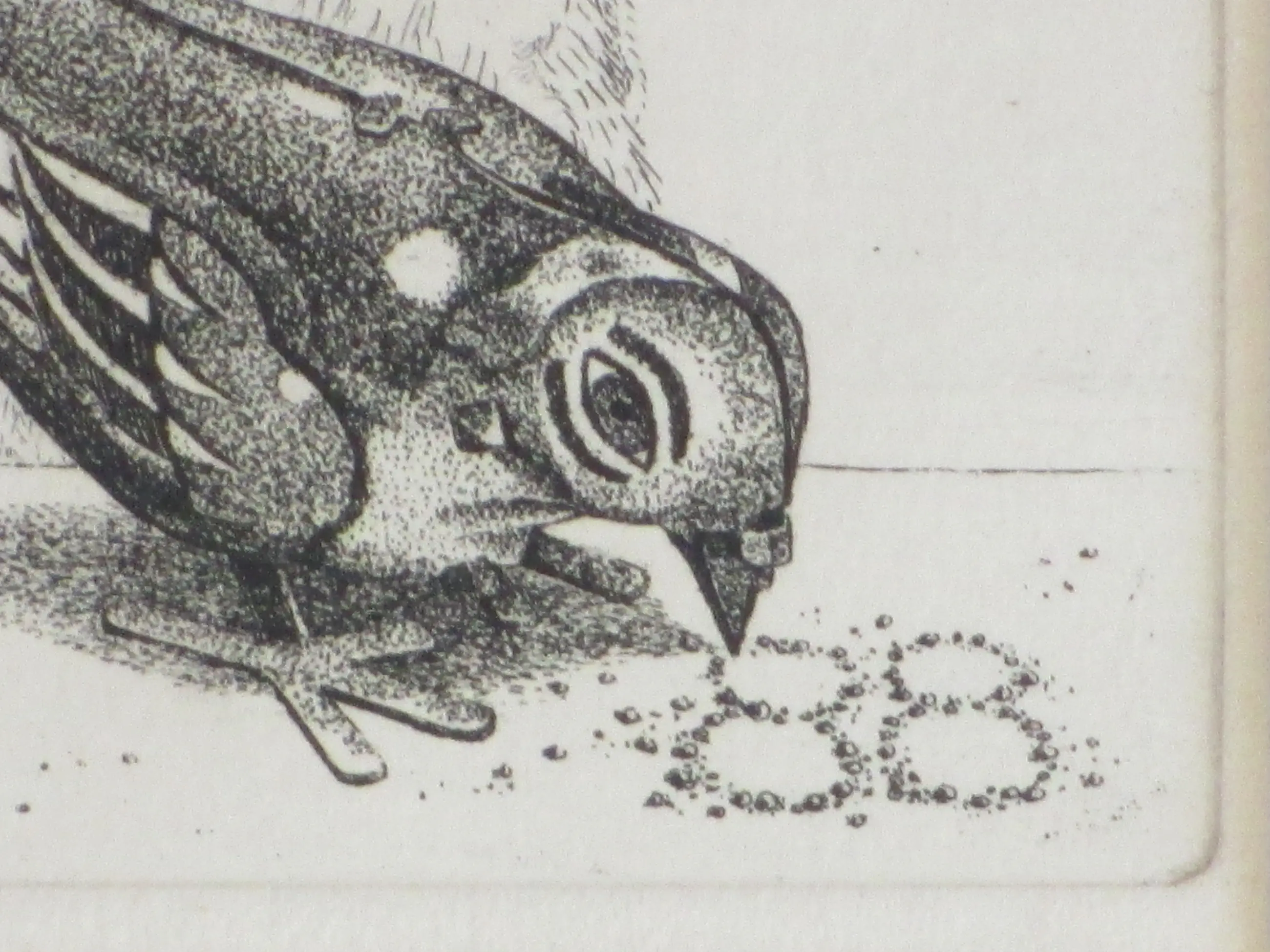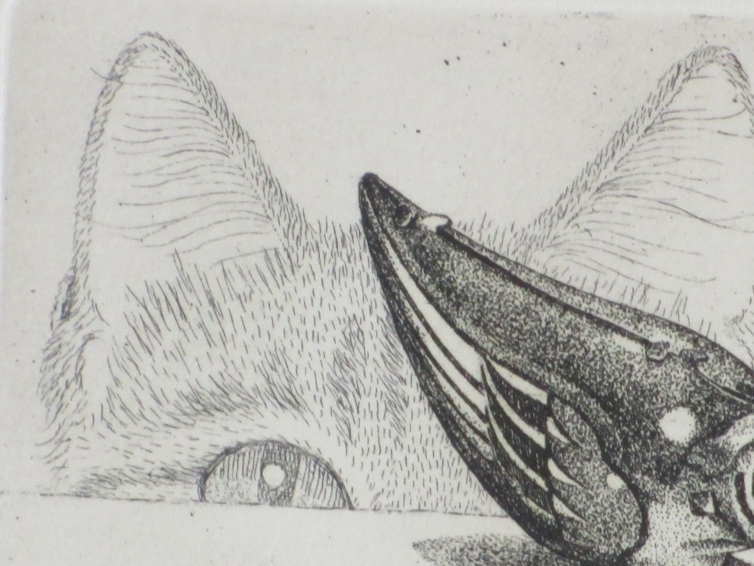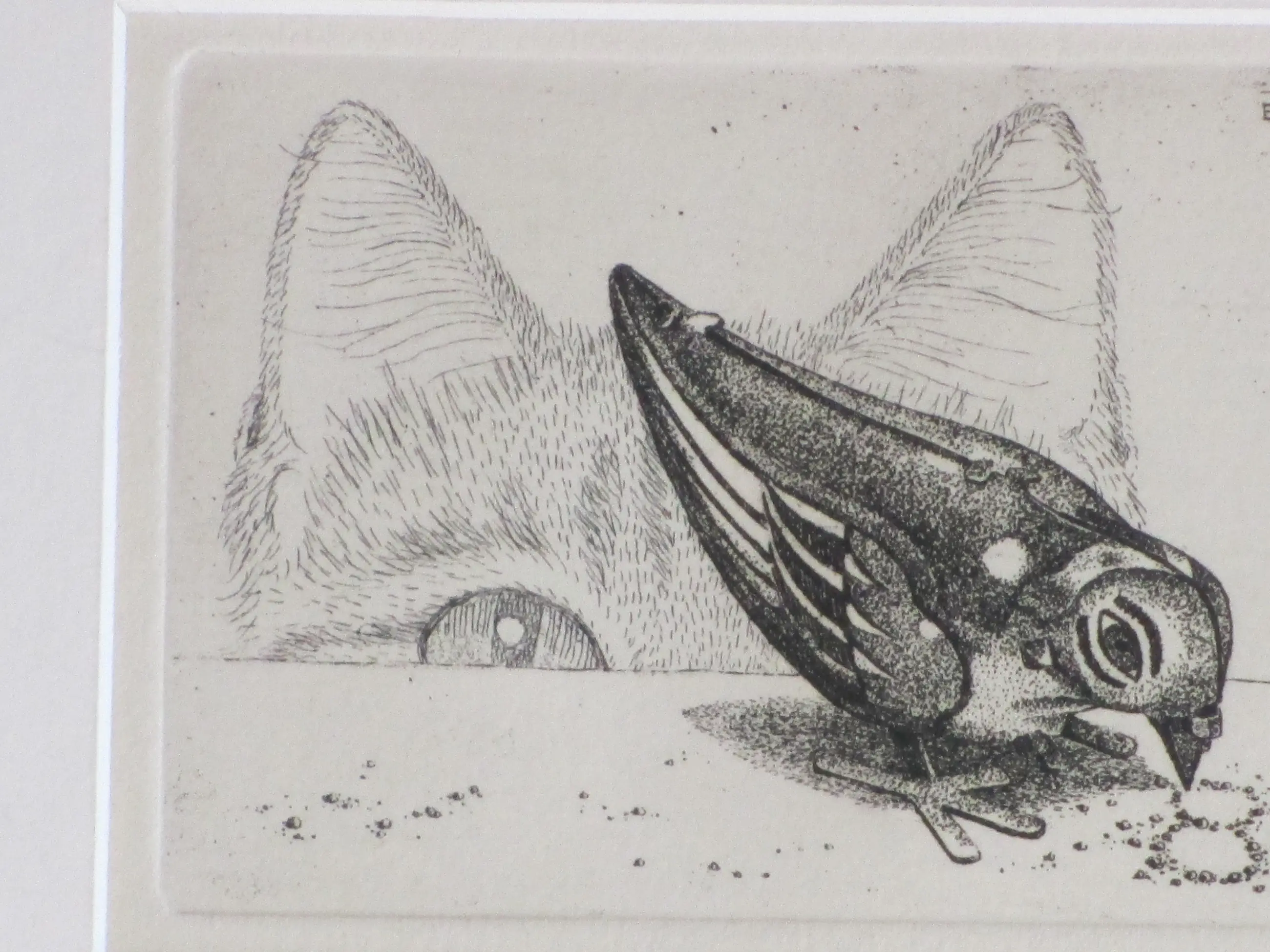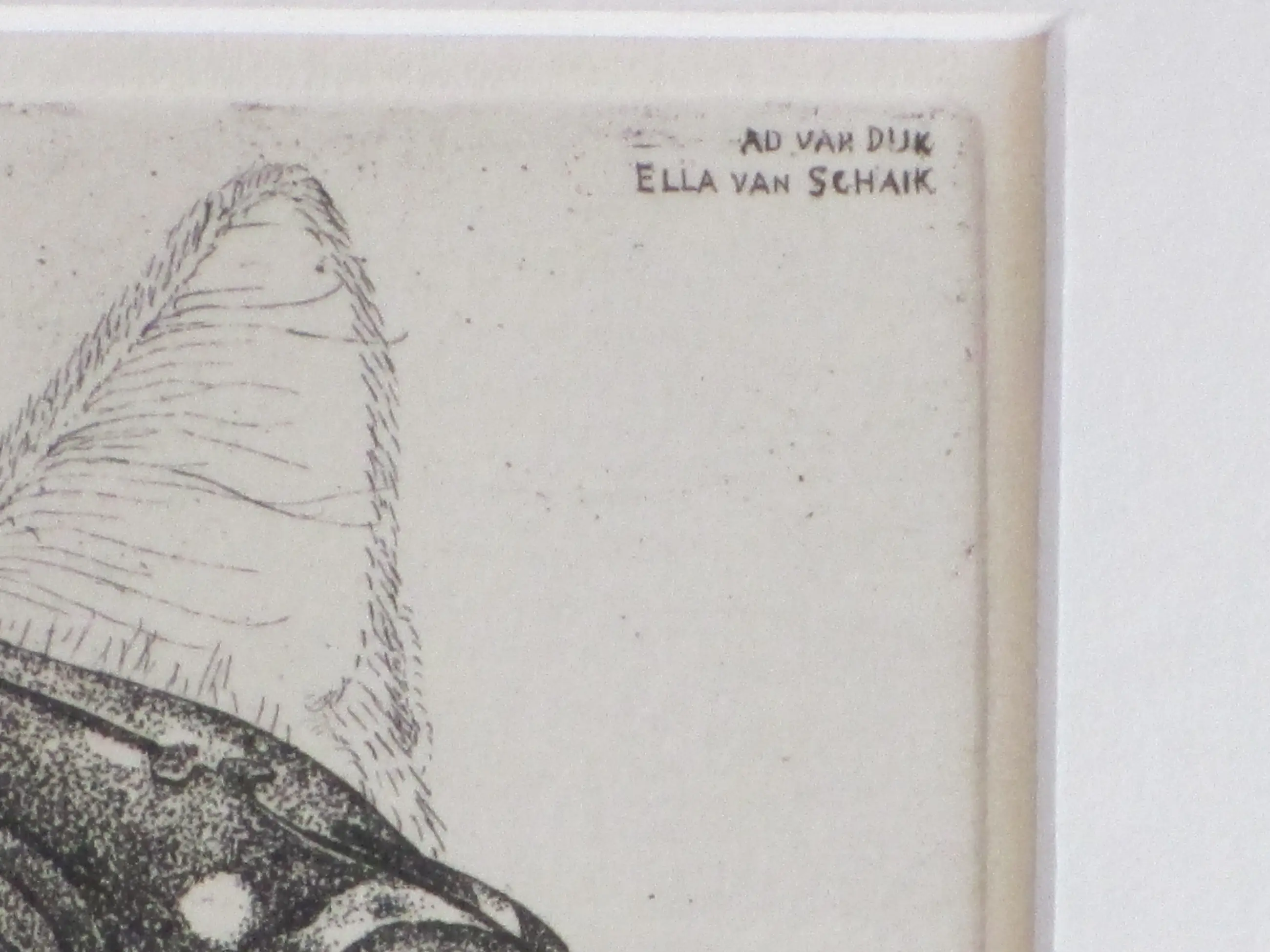 Ets door Ella van Schaik Voorstelling van een vogel en een kat Ets onder passepartout, beeldmaat 8x11, p.p.maat 22x26 Gesigneerd in de druk r.b.: 'Ella van Schaik' en 'Ad van Dijk' Mogelijk bedoeld als Nieuwjaarswens voor 1988 Rechtsonder pikt de vogel in zaad in de vorm van de cijfers '88' Authenticiteit volledig gegarandeerd