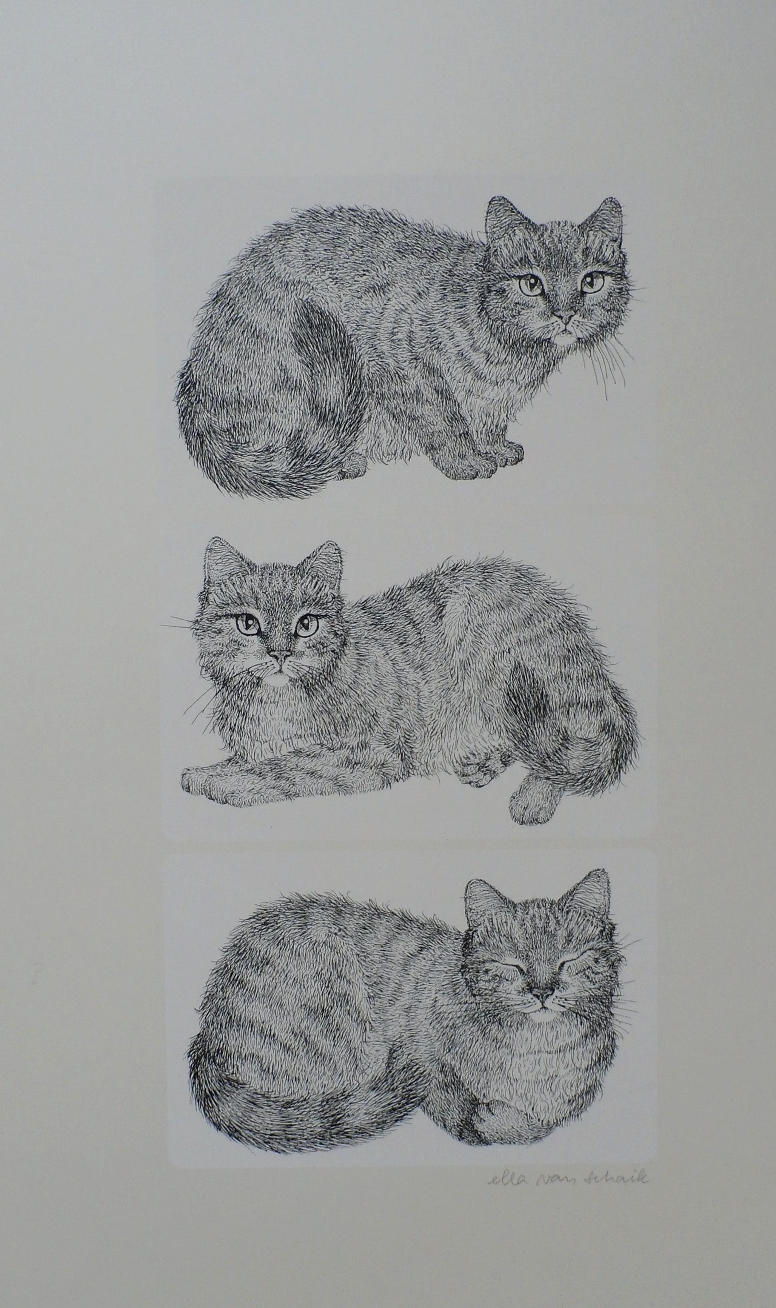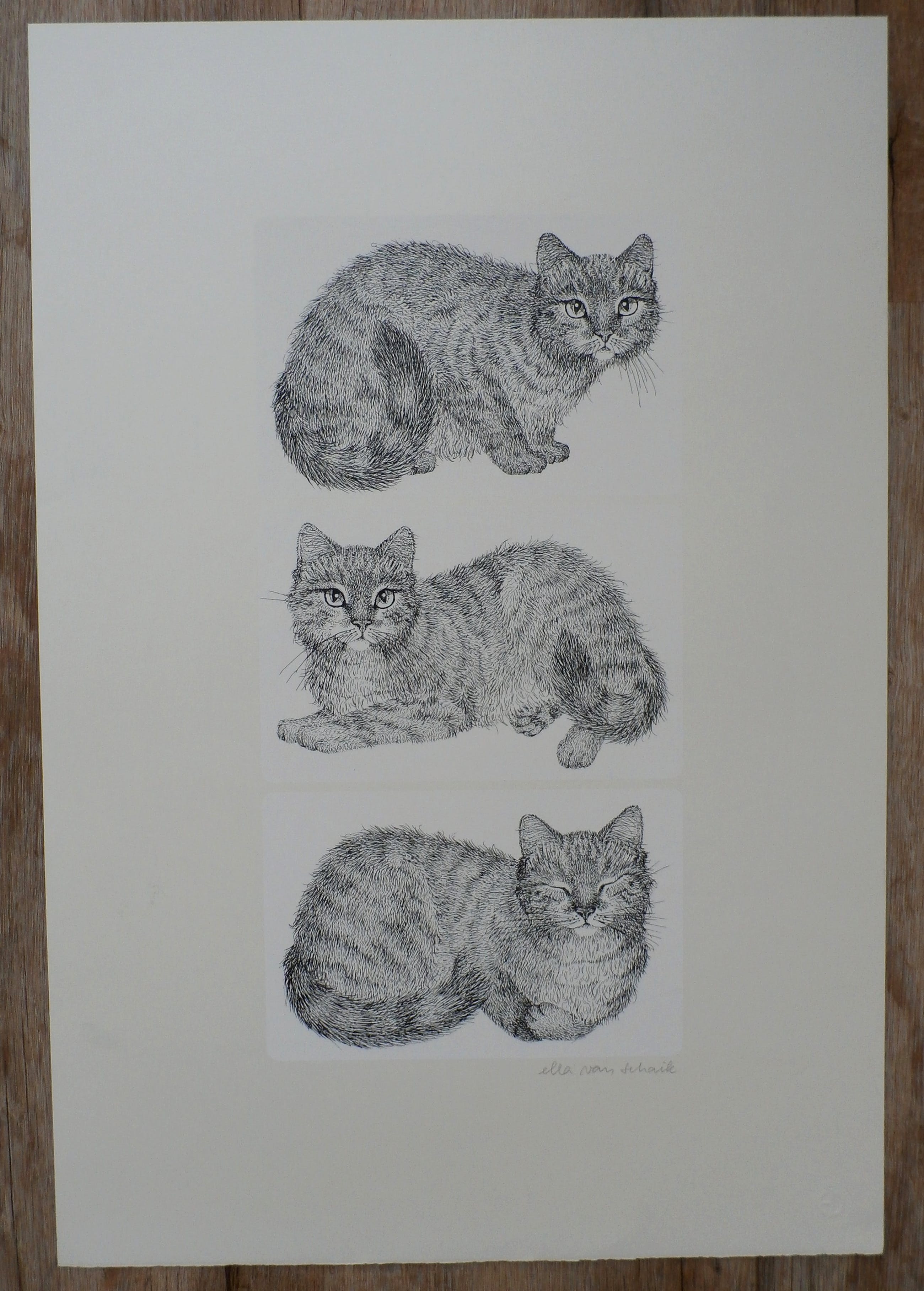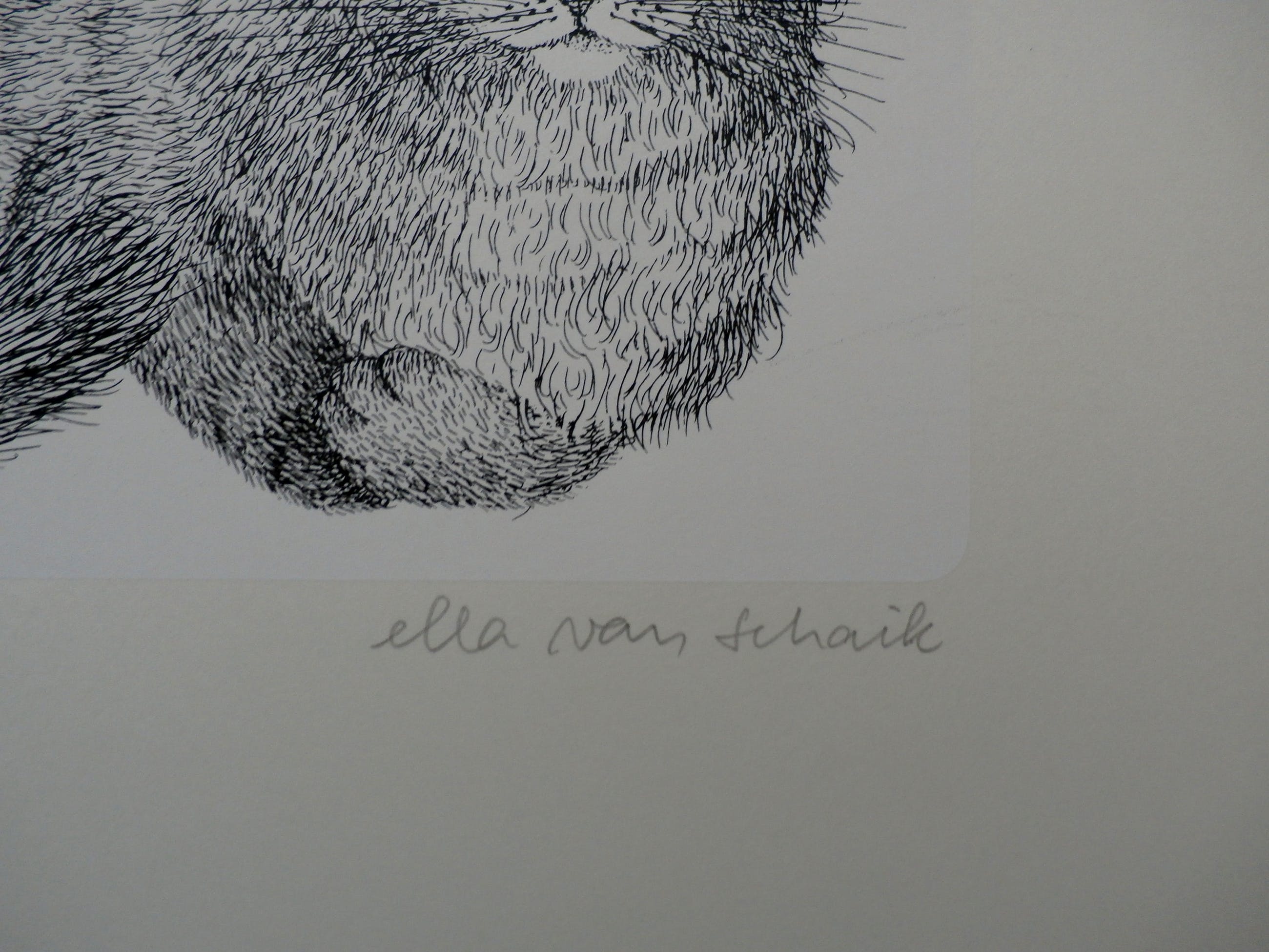 Zeefdruk van Ella van Schaik. Titel: Poes. Afmetingen blad: H63 x b44. Afmetingen voorstelling: H43 x b22 cm. Herkomst: nalatenschap van Henk van der Vet. Rechtsonder gesigneerd, met potlood, door de kunstenares.De authenciteit van het, aangeboden, werk wordt voor 100% gegarandeerd. Een certificaat van echtheid kan, op aanvraag, worden meegestuurd.