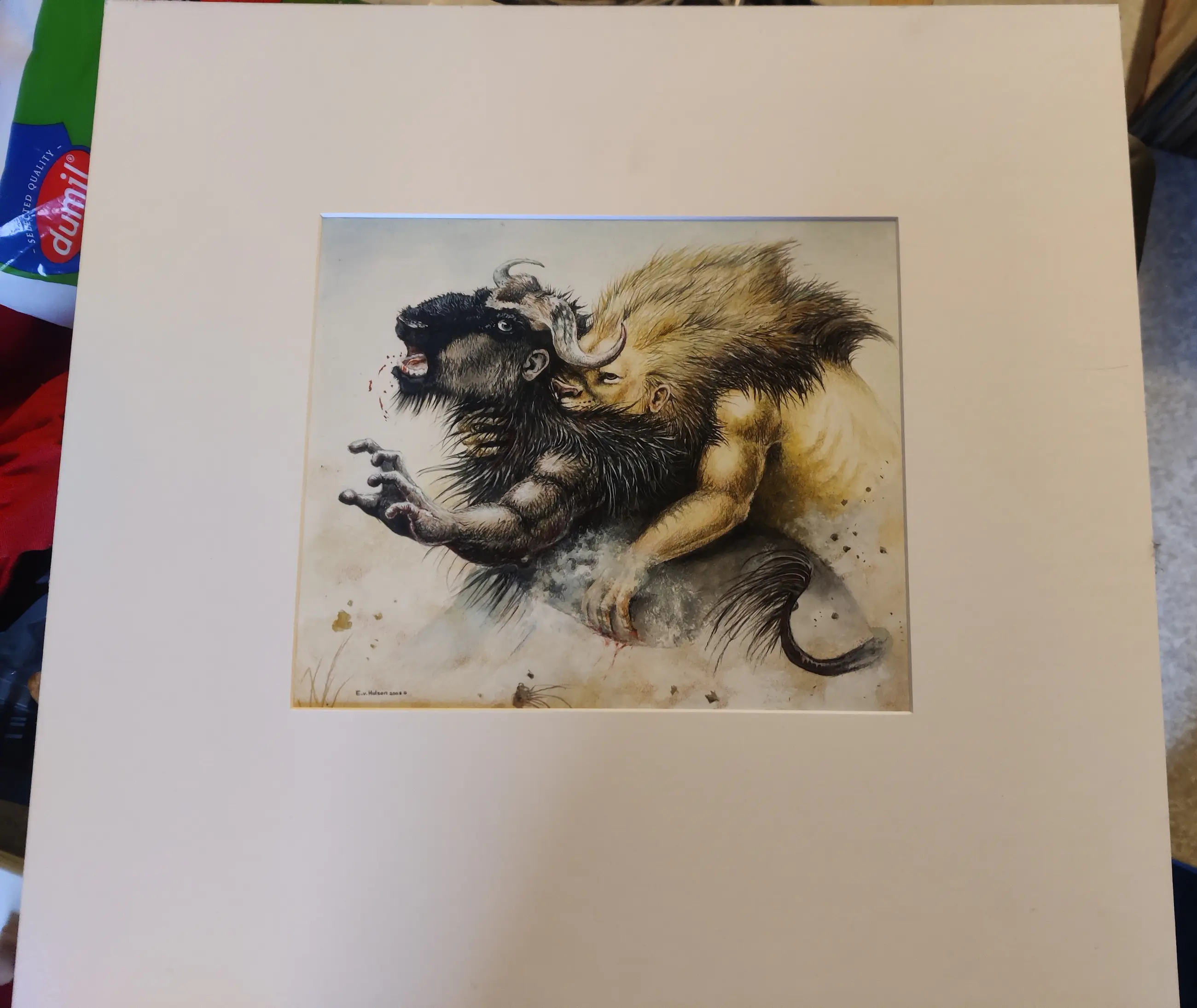 Dit is een mooi werk. Er zit een passe-partout omheen. Ik denk potlood en acrylverf