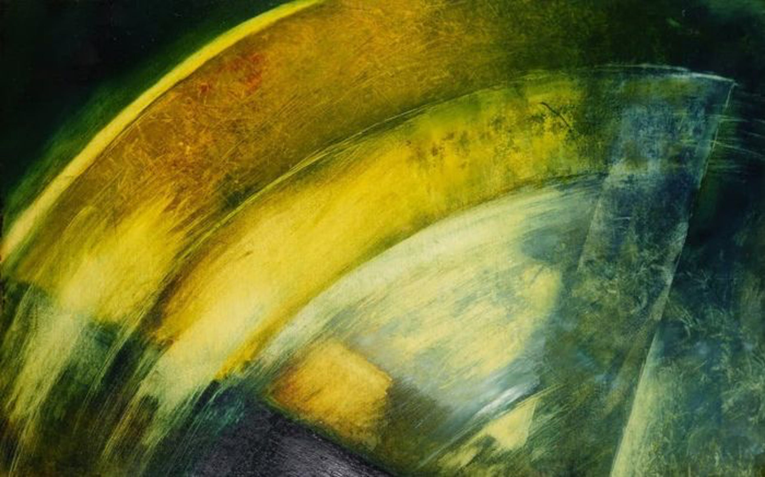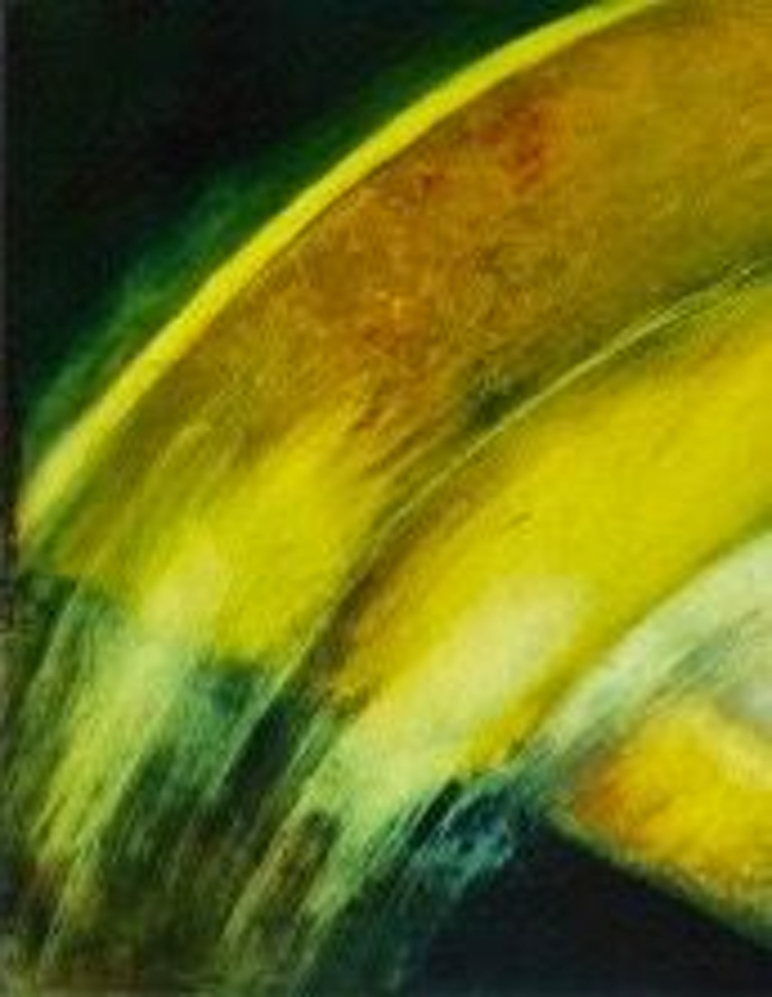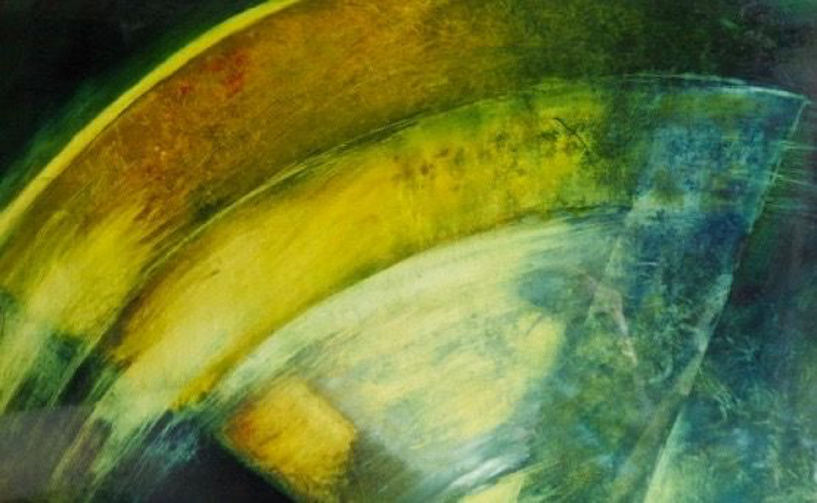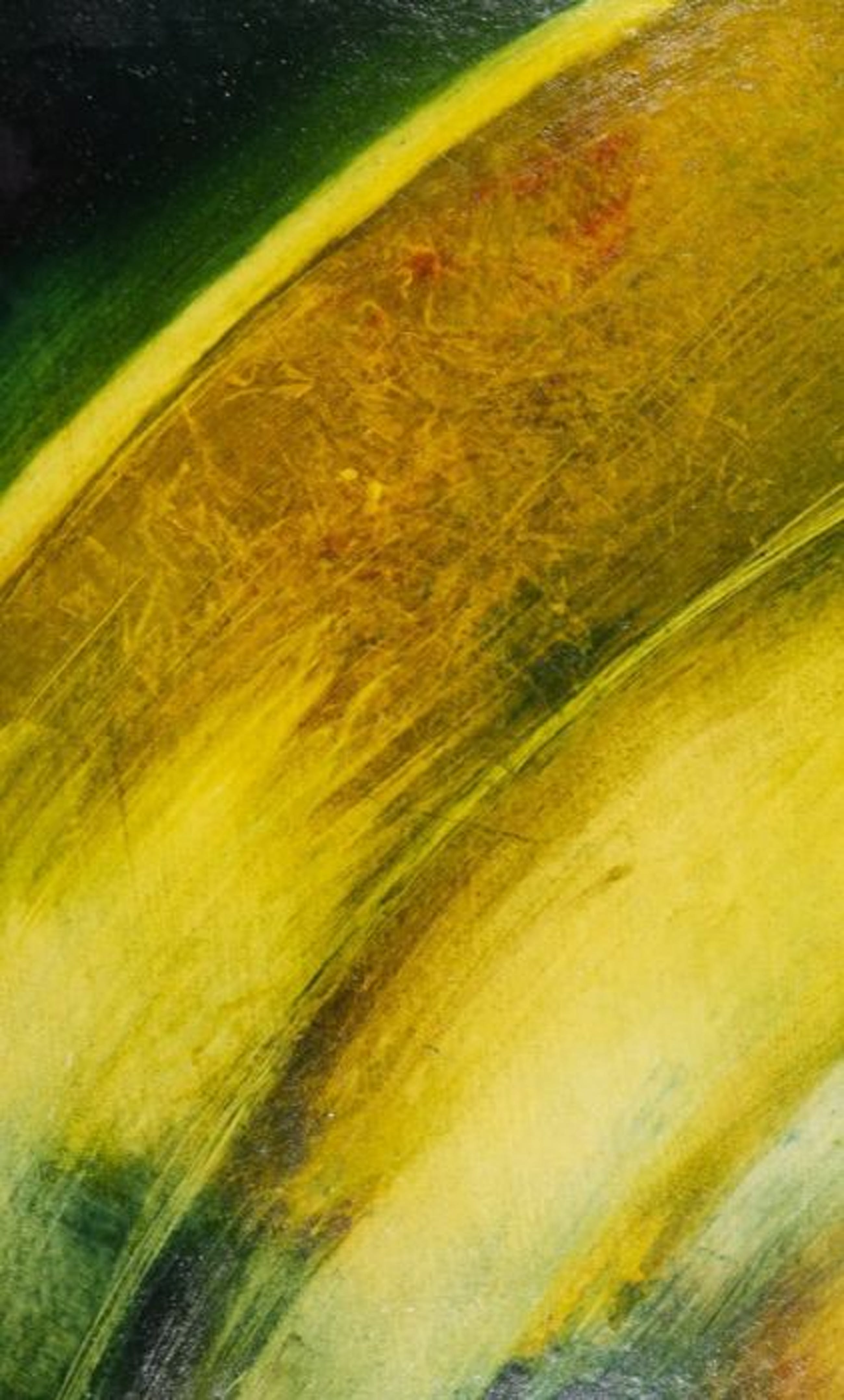 Karakteristiek abstract werk van deze Kunstenaar uit Amsterdam. Het werk heeft een mooie gelaagdheid en kleurstelling. In Zonnegeel en Zeegroen.Ingelijst achter glas in nette aluminium lijst.