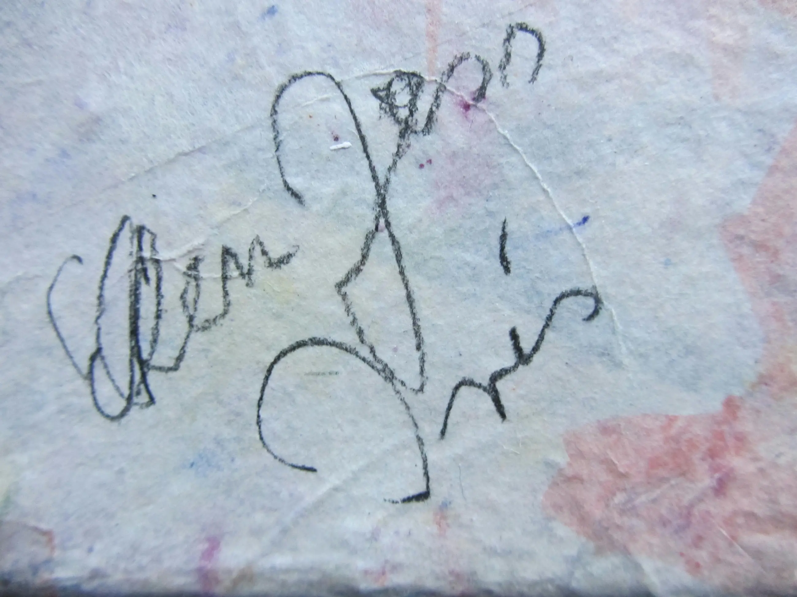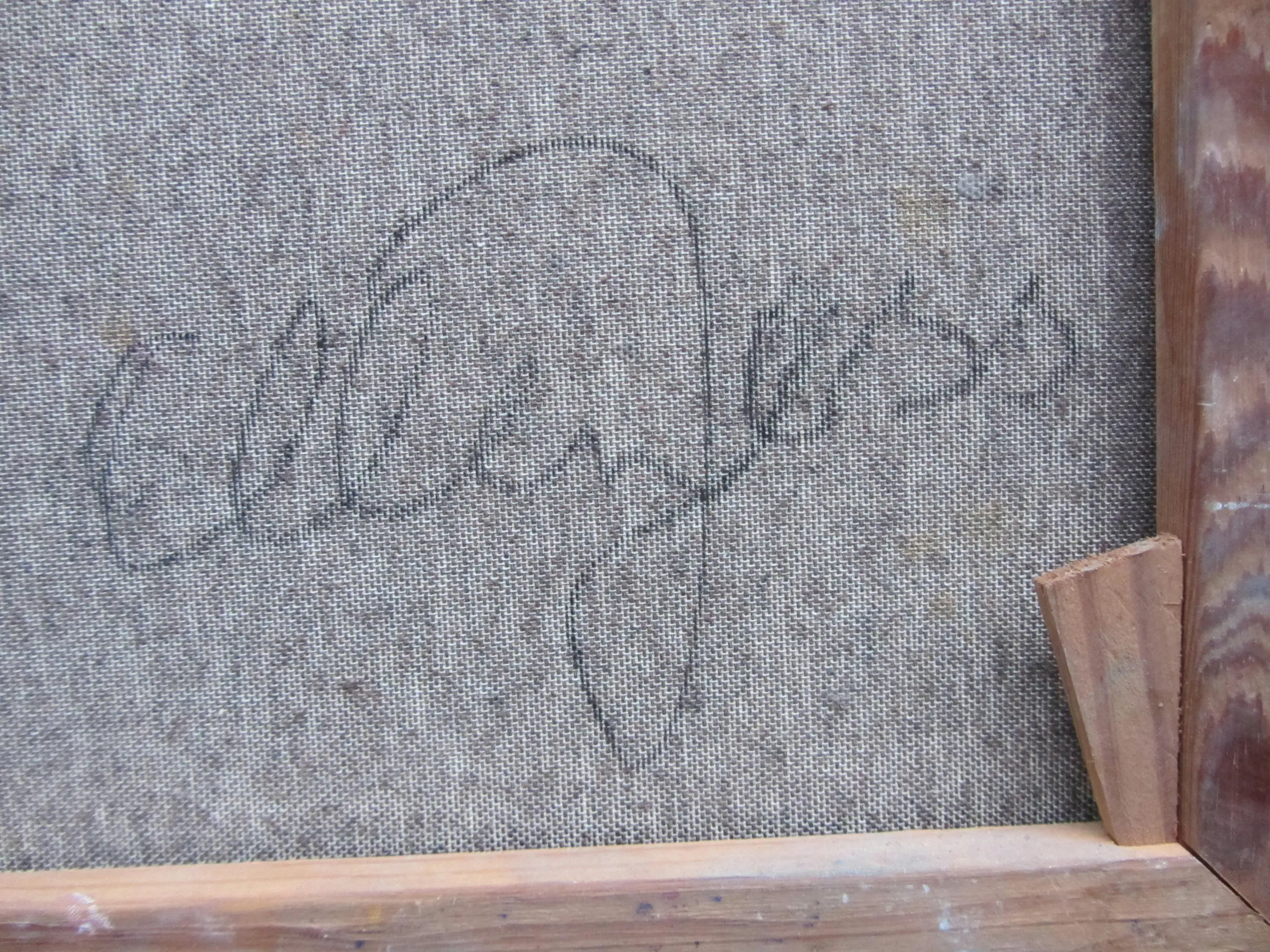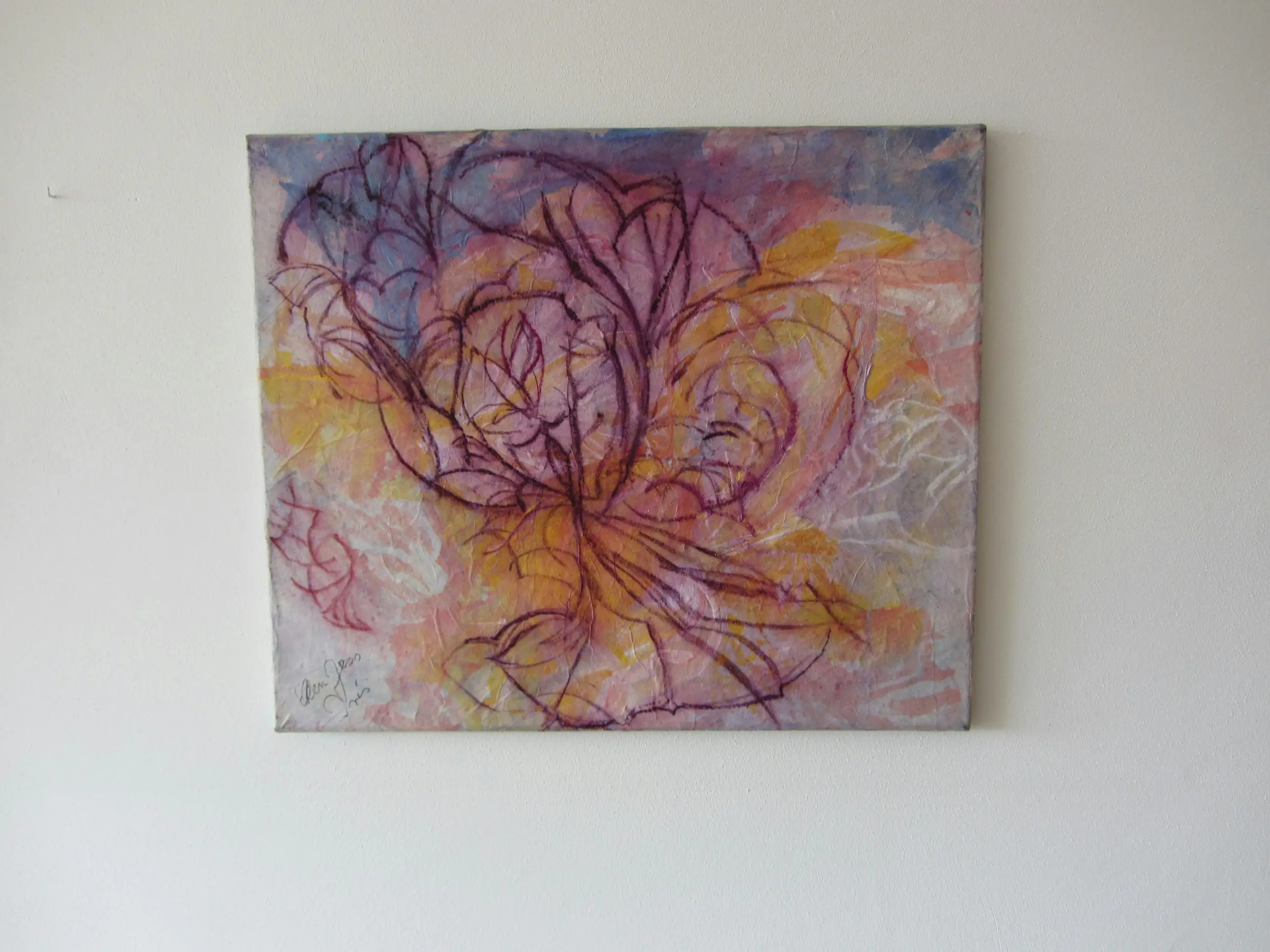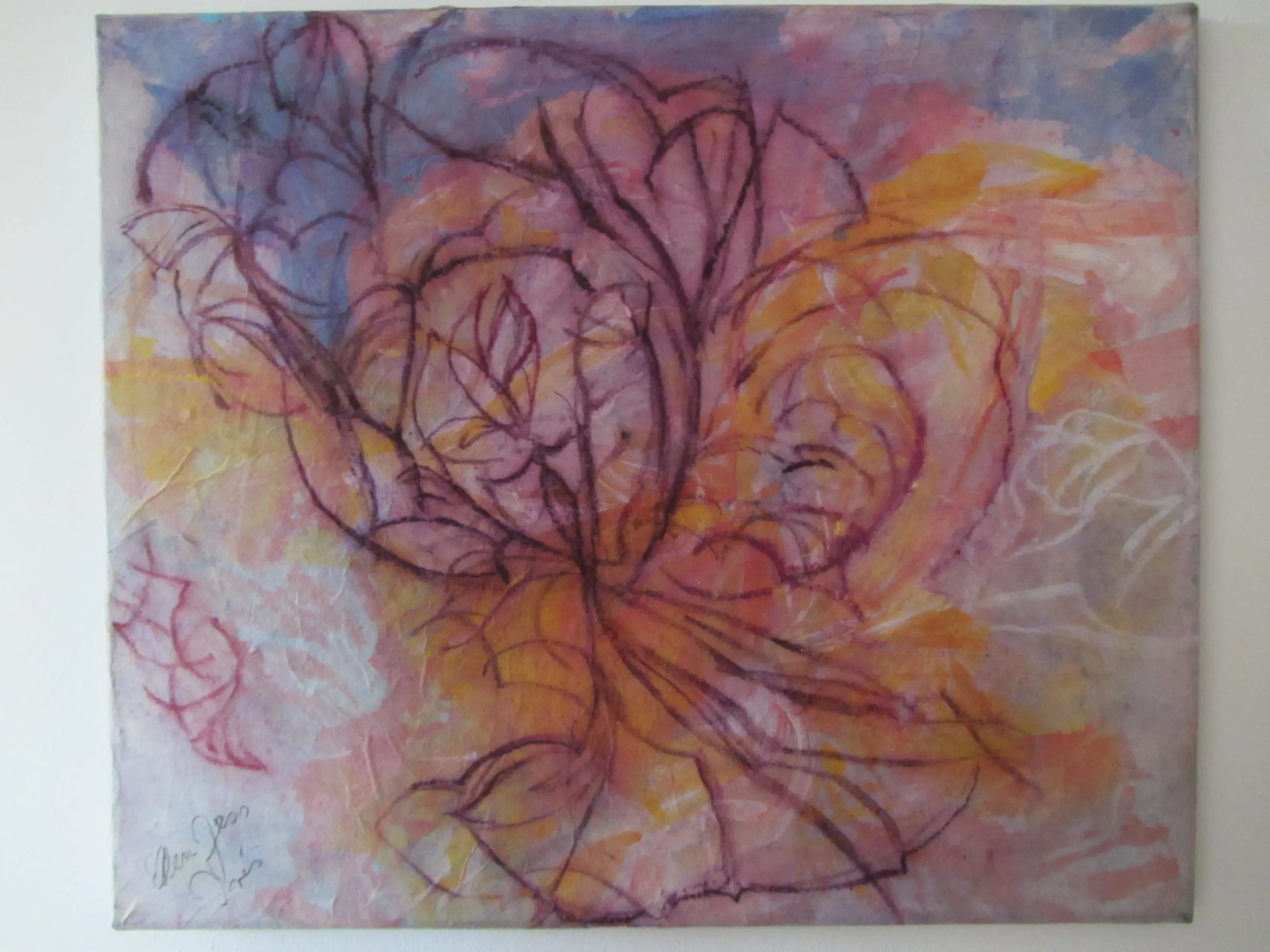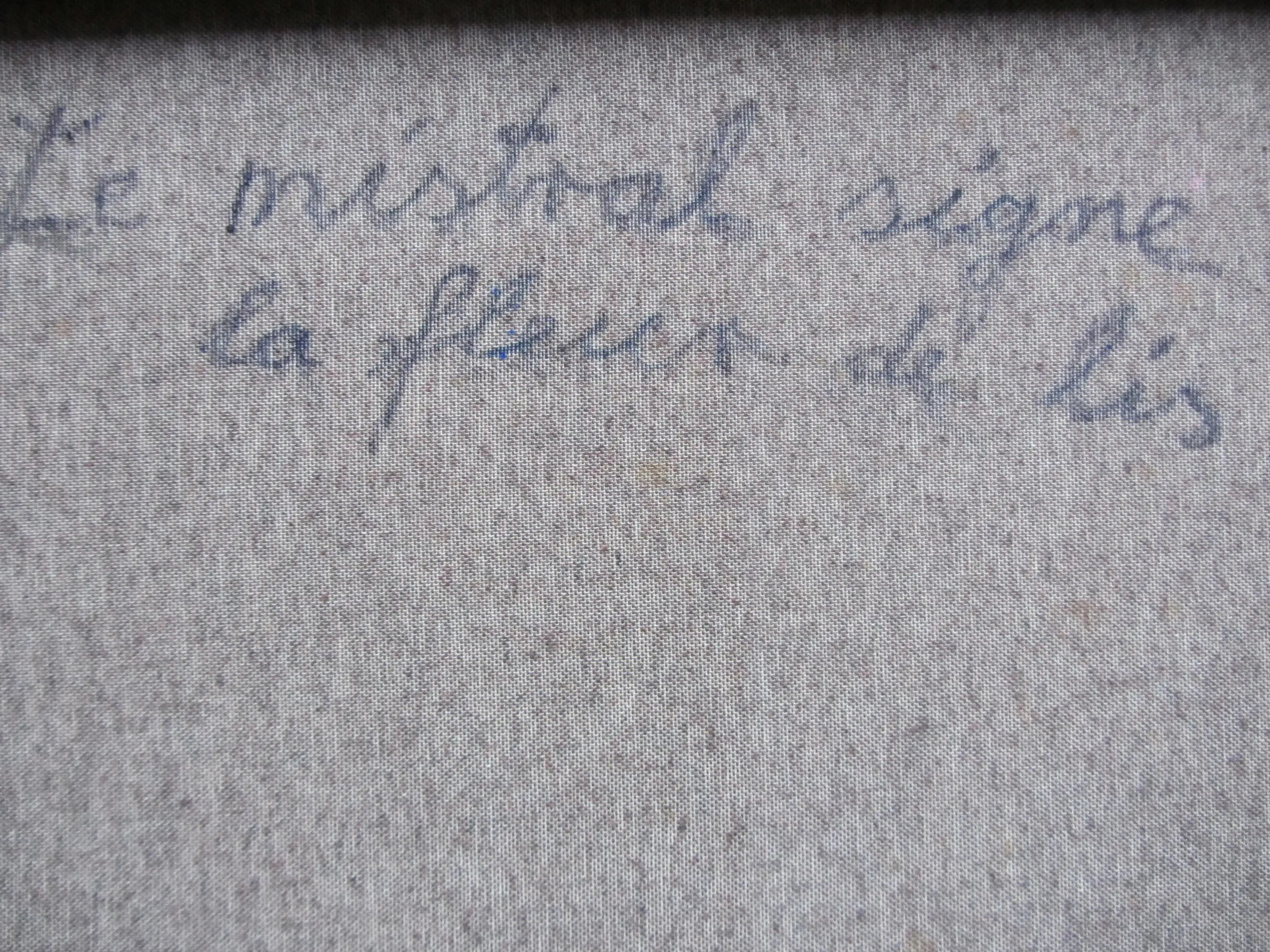 Kleurrijk werk op doek van Ellen Jess. Afmeting: hoogte 46 cm. breedte 54 cm. Titel: Le mistral signe la fleur de lis. Gesigneerd aan de voorkant linksonder en aan de achterkant rechtsonder. Schilderij is in zeer goede staat.