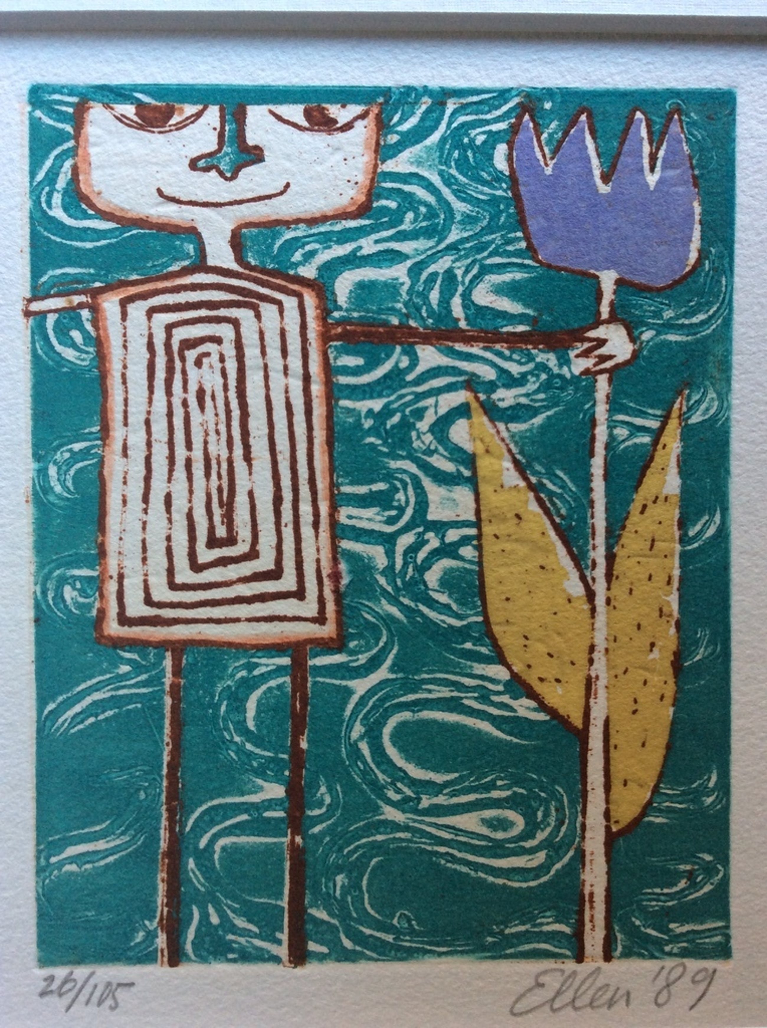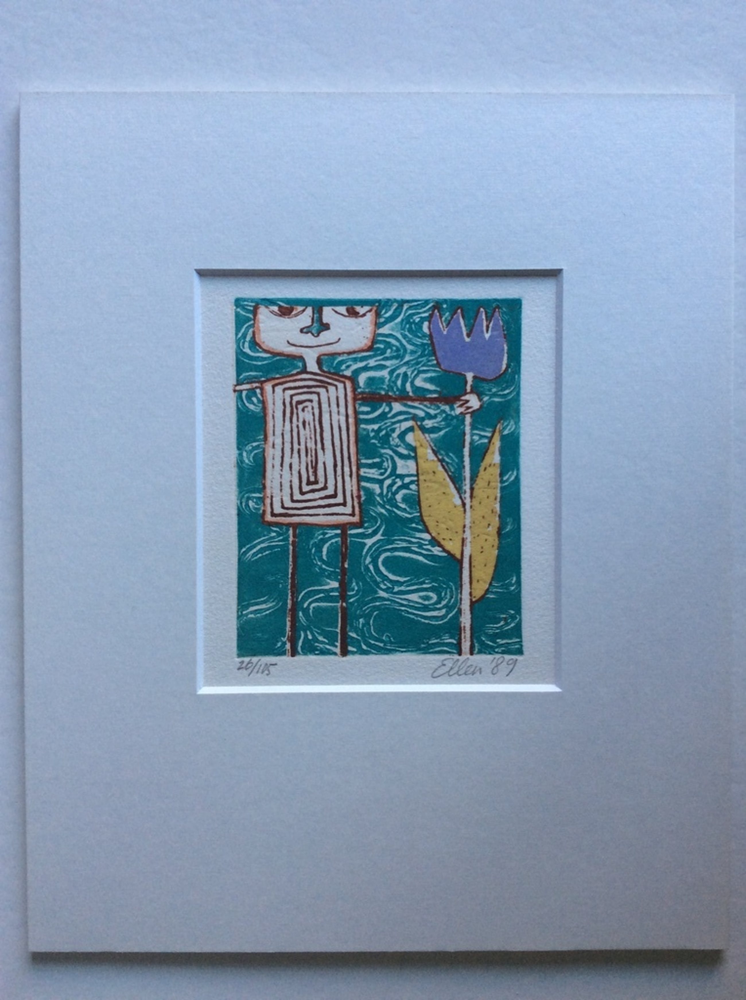 Van de Utrechtse kunstenares Ellen Koopmans: kleurenets, getiteld "Door grafiek gekleurde symboliek", uit 1989. Potlood gesigneerd en genummerd 26 uit oplage 105. Grootte met passe-partout 24 x 29 cm, ets 12 x 14 cm.