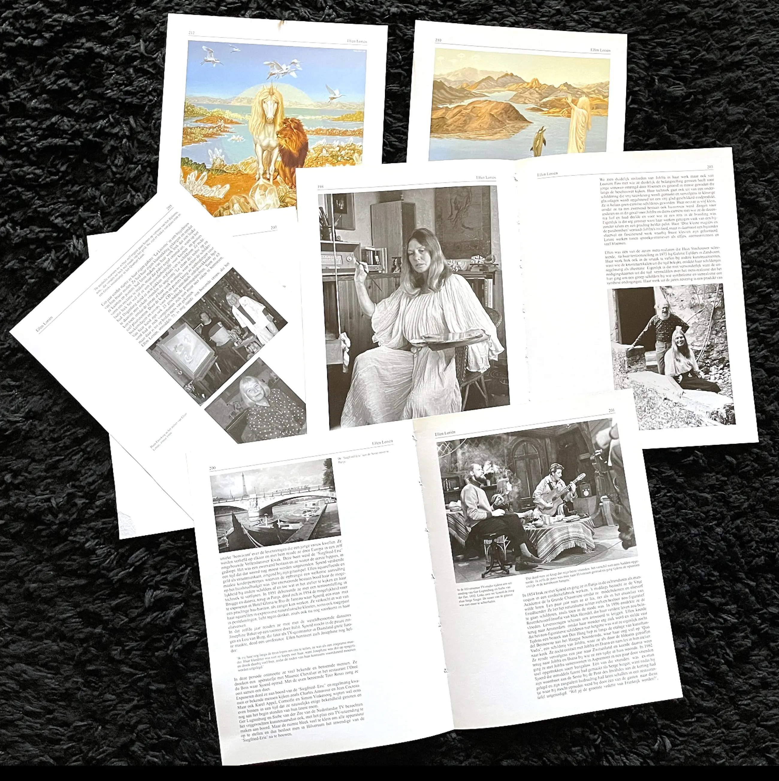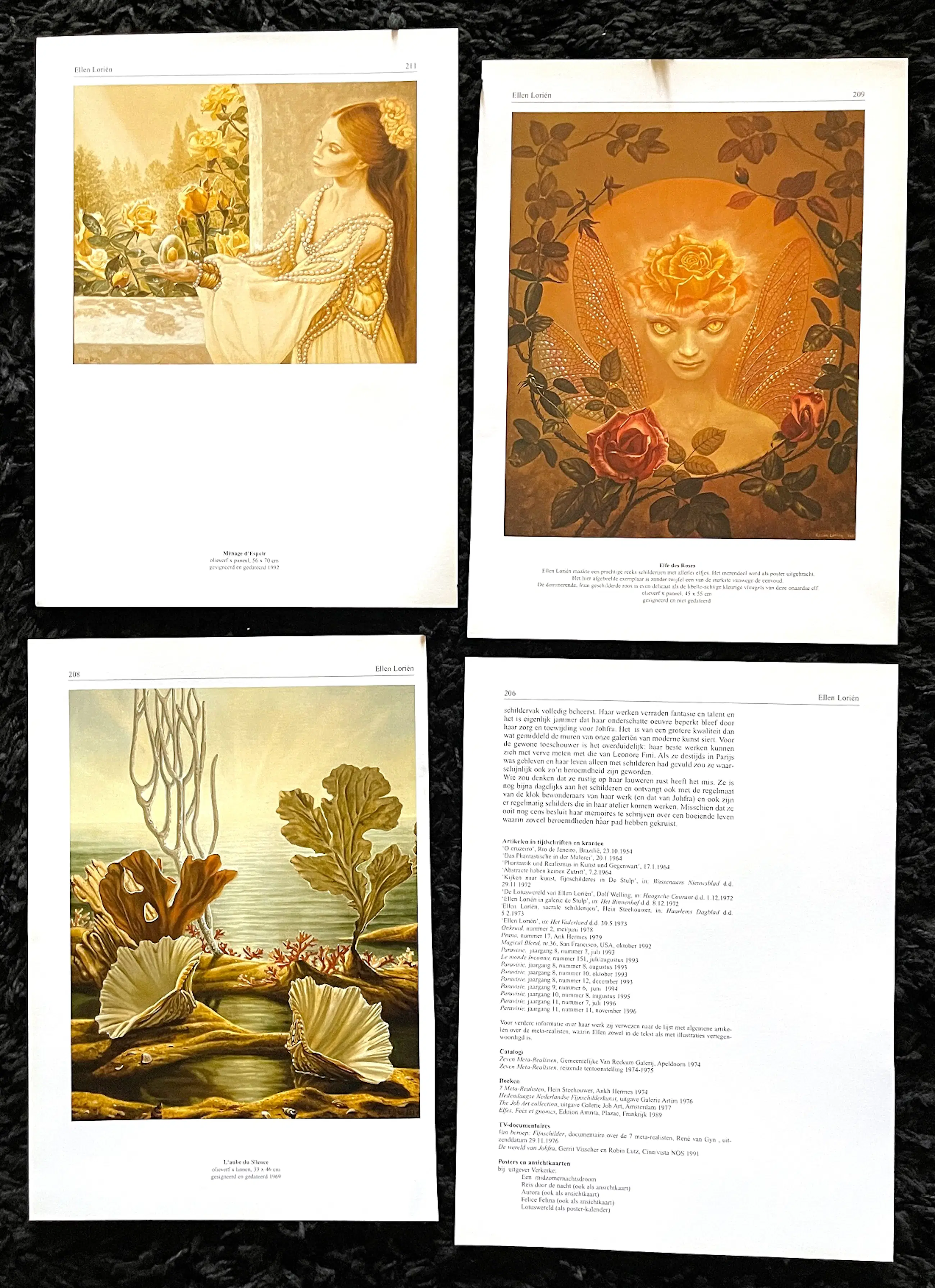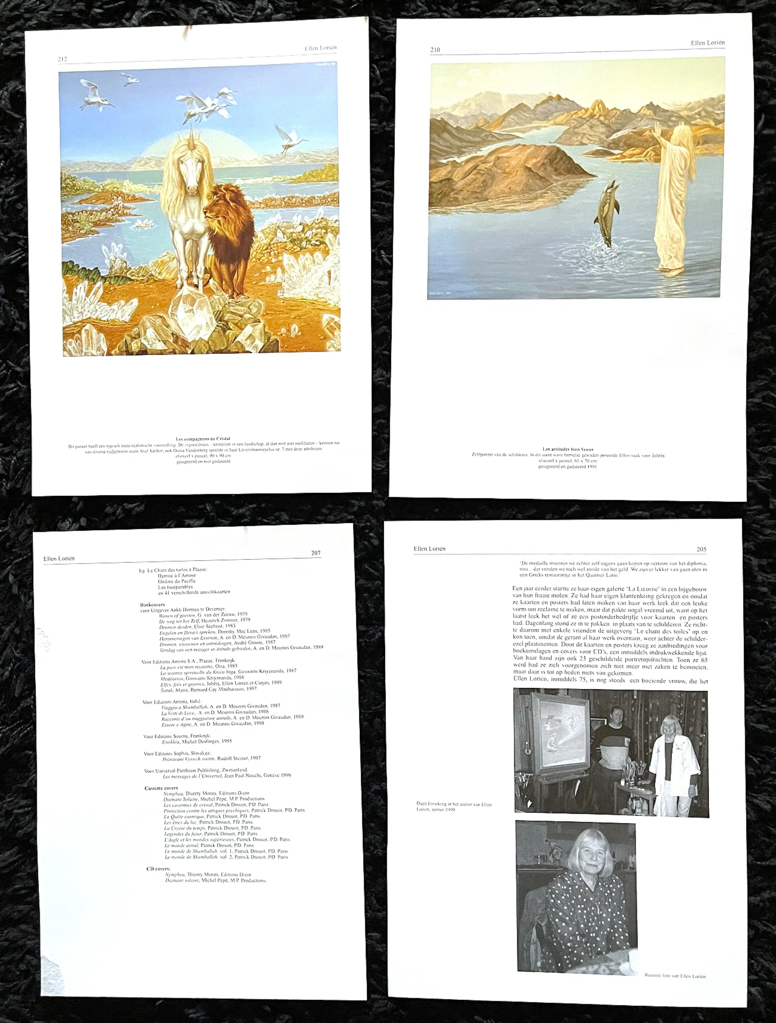 Een serie van ongeveer 10 pagina's uit een metarealistisch monografieboek met ELLEN LORIEN Artworks. Veel prenten op volledige pagina in kleur en andere in zwart-wit. Met ELLEN LORIENs biografie en beschrijvingen van haar werk. Taal van de teksten: Nederlands Geschatte pagina-afmetingen: A4-formaat (ongeveer 22x30 cm) Afdrukken worden beschermd verzonden met stevig karton, zodat ze niet buigen of beschadigd raken tijdens het transport. Een must-have voor elke ELLEN LORIEN-verzamelaar of -fan!