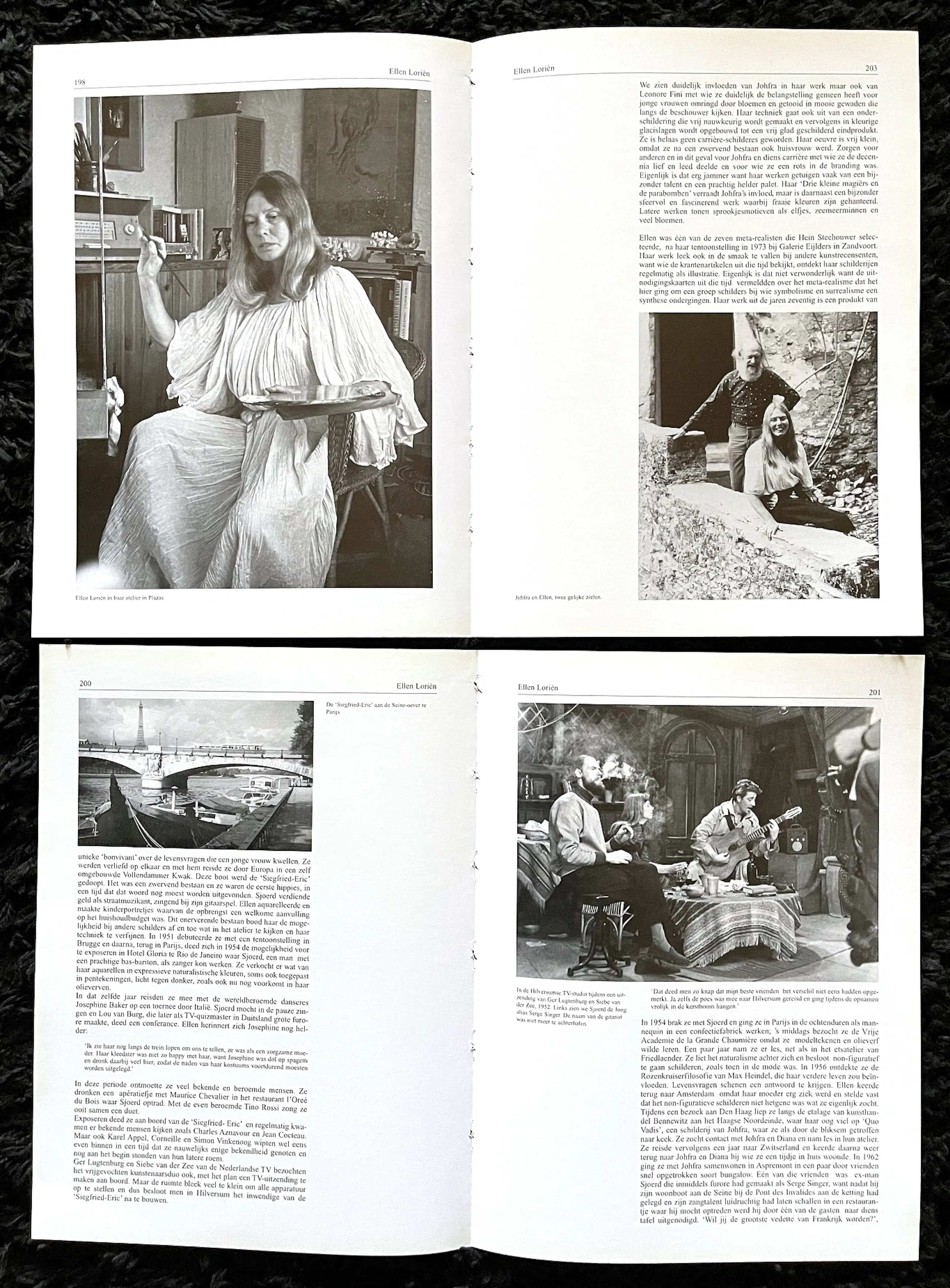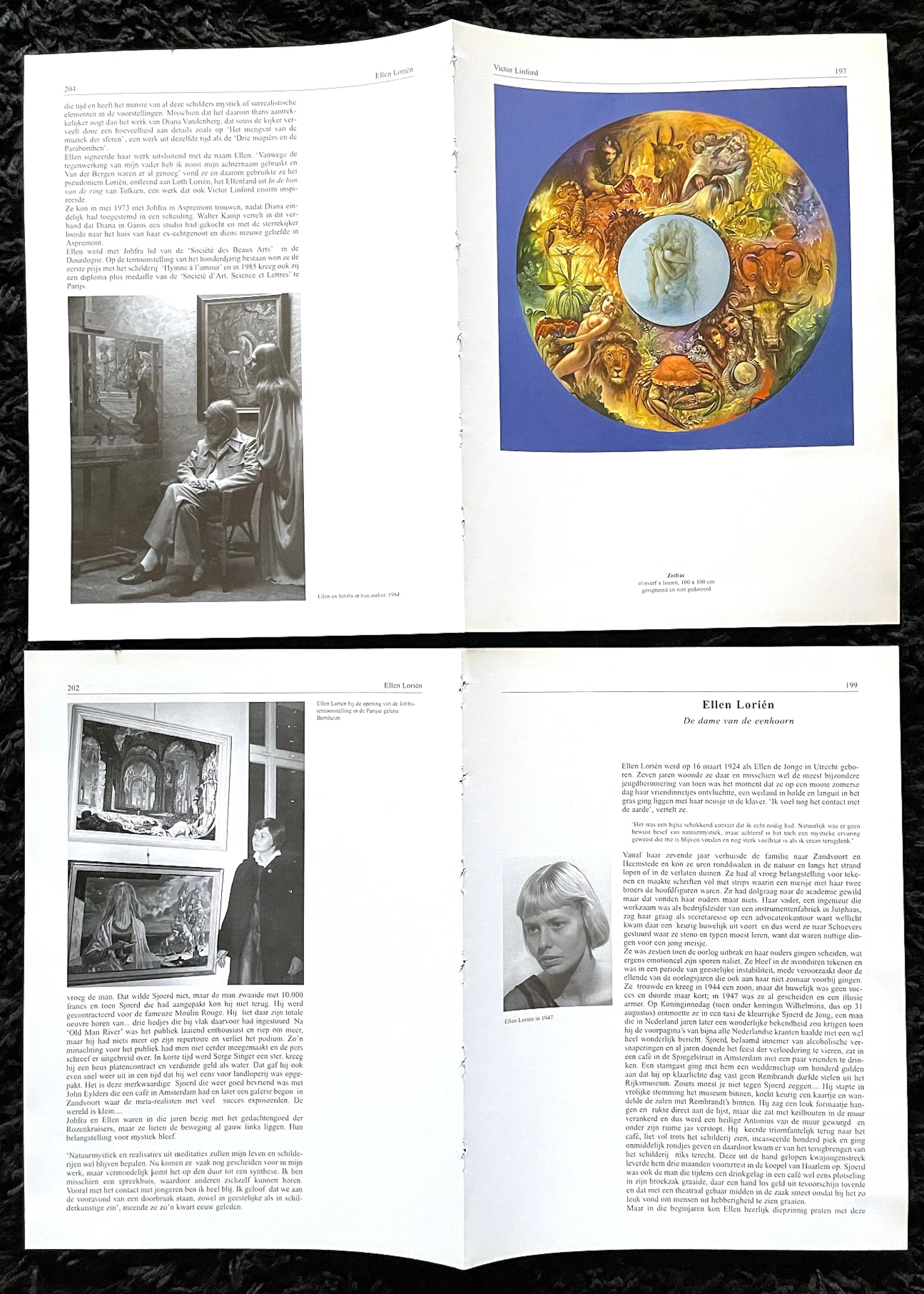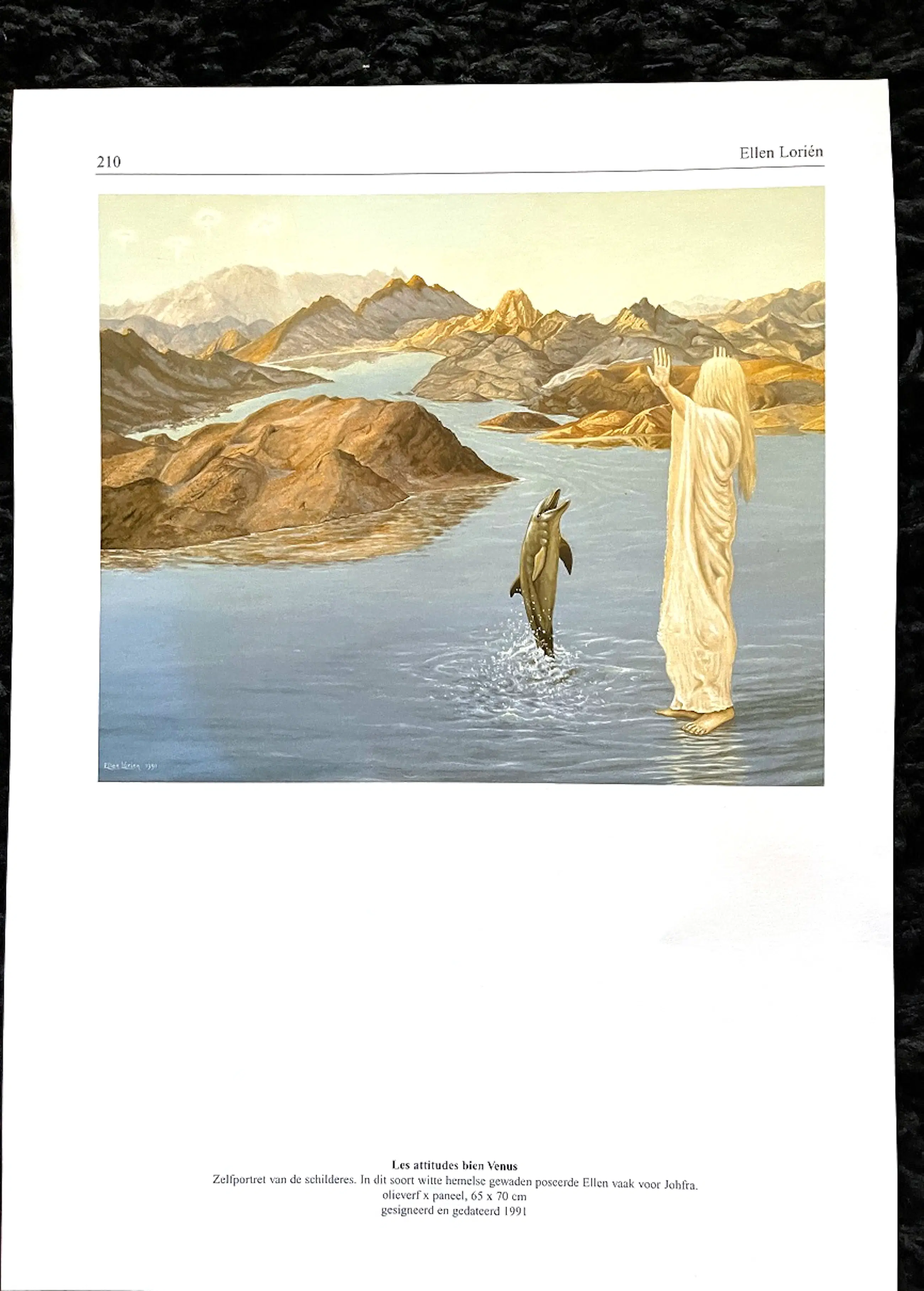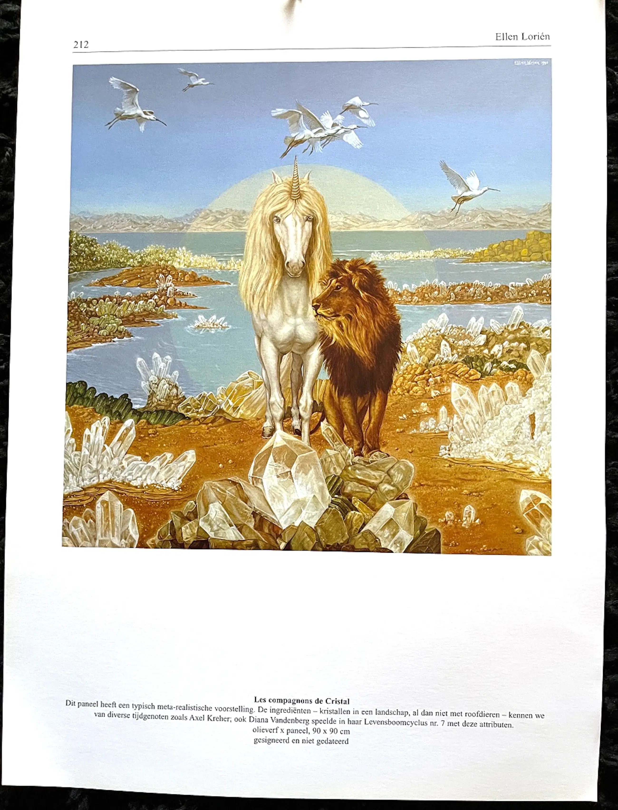 Een serie van ongeveer 10 pagina's uit een metarealistisch monografieboek met ELLEN LORIEN Artworks. Veel prenten op volledige pagina in kleur en andere in zwart-wit. Met ELLEN LORIENs biografie en beschrijvingen van haar werk. Taal van de teksten: Nederlands Geschatte pagina-afmetingen: A4-formaat (ongeveer 22x30 cm) Afdrukken worden beschermd verzonden met stevig karton, zodat ze niet buigen of beschadigd raken tijdens het transport. Een must-have voor elke ELLEN LORIEN-verzamelaar of -fan!