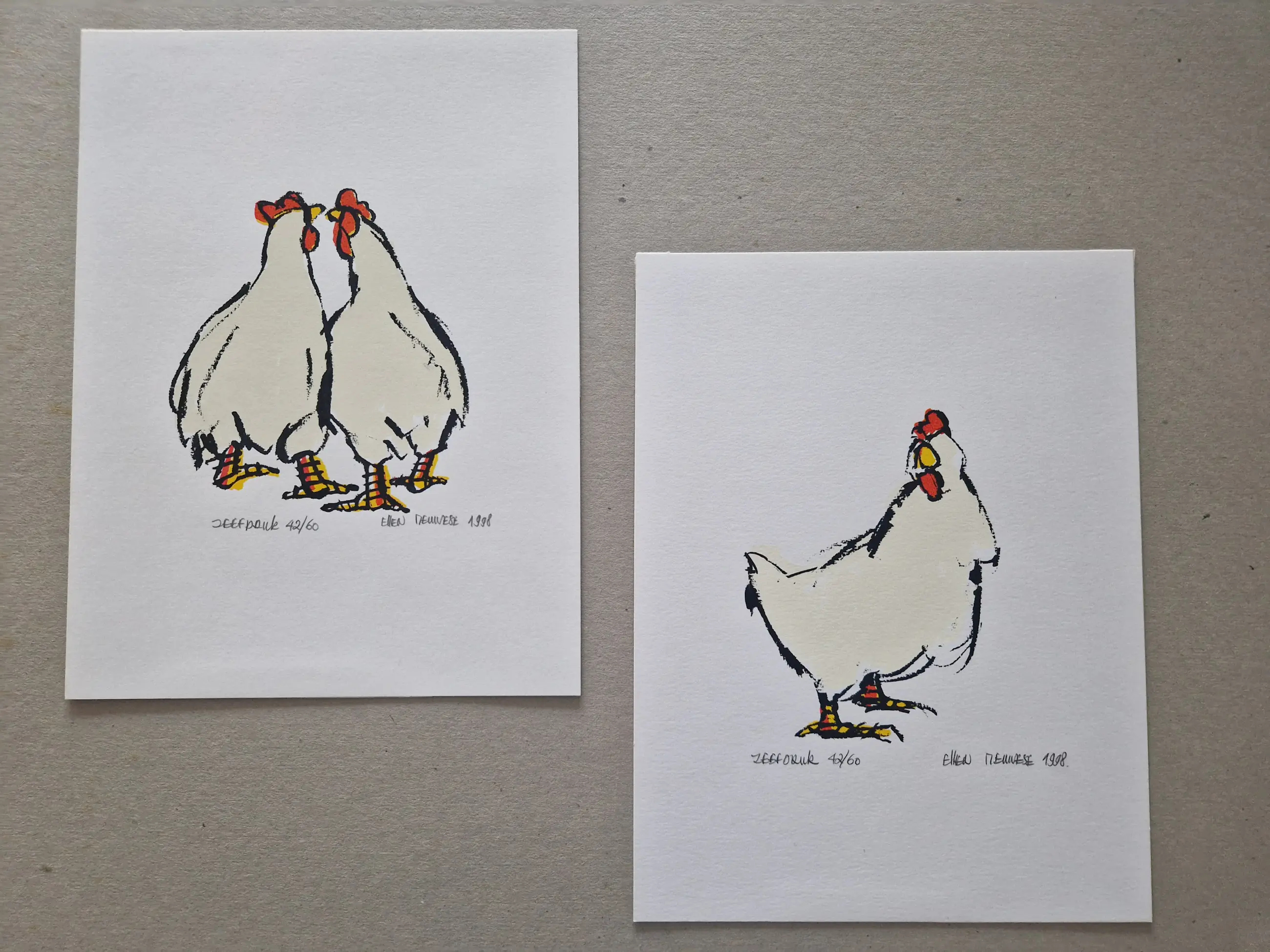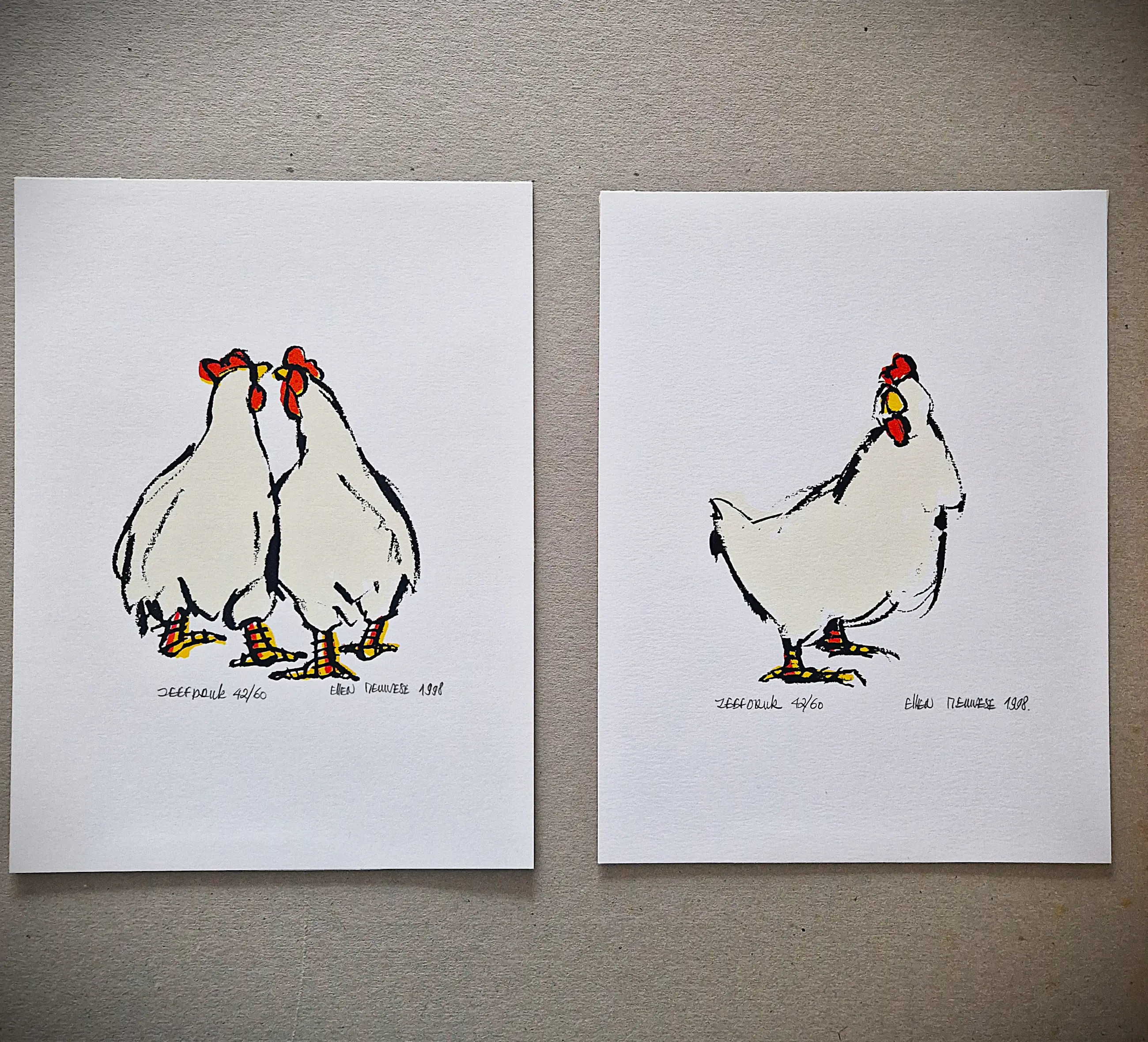 Ondanks de druk om te verkopen, hield de kersverse weduwe zich totaal niet bezig met de verkoopbaarheid van haar werk. “Bezig zijn in mijn atelier diende op dat moment vooral als uitlaatklep. Ik voelde me down en wilde mezelf omringen met vrolijkheid. De knallende kleuren gaven me een reden om te blijven knokken.” Door de schetsen vertelde Meuwese haar verhaal, ze kon haar emoties erin kwijt.