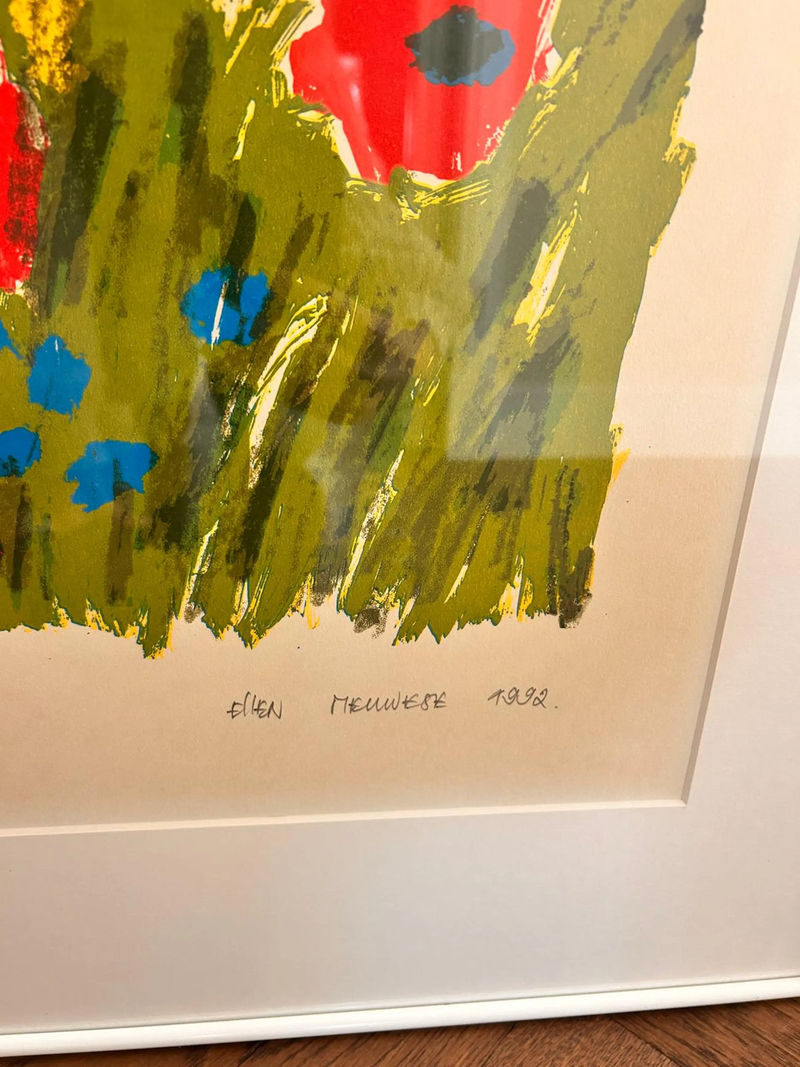 Een bloemen zeefdruk van Ellen Meuwese uit 1992 met witte lijst. In zeer goede staat.