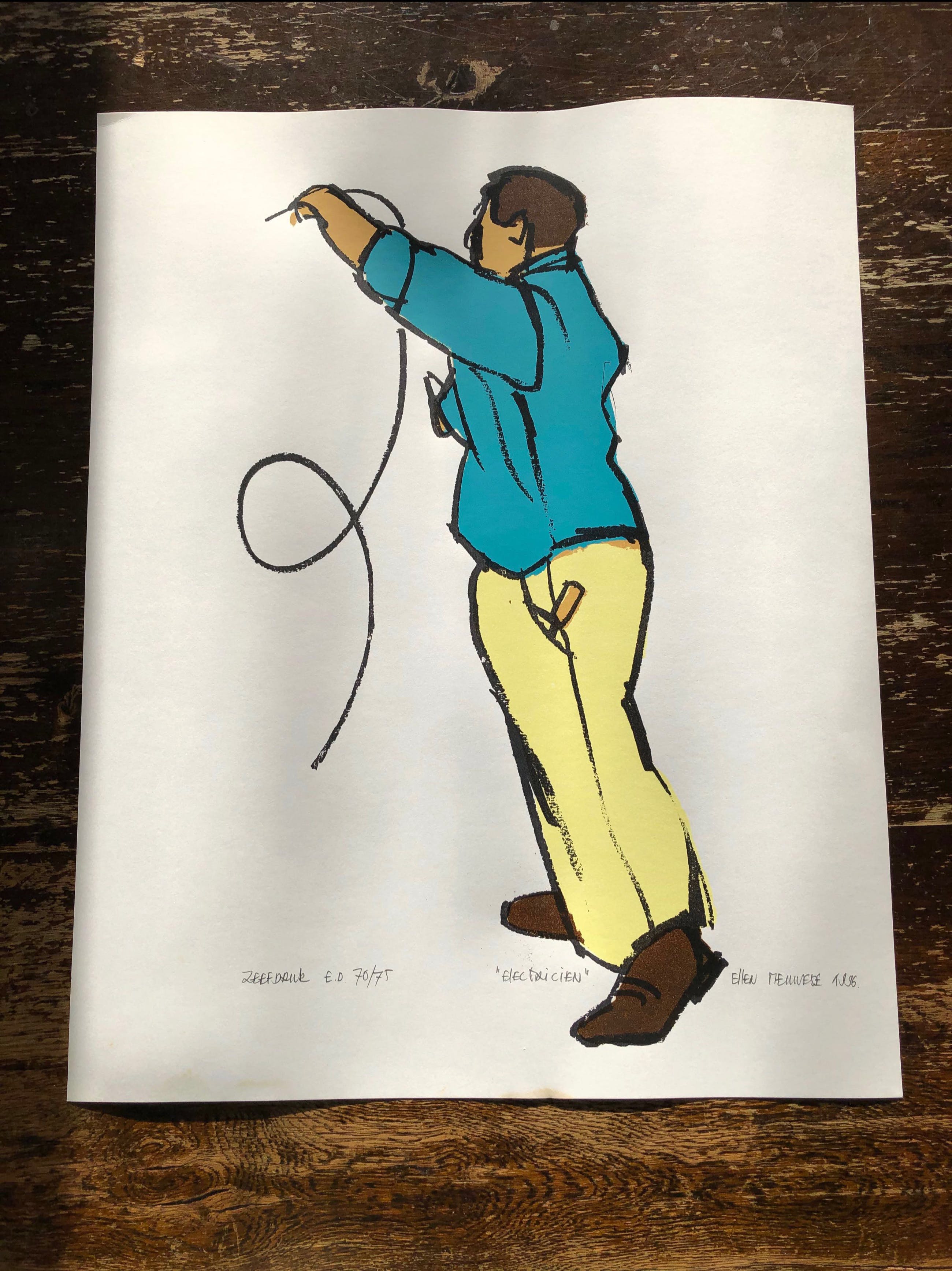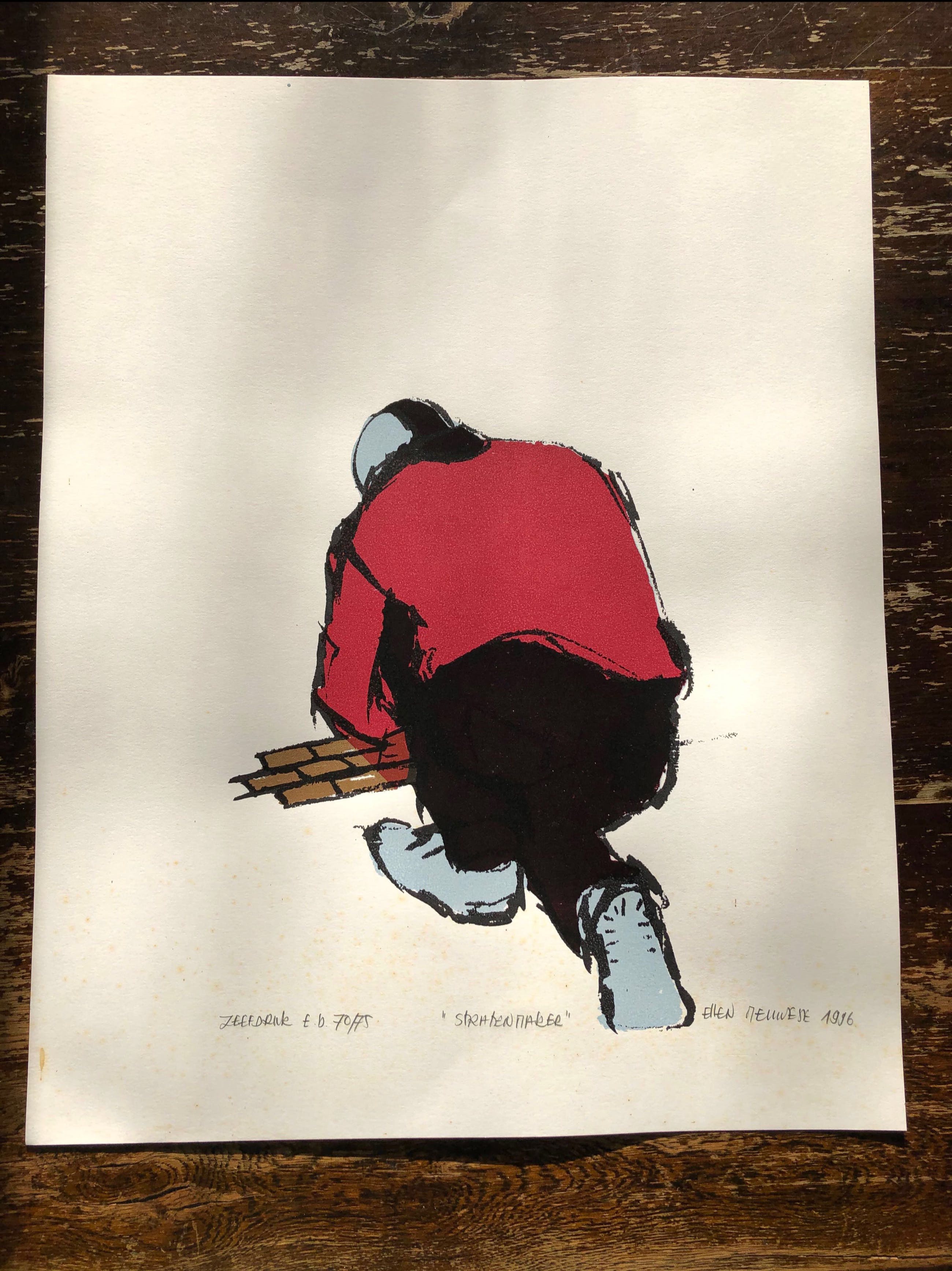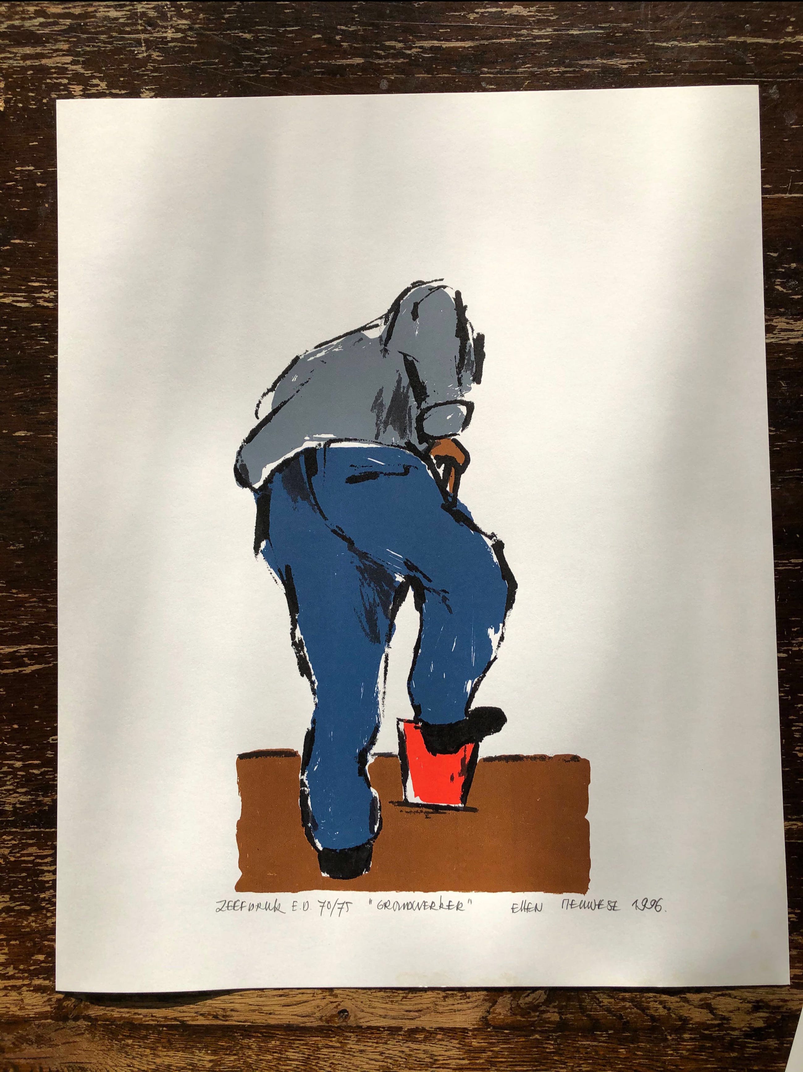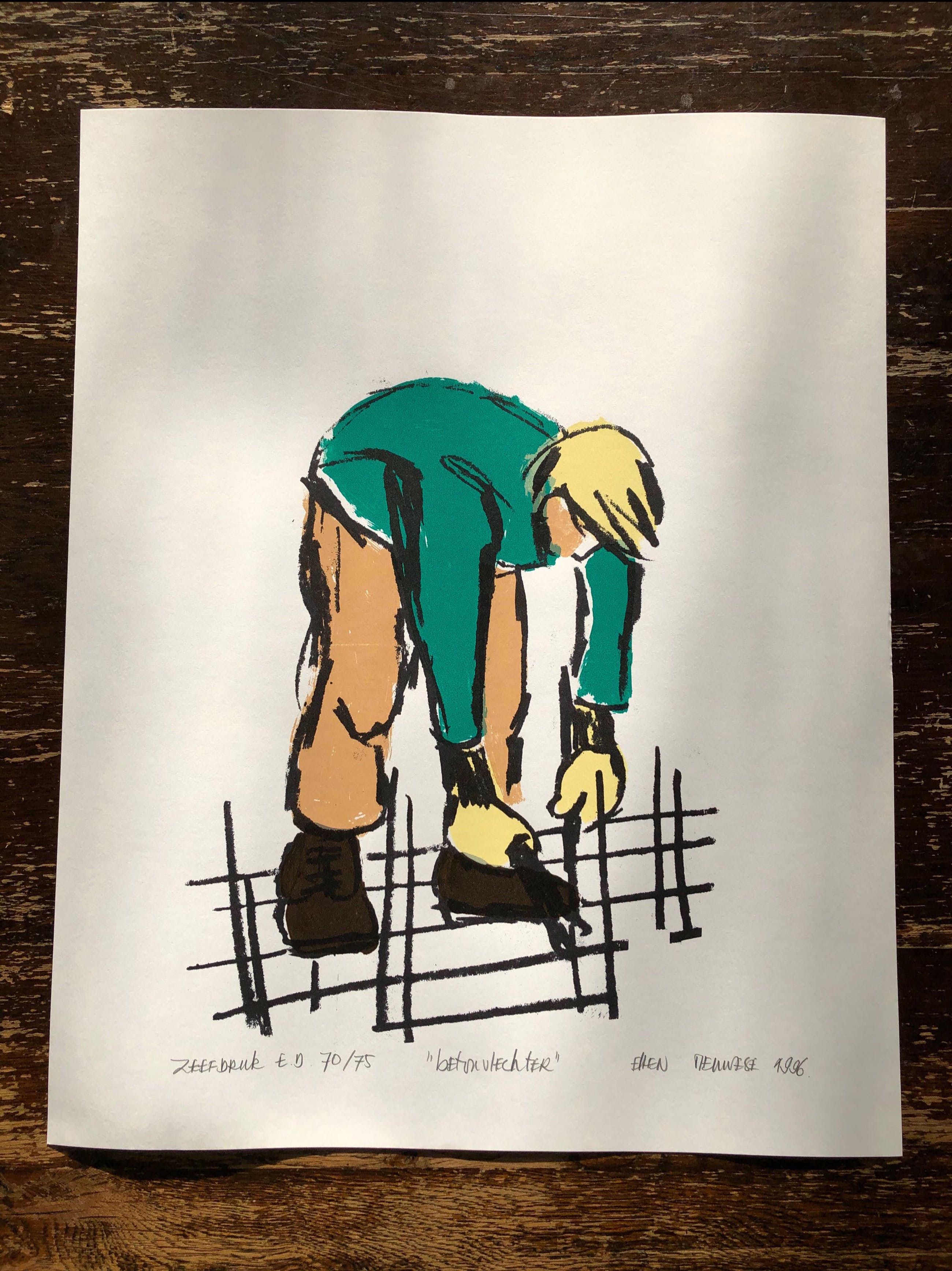 12 zeefdrukken van bouwvakkers in een door de kunstenaar zelf vervaardigd en ook gesigneerd kistje