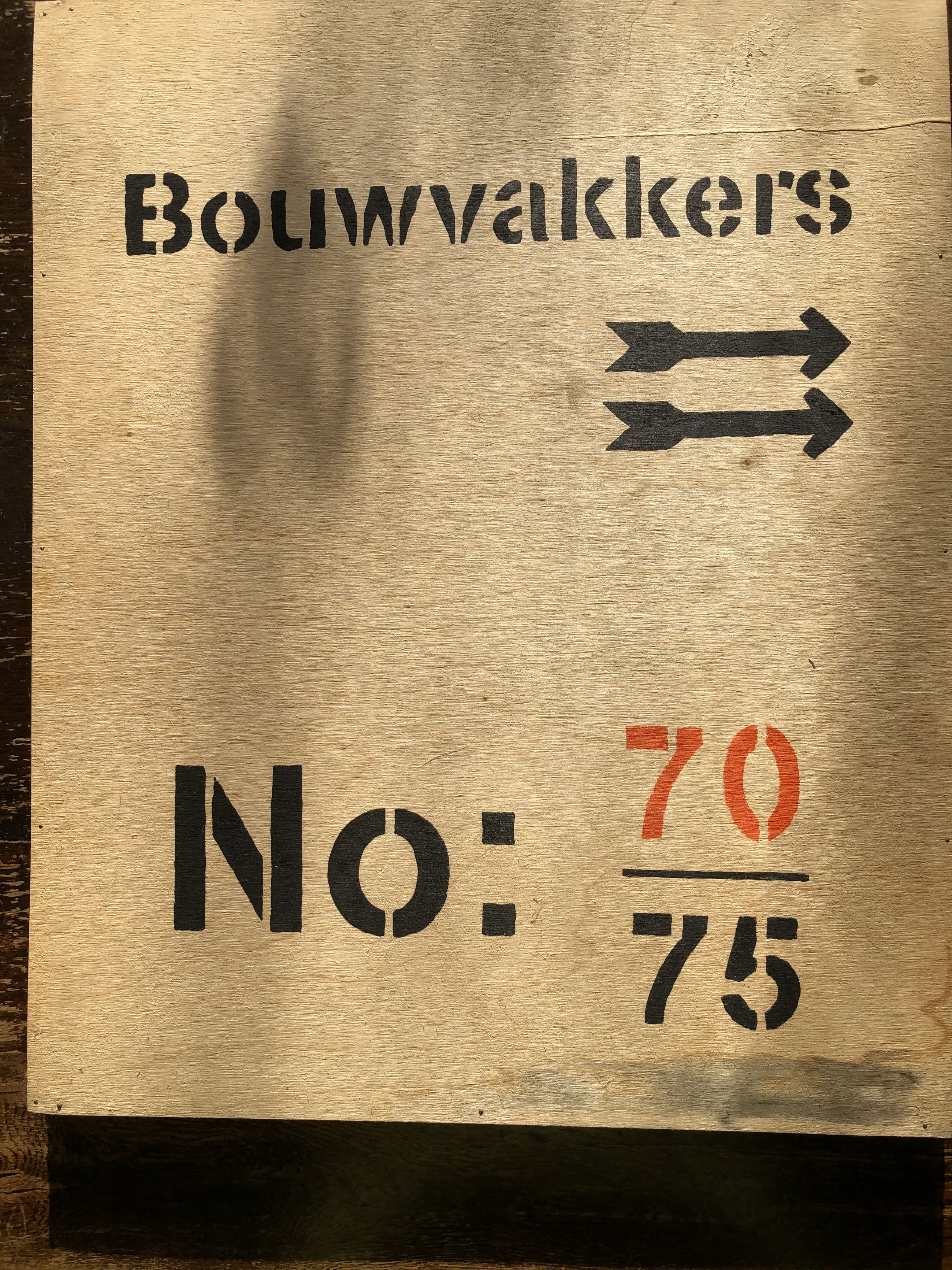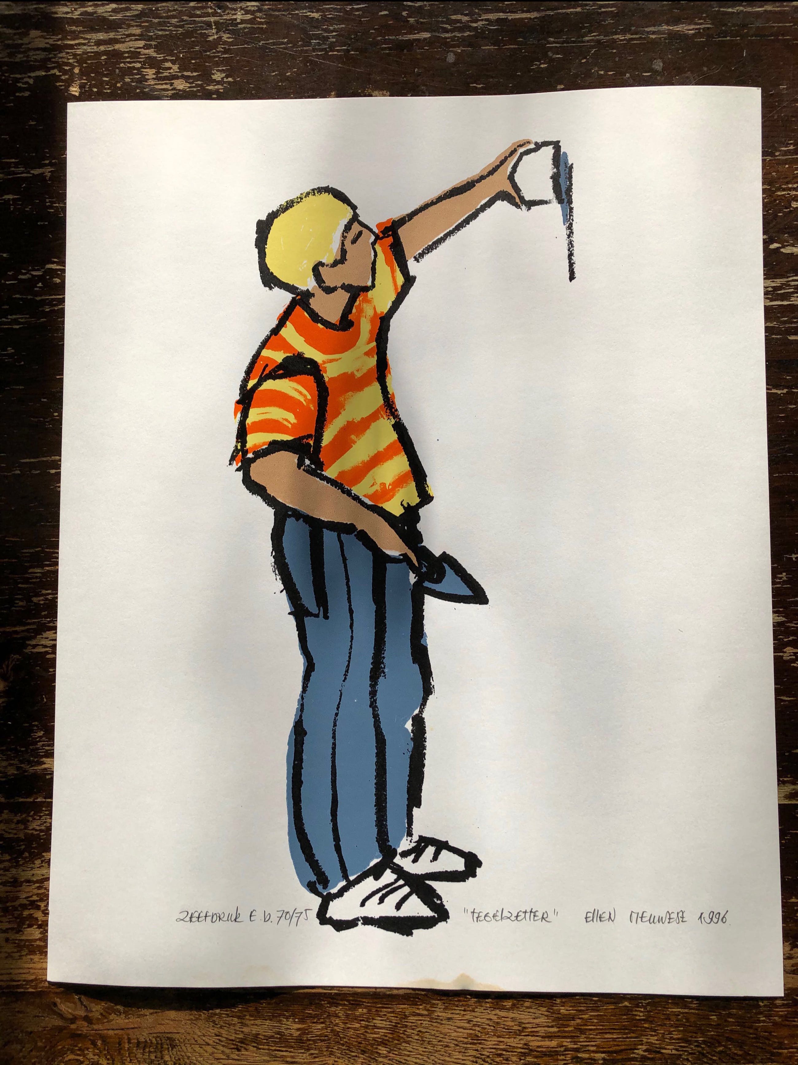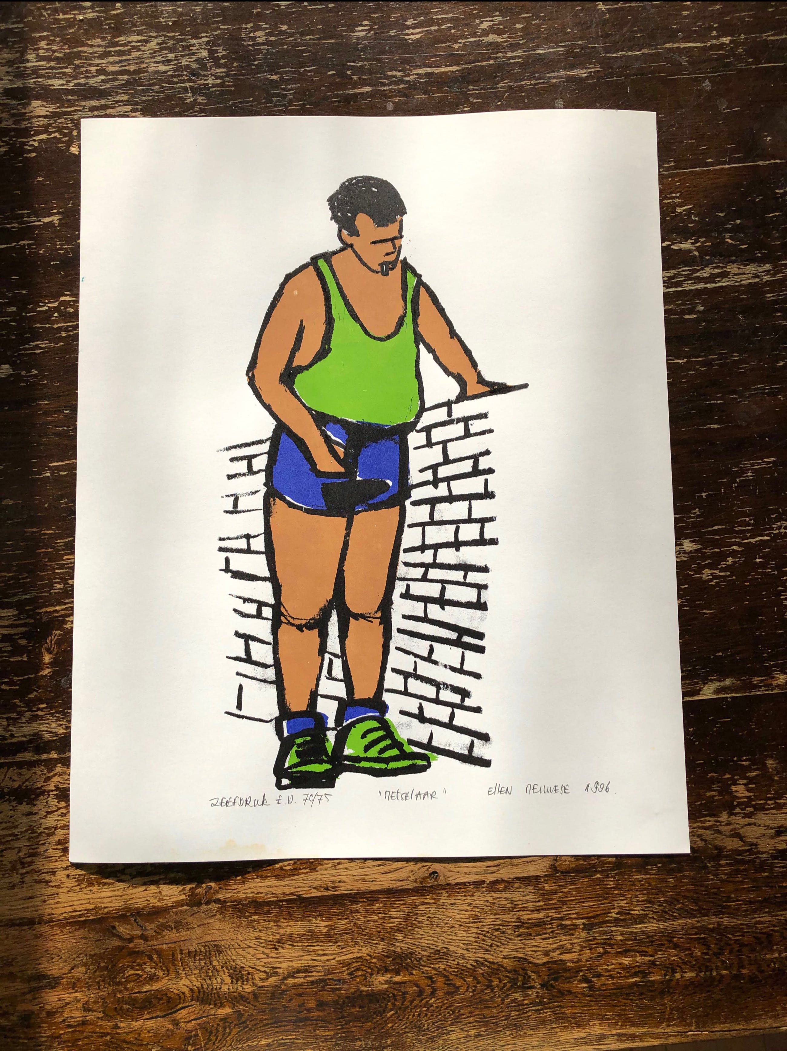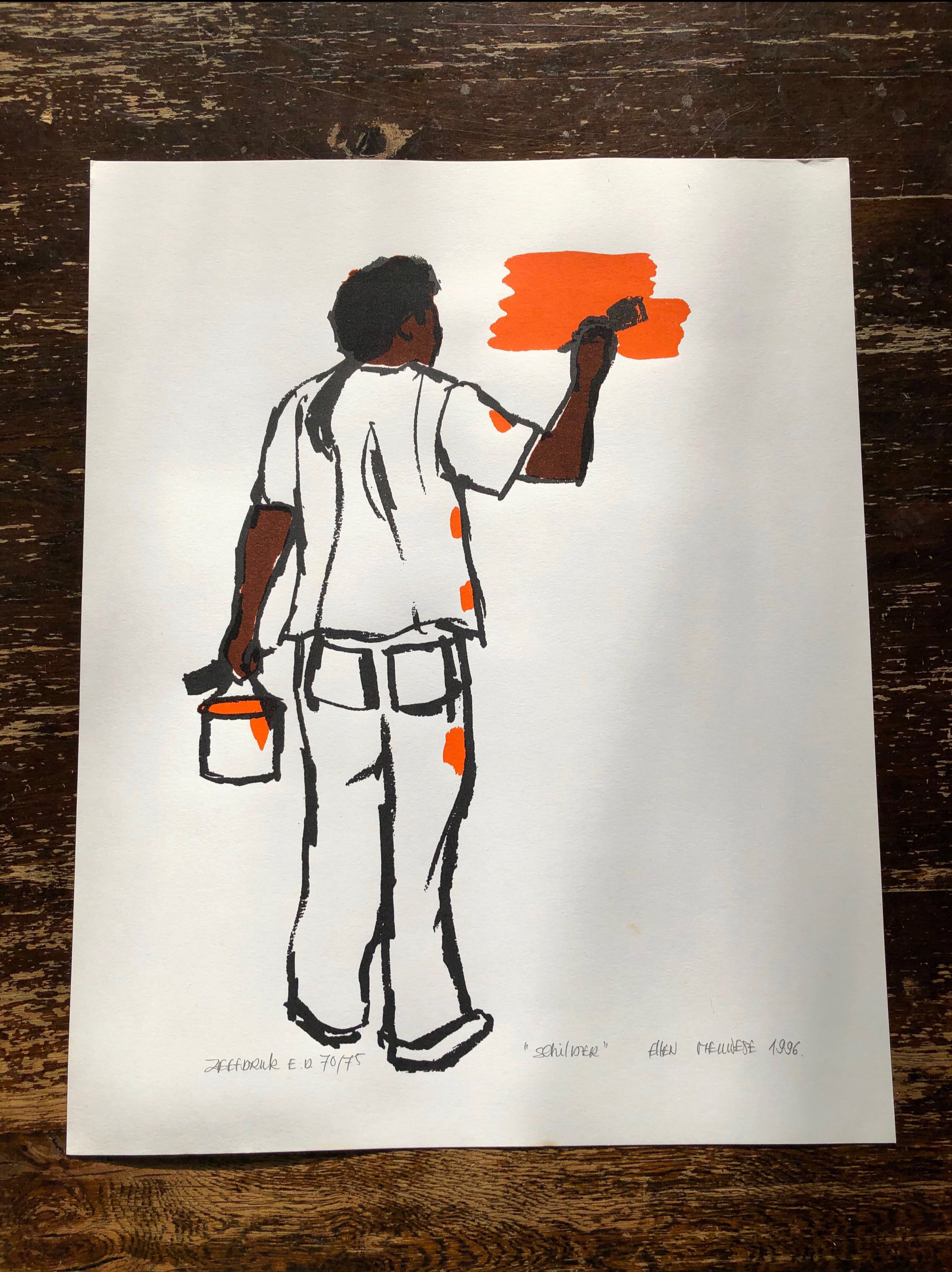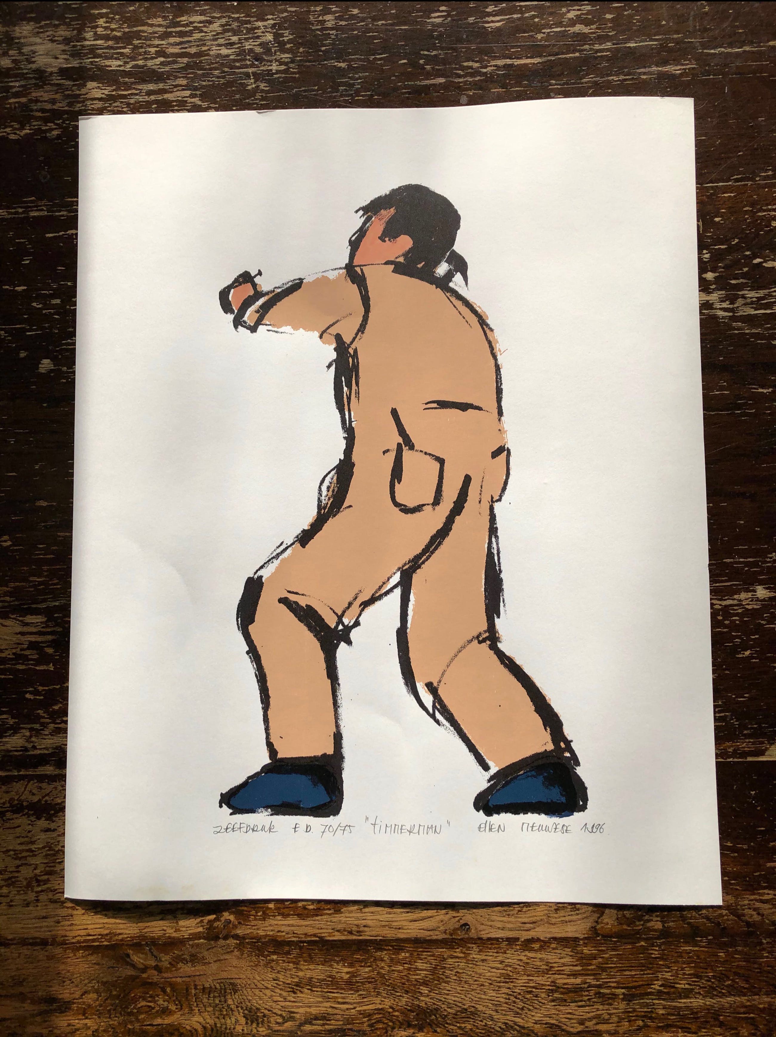 12 zeefdrukken van bouwvakkers in een door de kunstenaar zelf vervaardigd en ook gesigneerd kistje