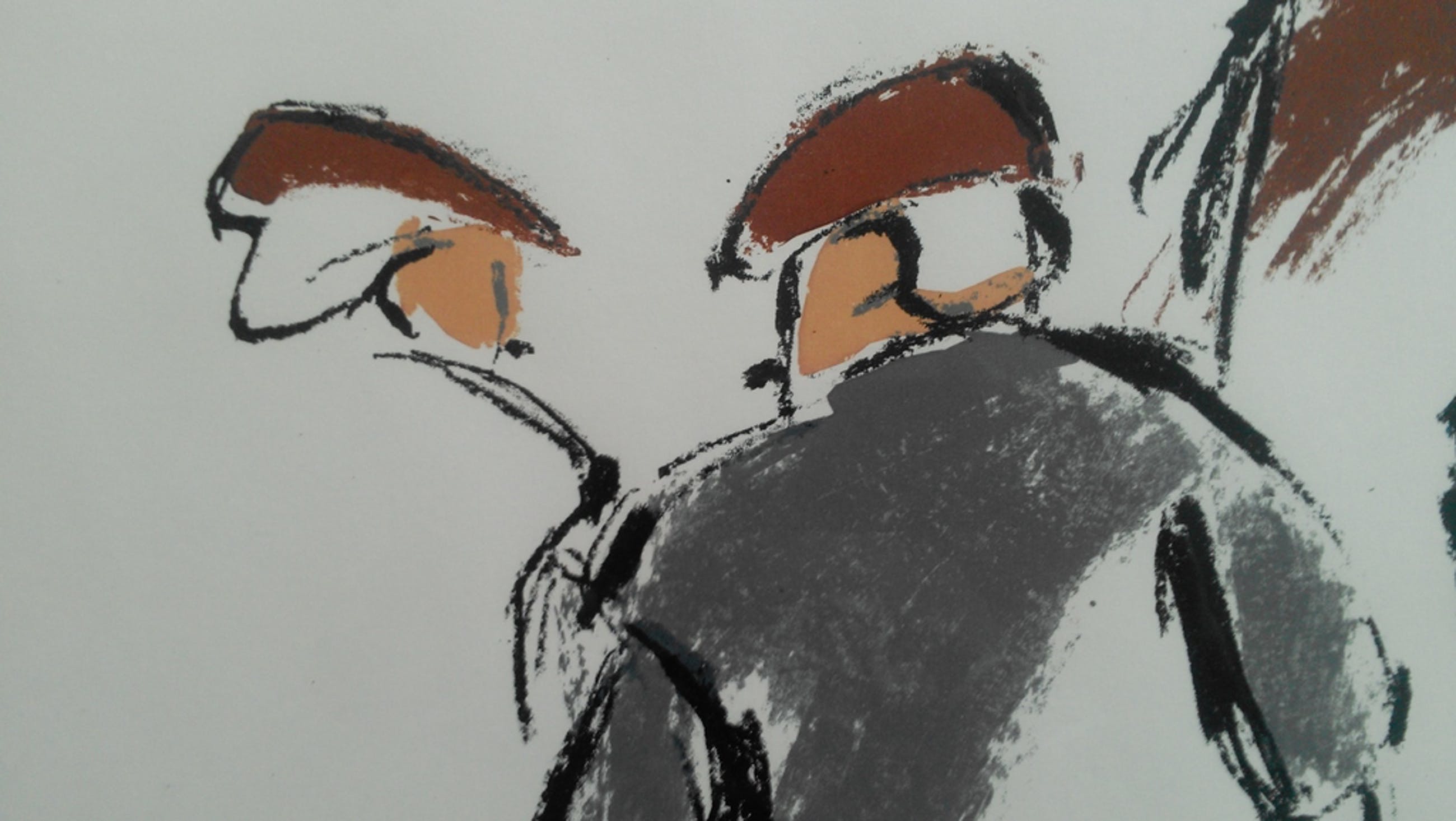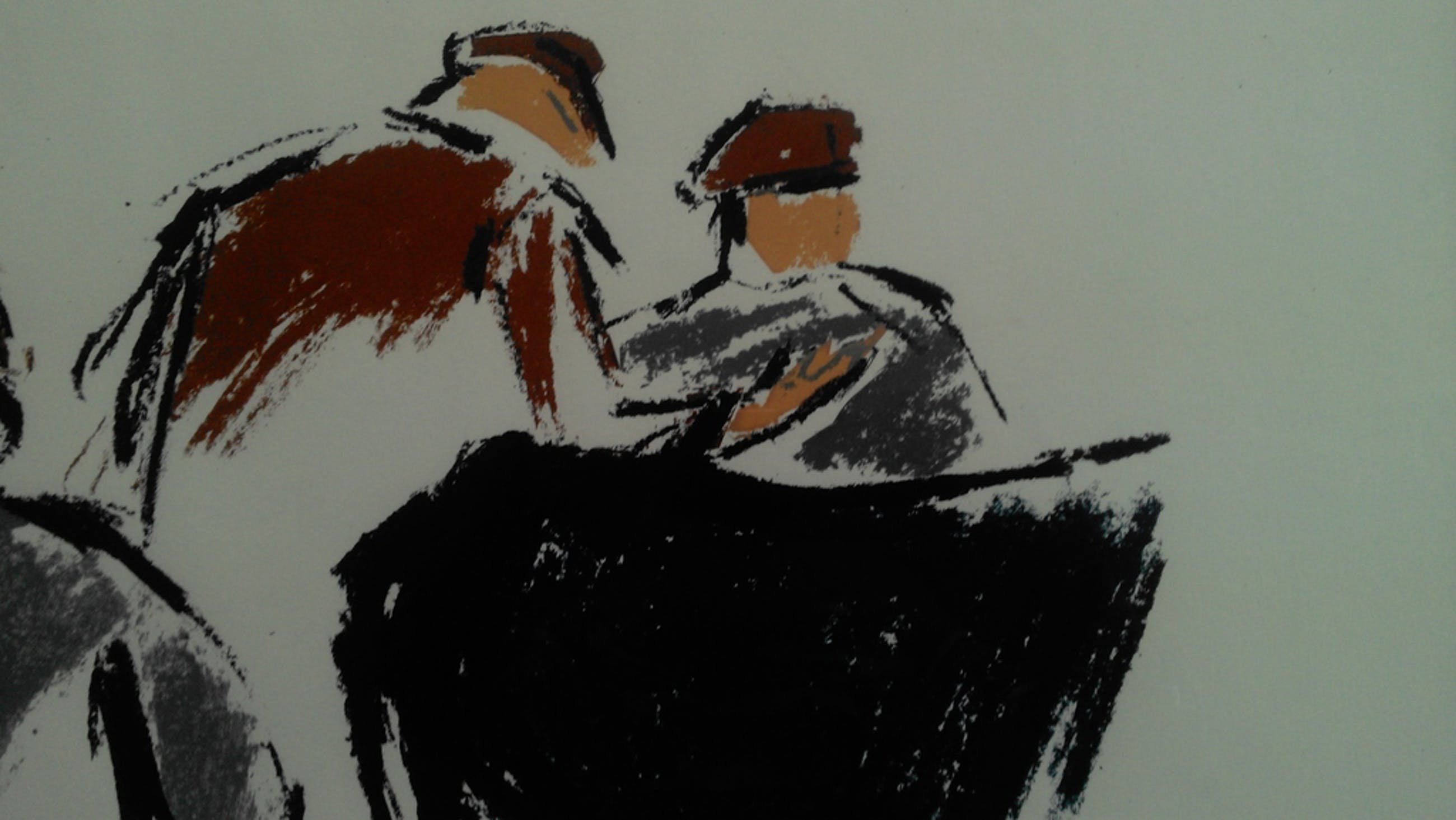 Purmerend ? met een paar lijnen staan daar de karakteristieke boeren/veehandelaren met pet en sigaar. Handjeklap om tot een akkoord te komen over de prijs die de koe moet opbrengen.