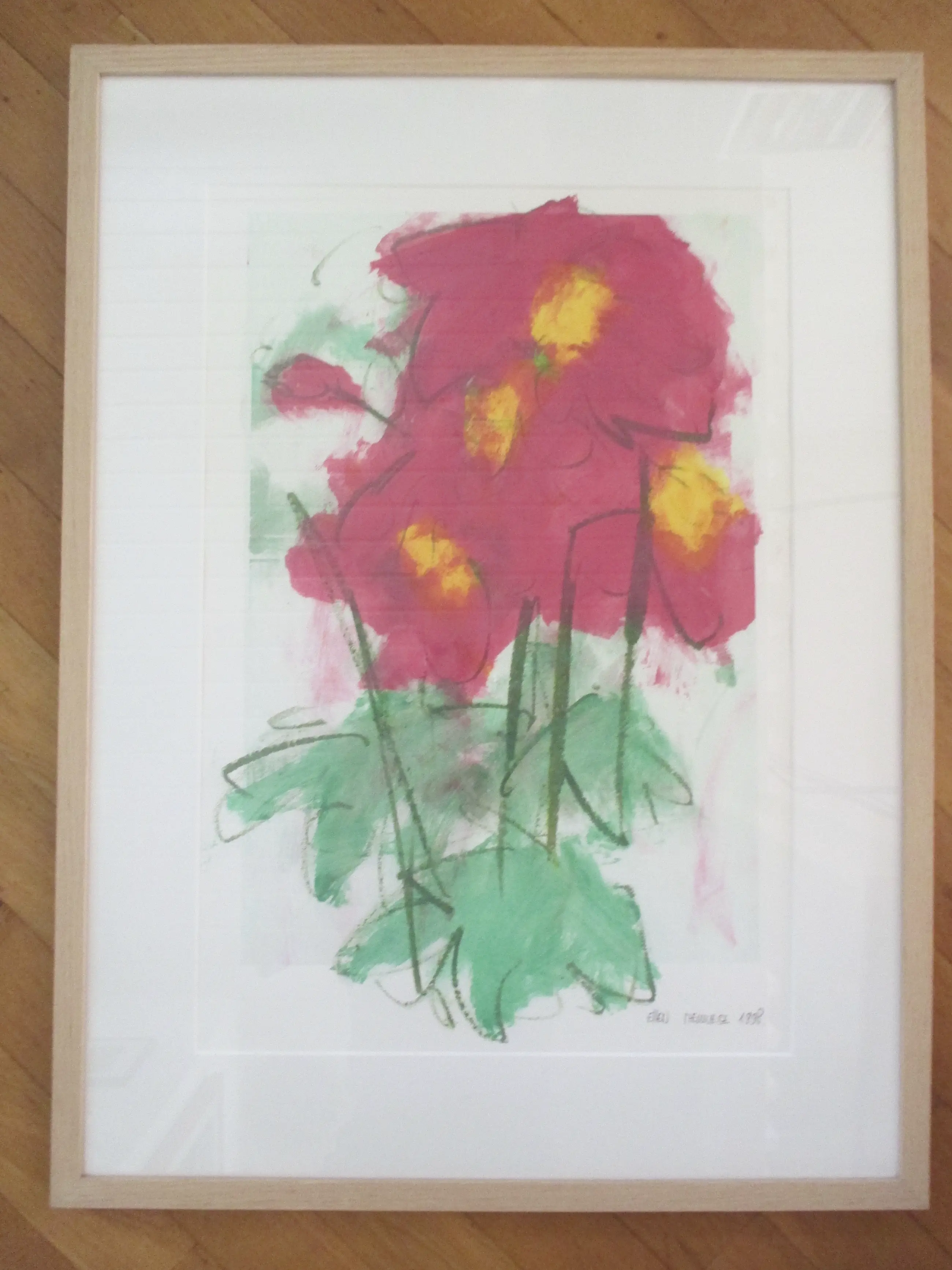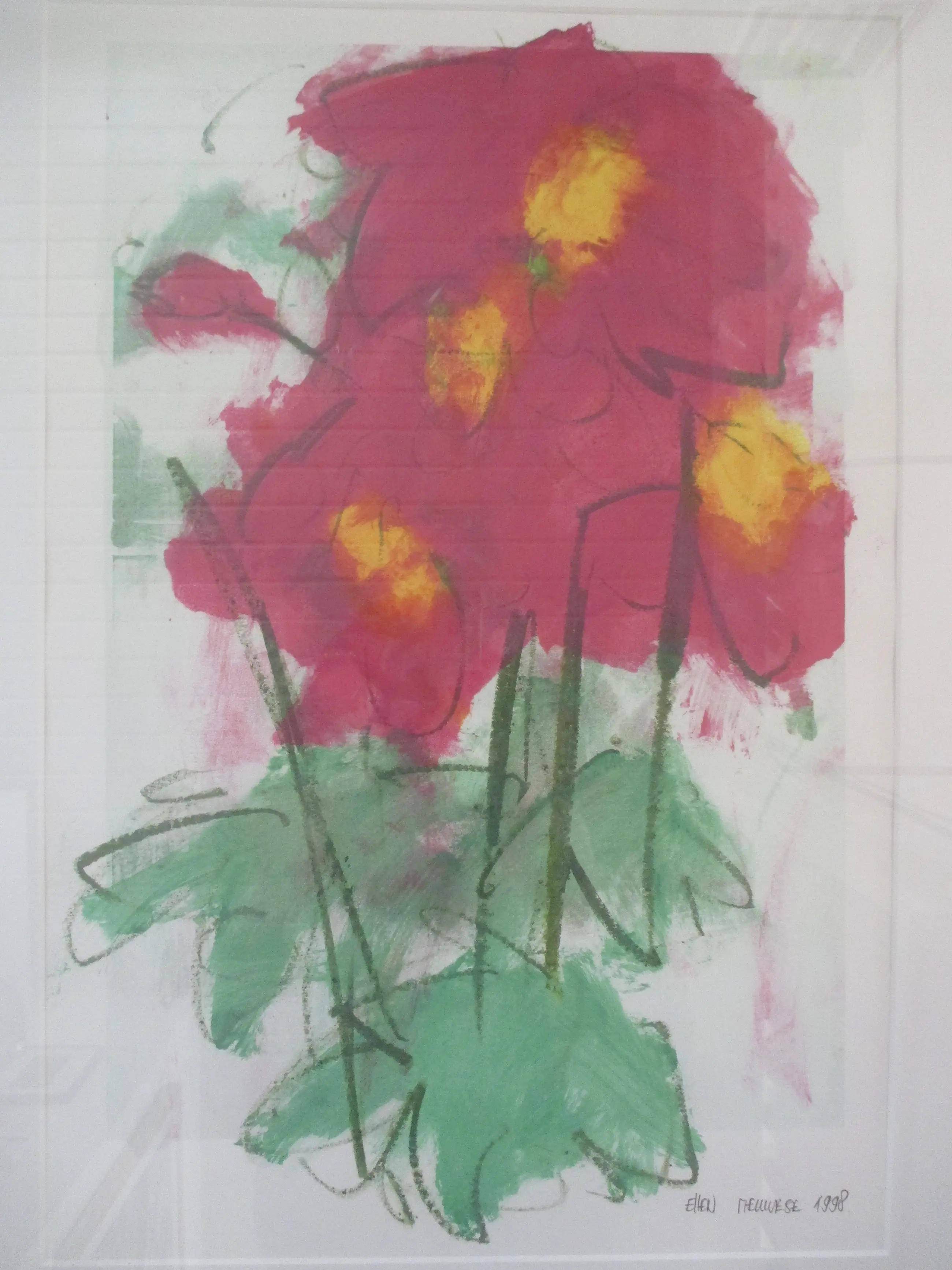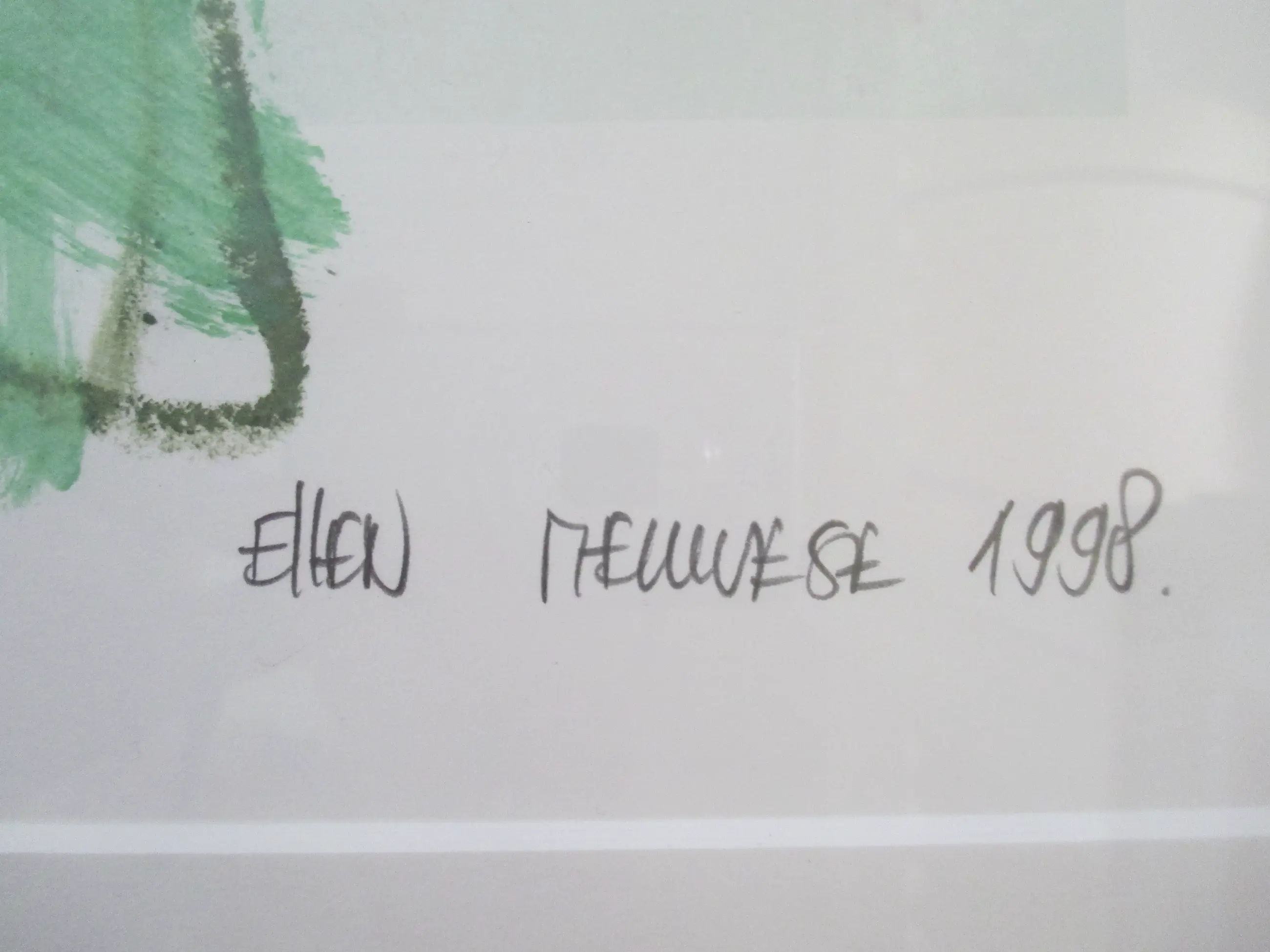 Monoprint van Ellen Meuwese, gesigneerd, gedateerd in potlood. Een monoprint is een uniek werk. Ingelijst achter passe-partout en glas in houten Barth lijst. Verzending aangetekend 19 euro. Bij verzending is glasbreuk voor risico van de koper. verzending alleen binnen Nederland