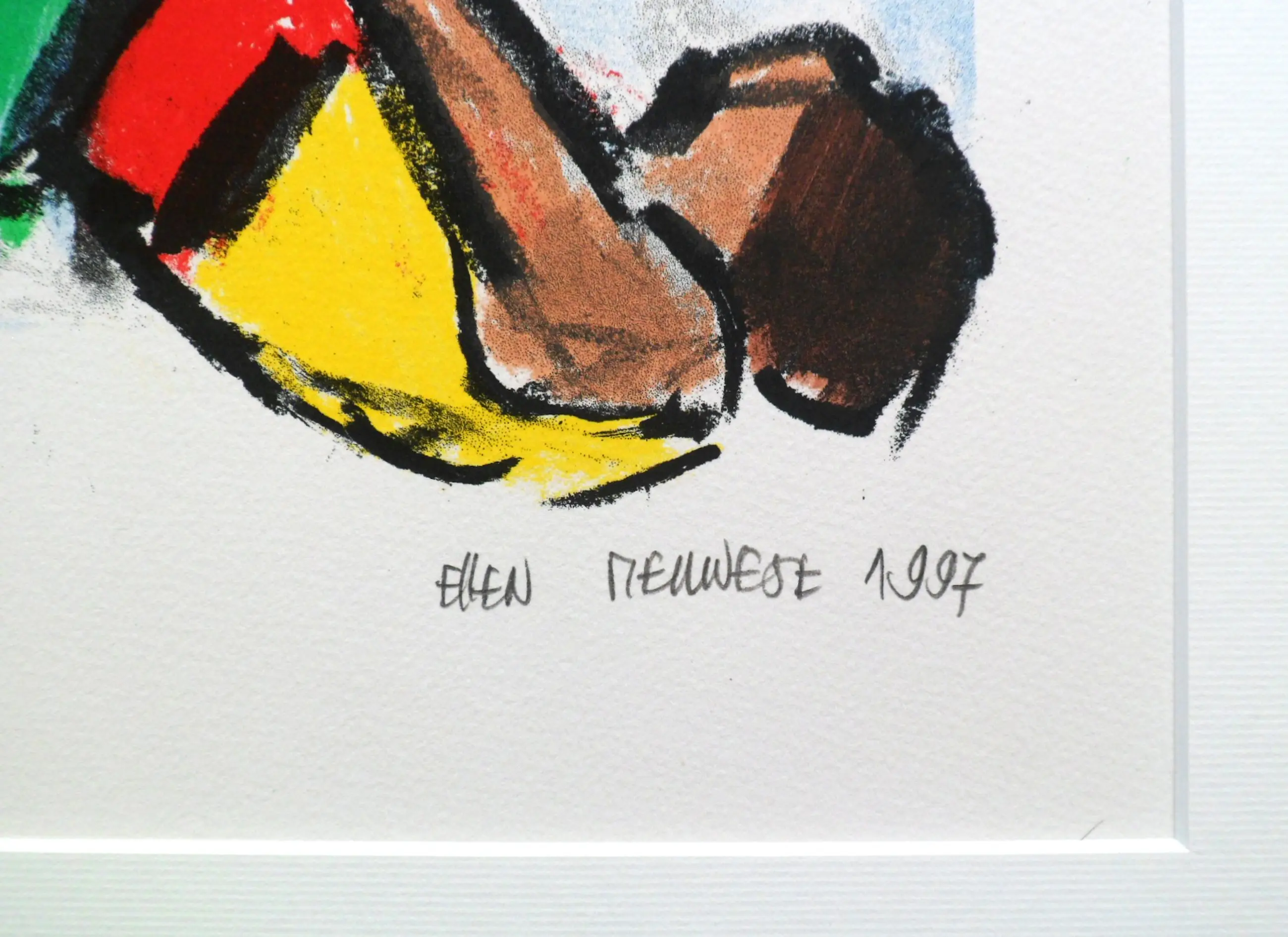Prachtige, kleurrijke zeefdruk van Ellen Meuwese. Zij genoot haar opleiding op de Academie Artibus inUtrecht. Zeer bekend van mens- en dierfiguren. Ellen Meuwese werkt veel in opdracht voor (inter)nationale bedrijven met exposities in het hele land. Gesigneerd en gedateerd met potlood.