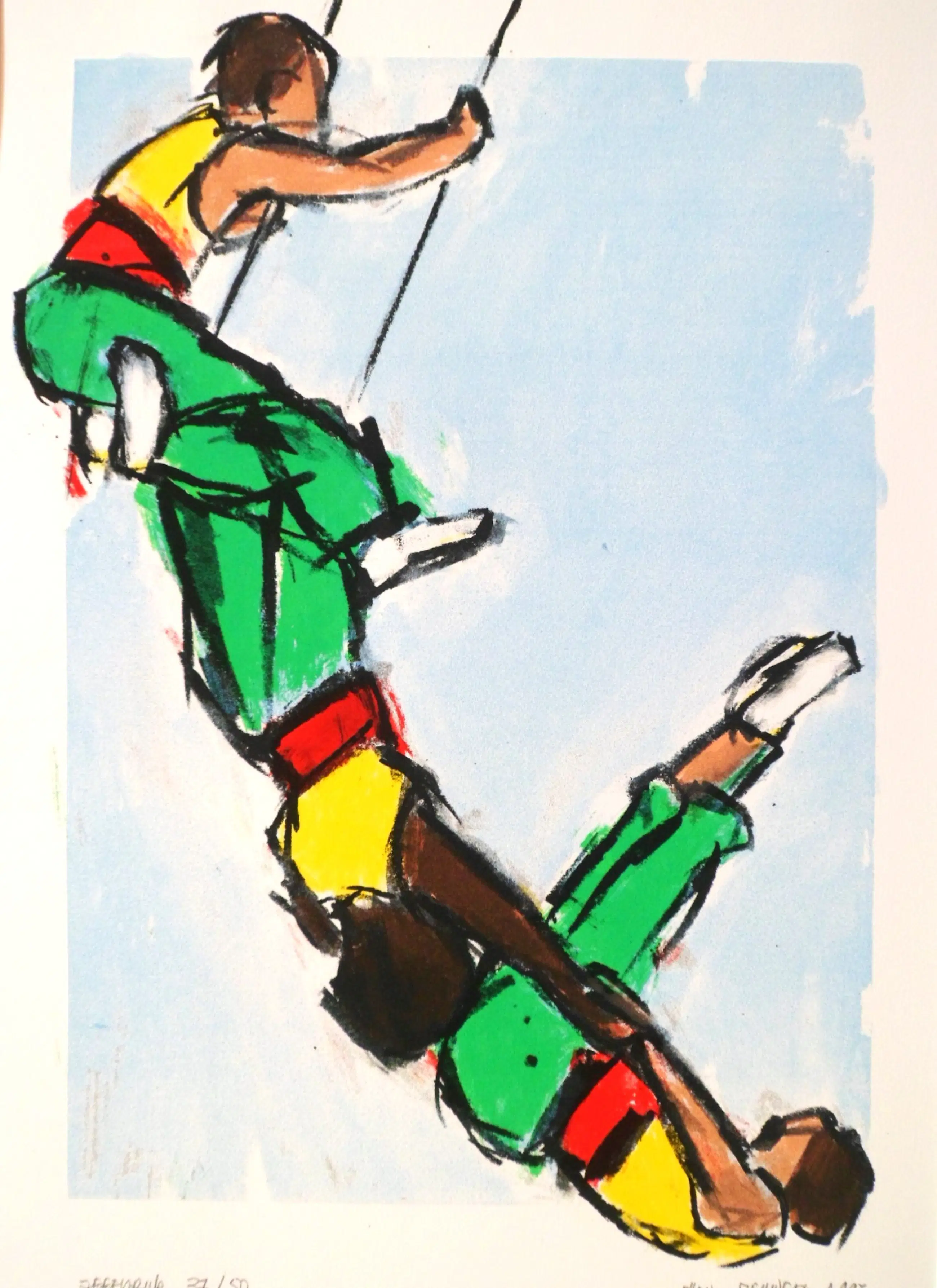 Ellen Meuwese - prachtige, kleurrijke grote zeefdruk. Trapeze artiesten.