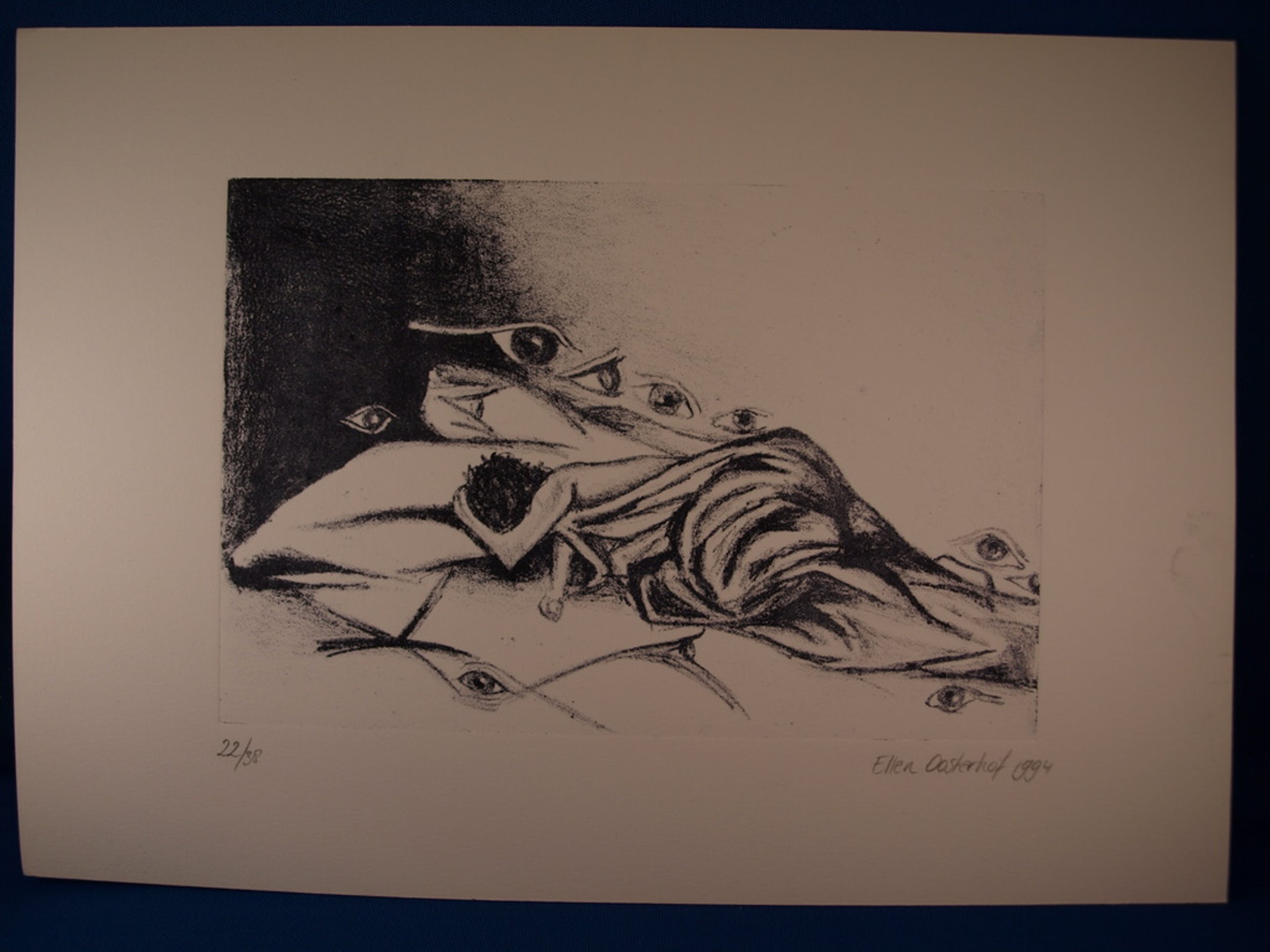 Een gesigneerde ets van Ellen Oosterhof, gemaakt tijdens haar studie aan de Kunstacademie Minerva in Groningen in het studiejaar 1994. Gemaakt in een oplage van 38 exemplaren.