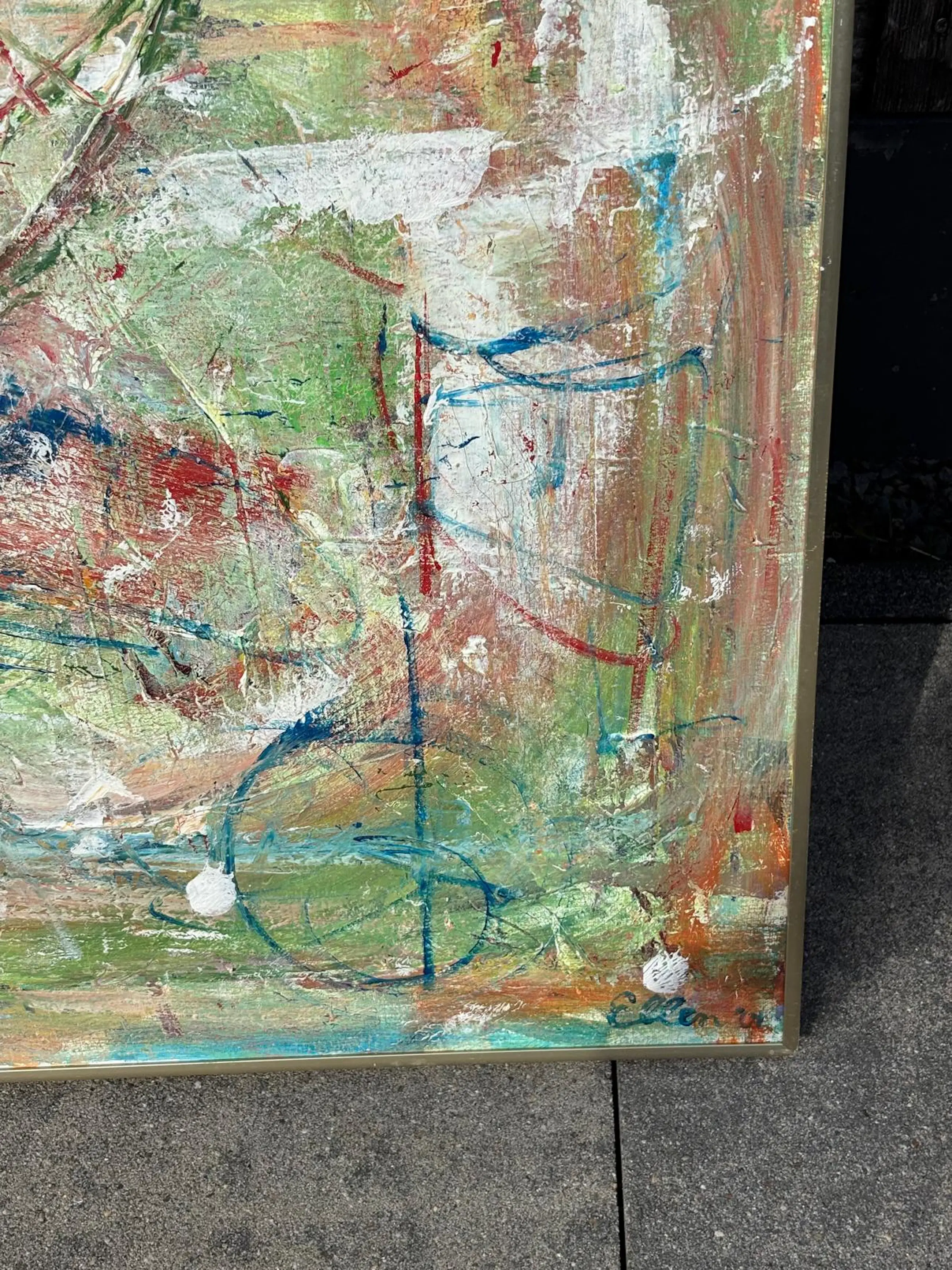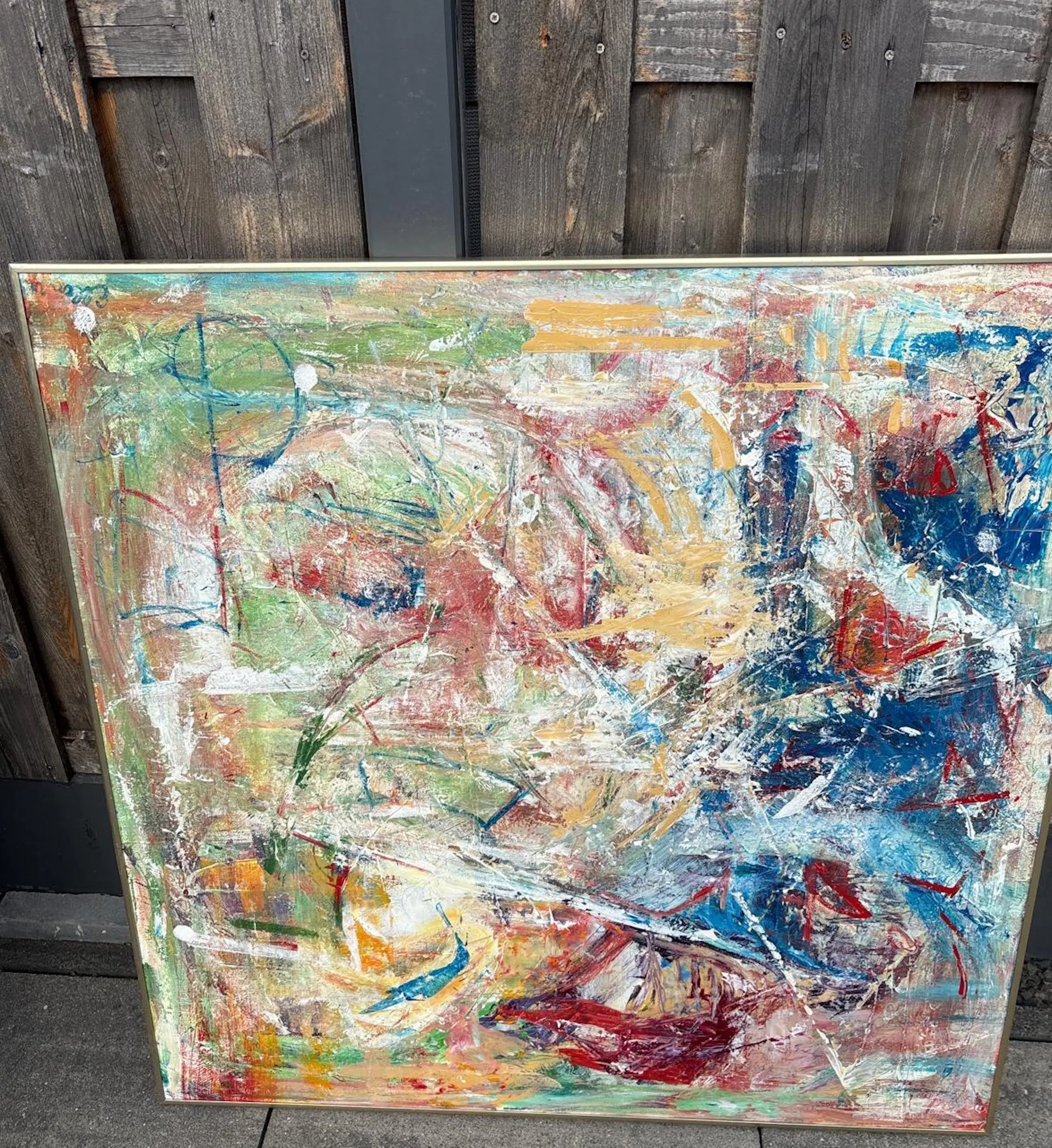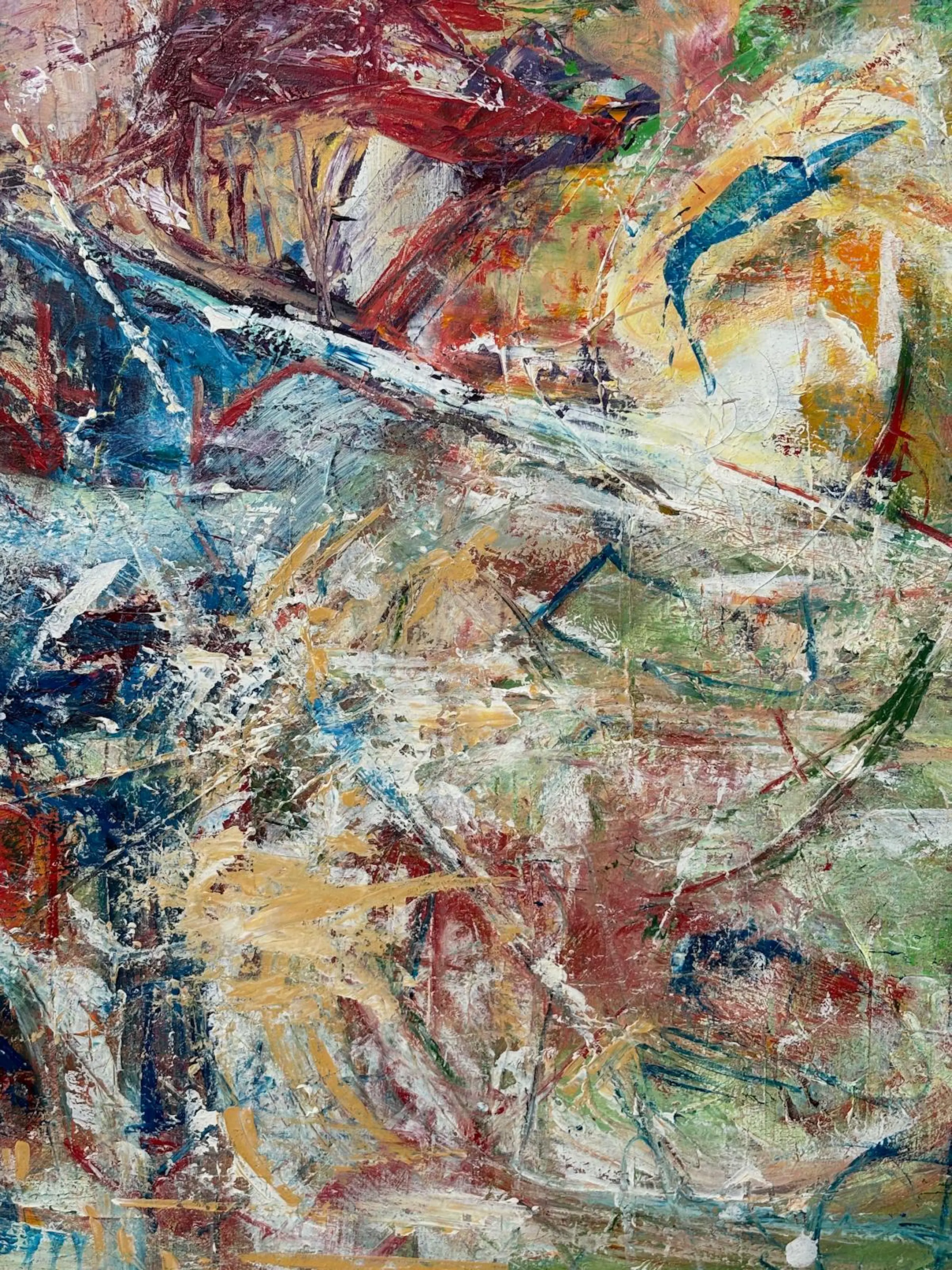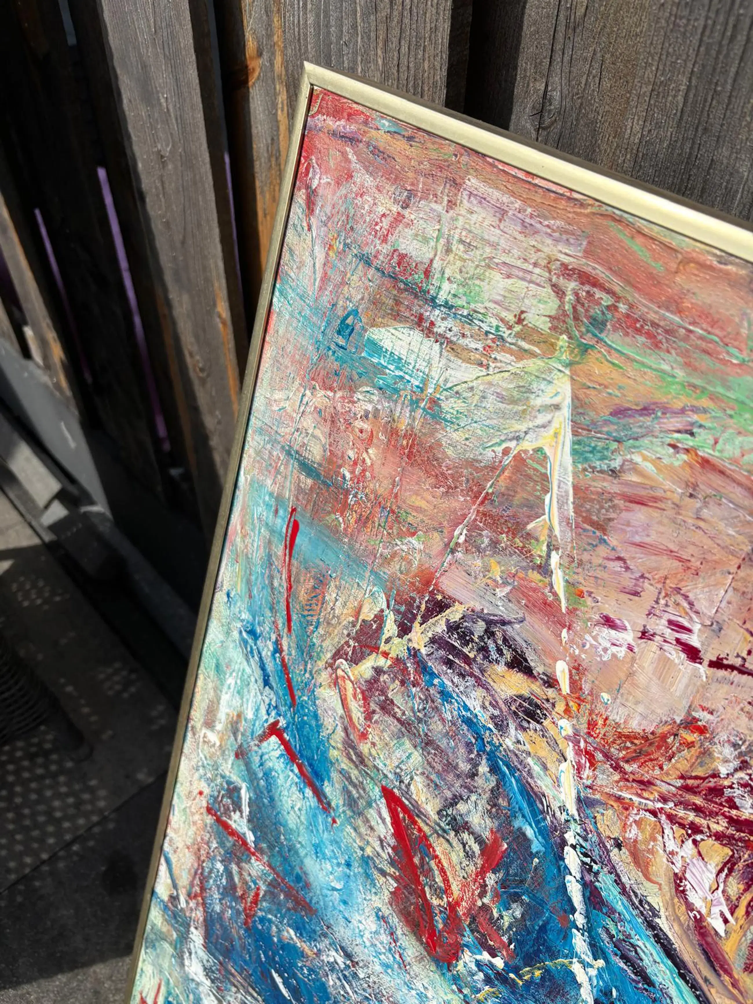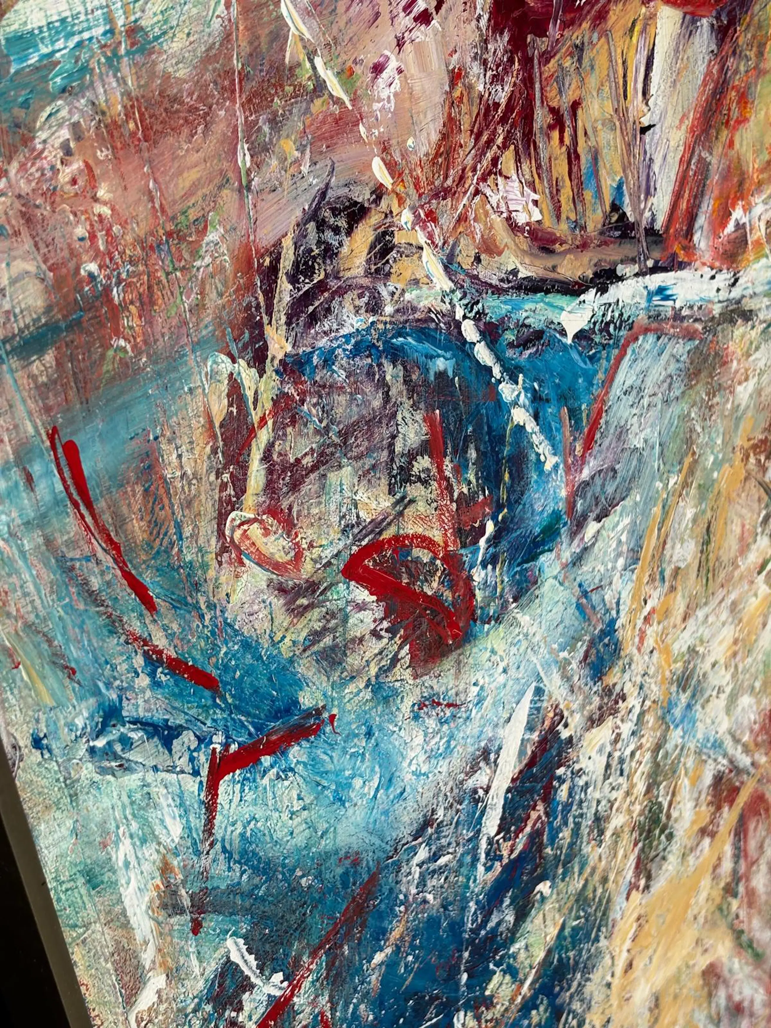 Beschrijving: Prachtig groot abstract schilderij met krachtige penseelstreken en een rijke combinatie van kleuren zoals blauw, rood, groen en geel. Een uniek en expressief werk dat direct opvalt in ieder interieur.