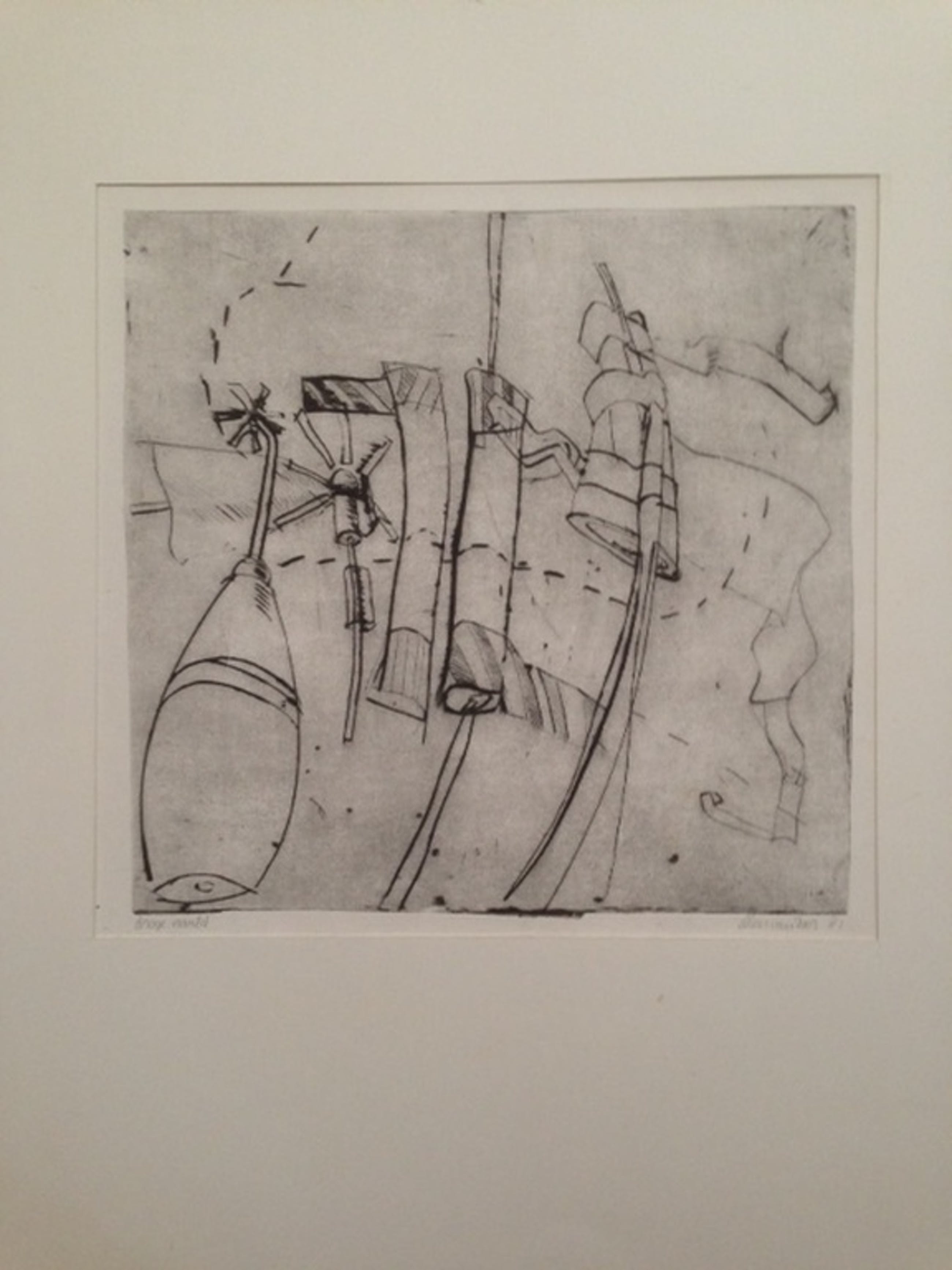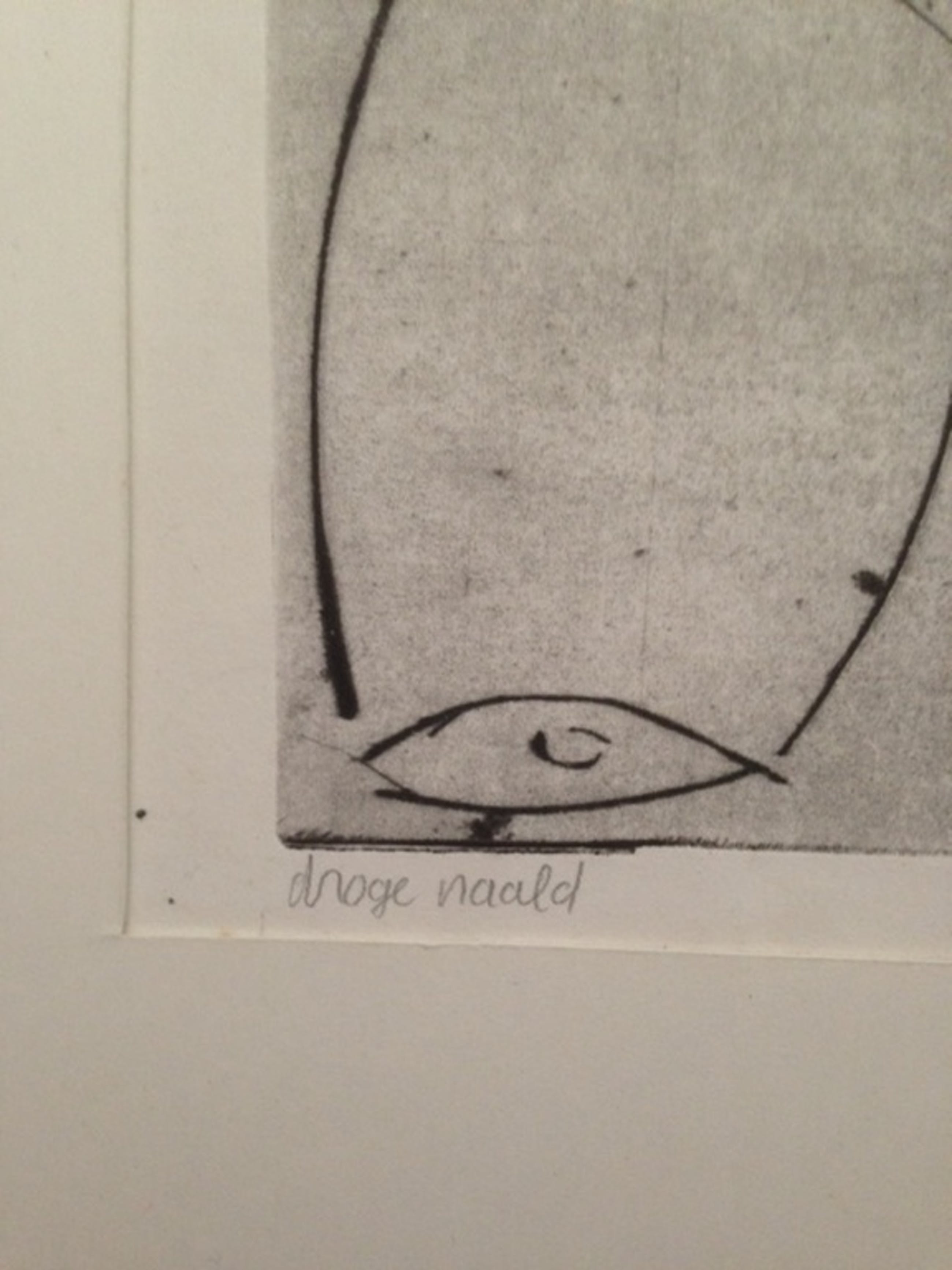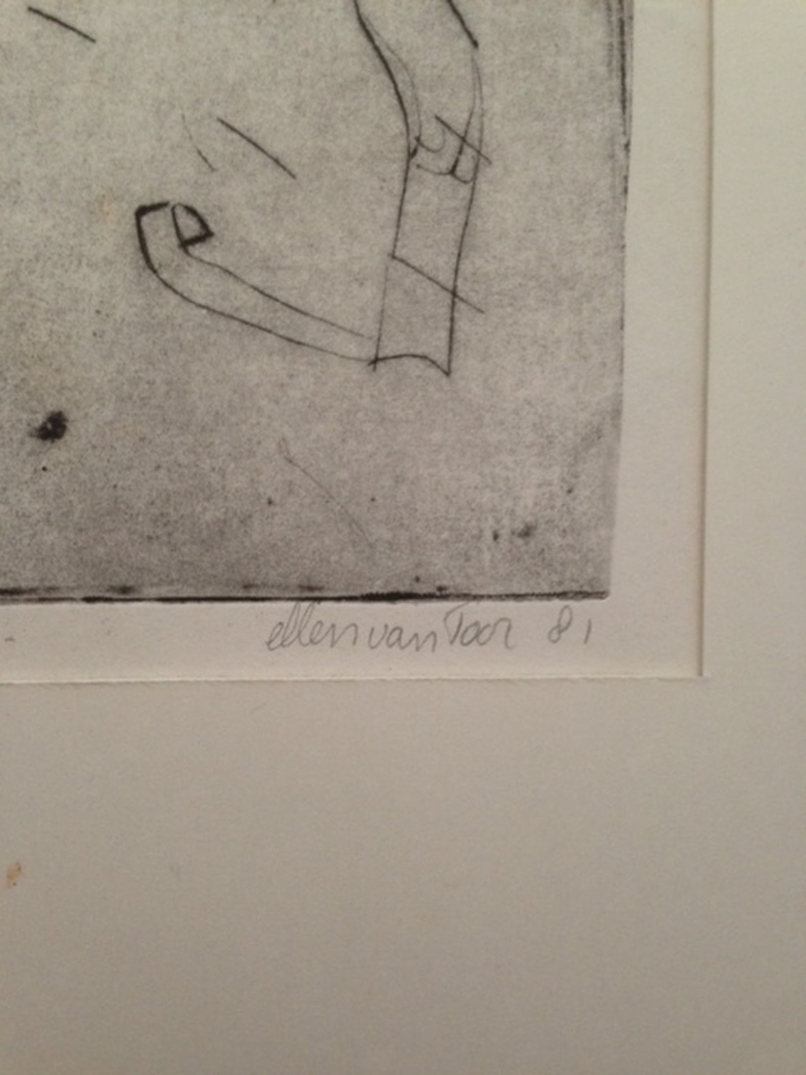 Droge naald ets. Vroeg werk, uit haar studie tijd. Losbladig en met potlood gesigneerd.