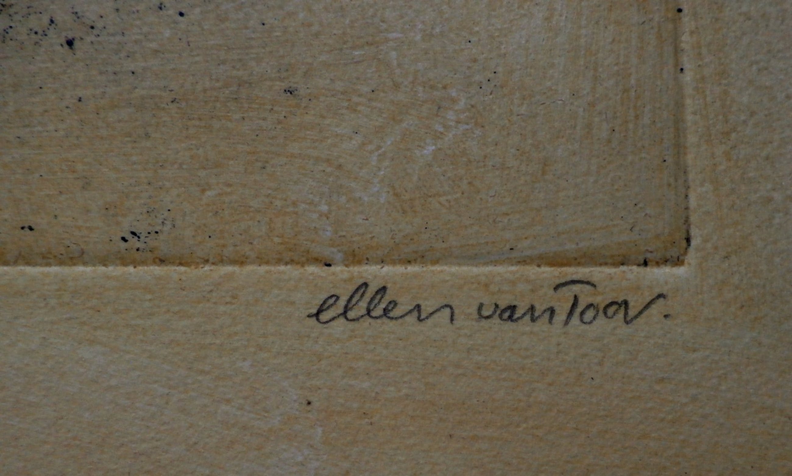 Ets/ van Ellen van Toor. Titel: onbekendt. Nummer: 3/23. Jaar: 1997. Afmetingen blad: H44,5 x b43 cm. Afmetingen voorstelling: H34,5 x b34,5 cm. Rechtsonder door de kunstenaar gesigneerd met potlood. De authenciteit van het, aangeboden, werk wordt voor 100% gegarandeerd. Herkomst: collectie ABN AMRO.