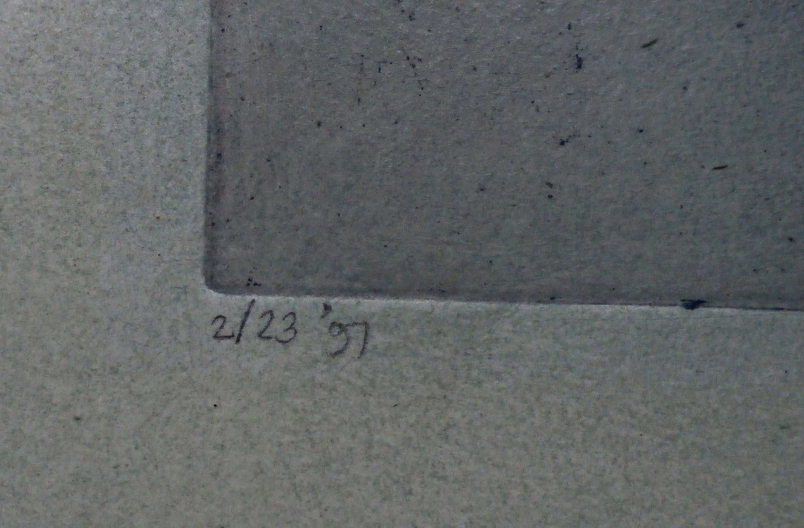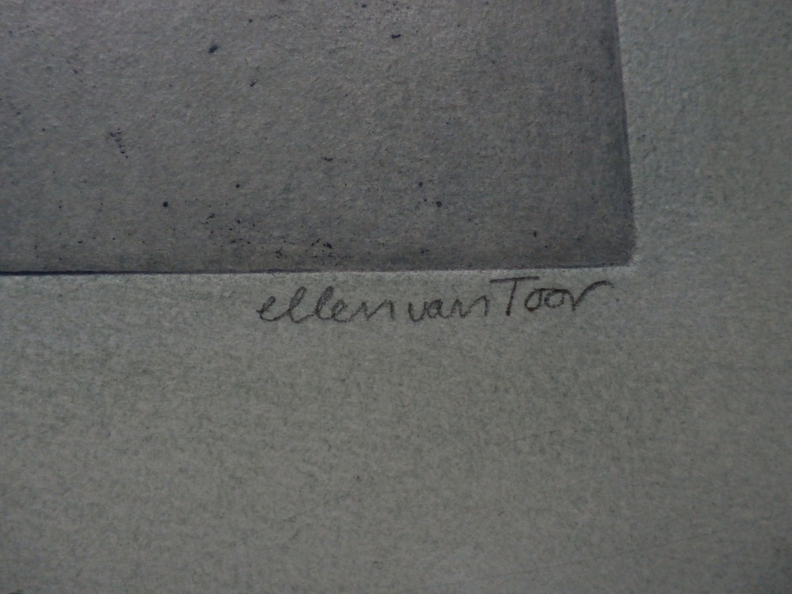 Ets/ van Ellen van Toor. Titel: onbekendt. Nummer: 2/23. Jaar: 1997. Afmetingen blad: H44,5 x b43 cm. Afmetingen voorstelling: H34,5 x b34,5 cm. Rechtsonder door de kunstenaar gesigneerd met potlood. De authenciteit van het, aangeboden, werk wordt voor 100% gegarandeerd. Herkomst: collectie ABN AMRO.