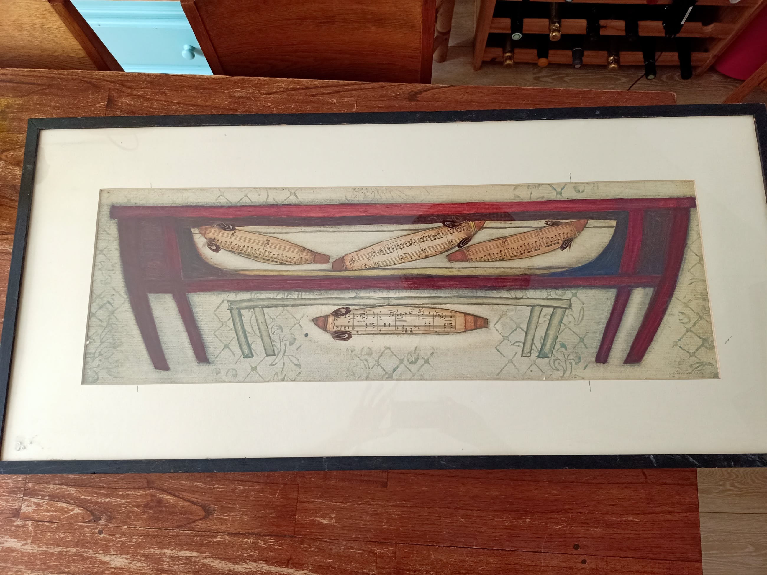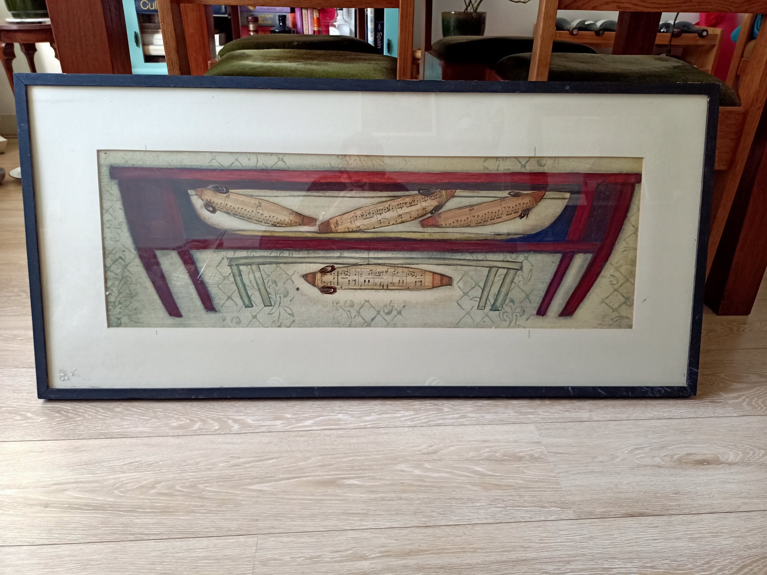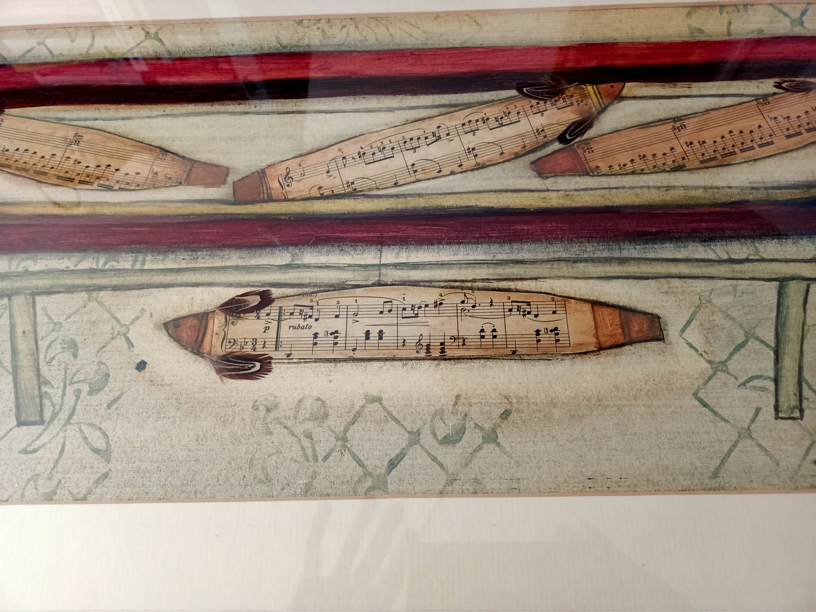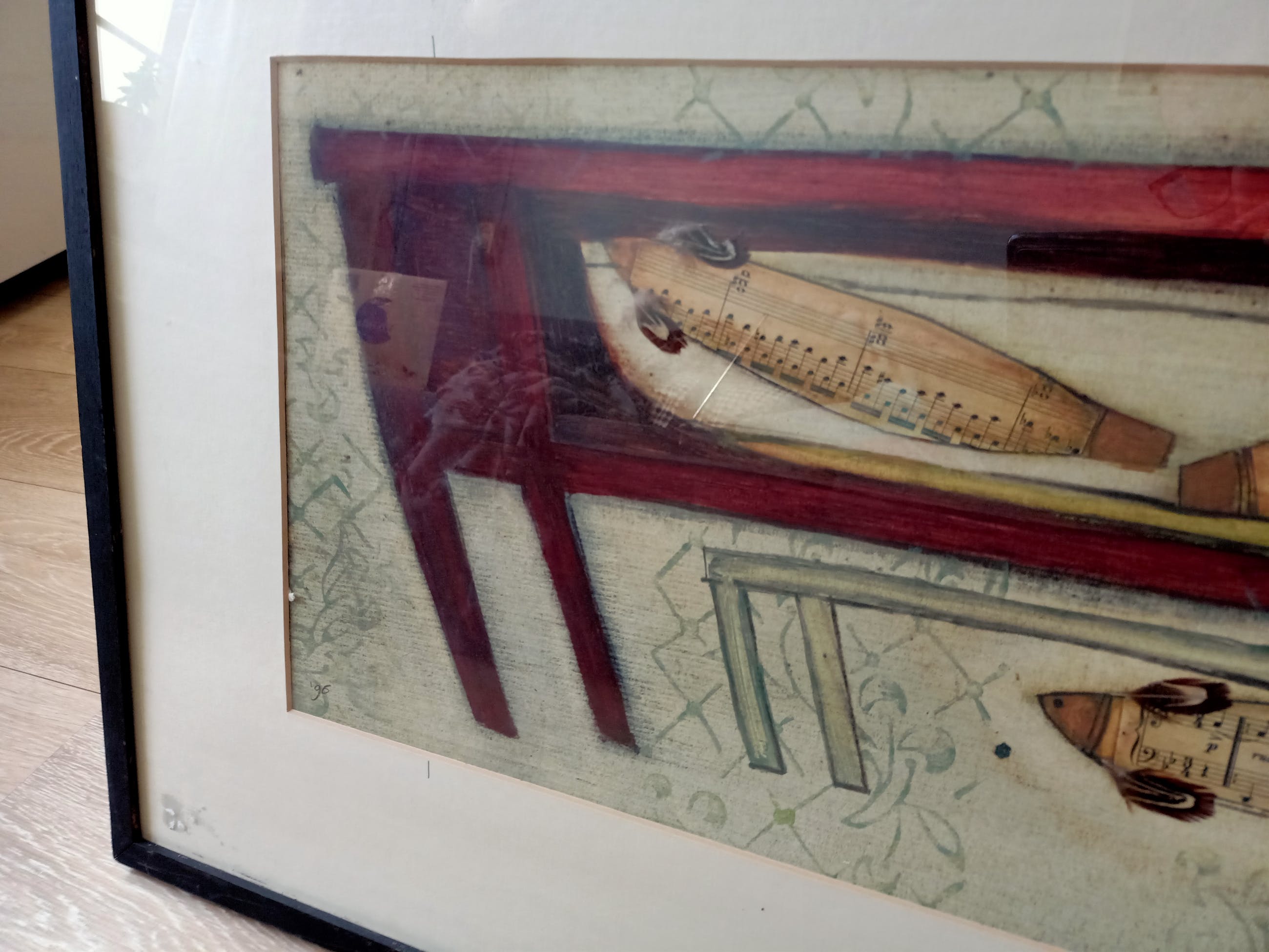 Mooi werk met verschillende technieken, acryl, potlood en veertjes van vogels. Oospronkelijke prijs 1700 euro, staat achterop de lijst waar ook haar gegevens staan.