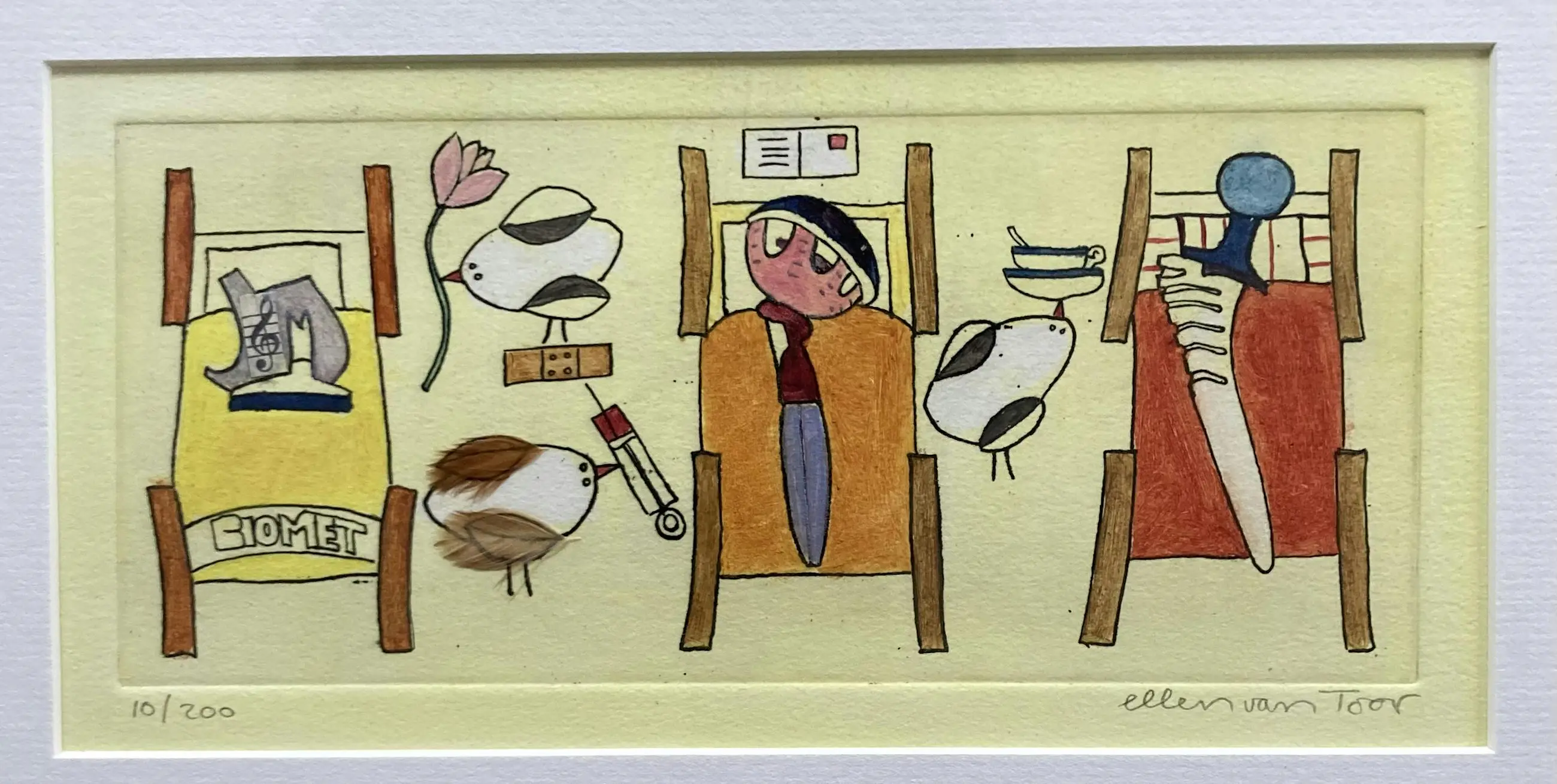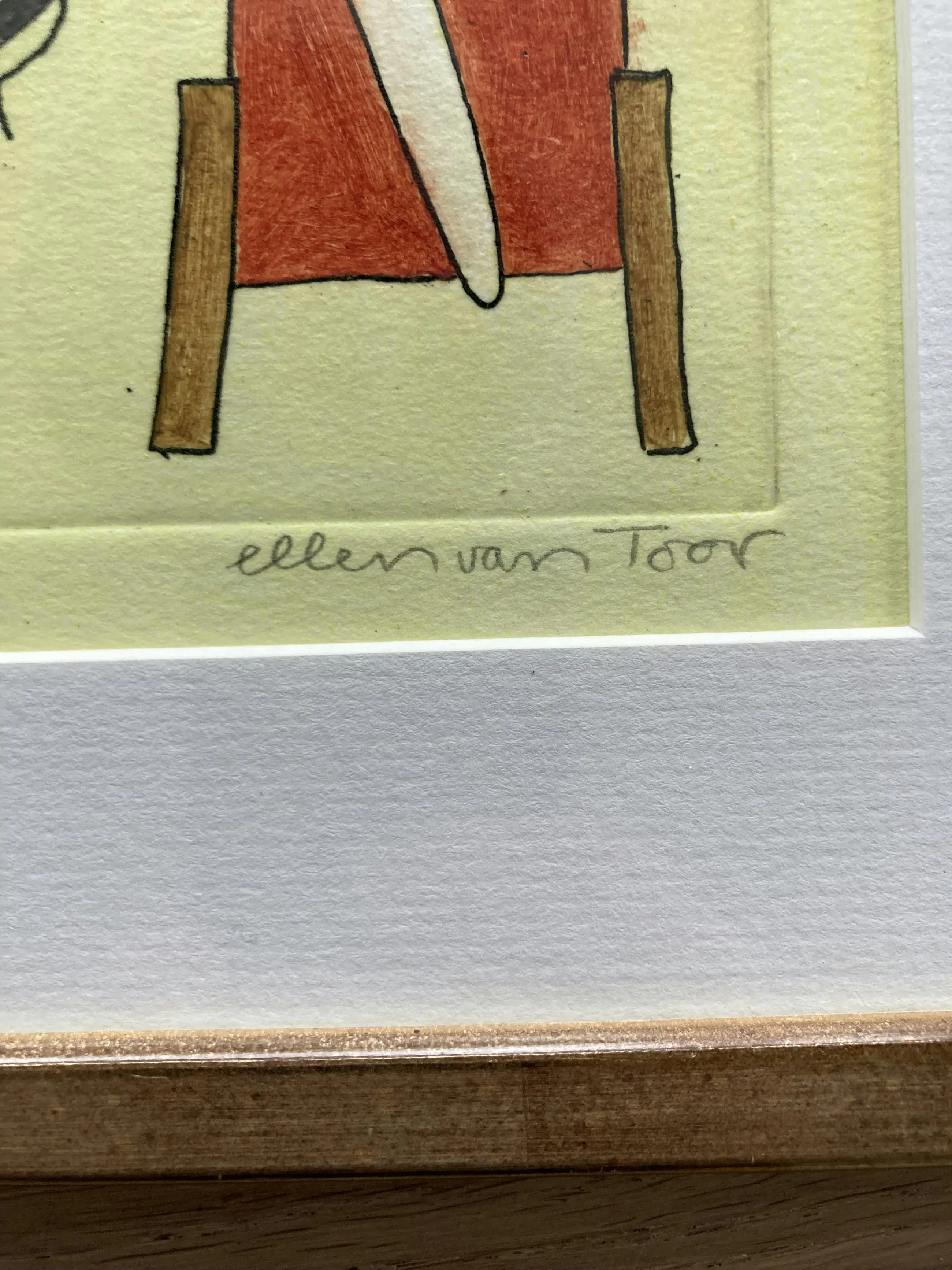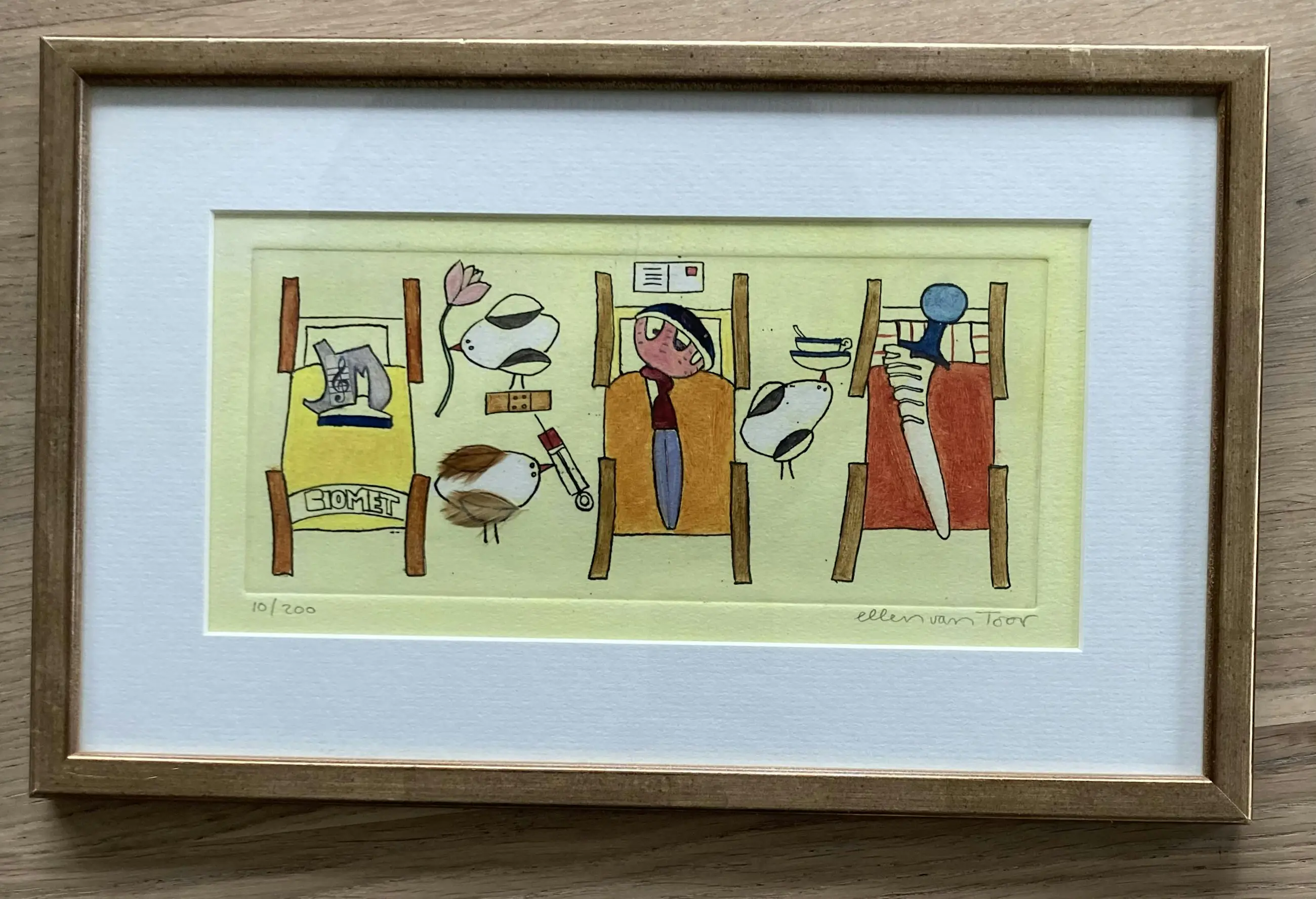 Prachtige handgekleurde ets van Ellen van Toor. Nummer 10 in een oplage van 200. Mooi detail is dat de veertjes van één van de vogeltjes echt zijn (zie foto). Ingelijst in een houten goudkleurige lijst.