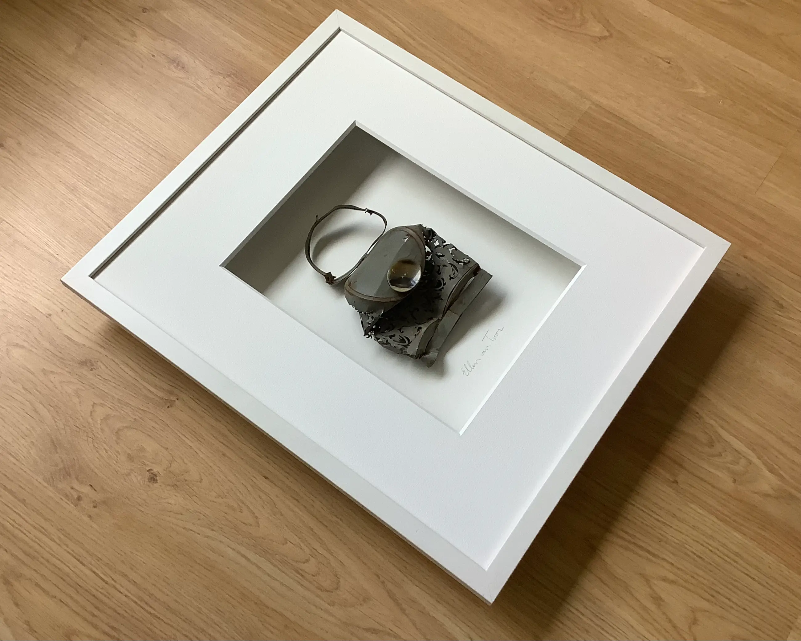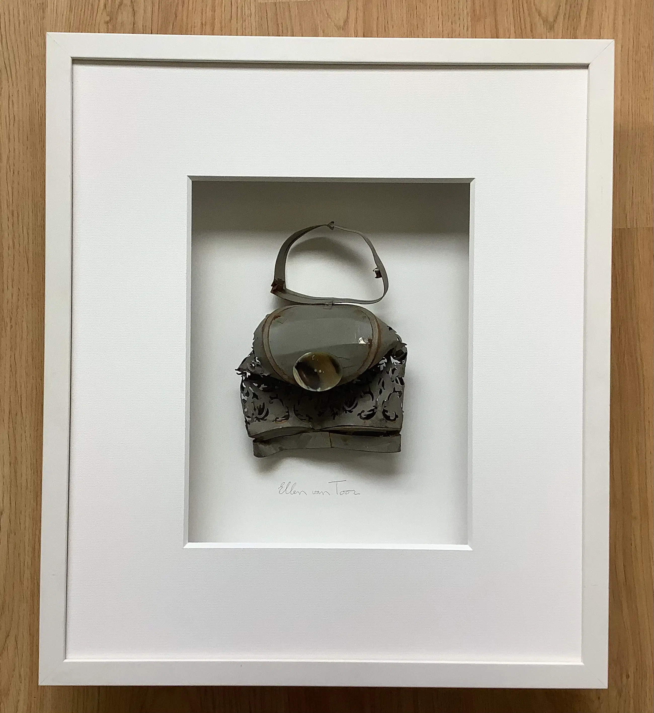 Er zit geen glas voor dit werk/collage. Een bijzonder kunstwerk.