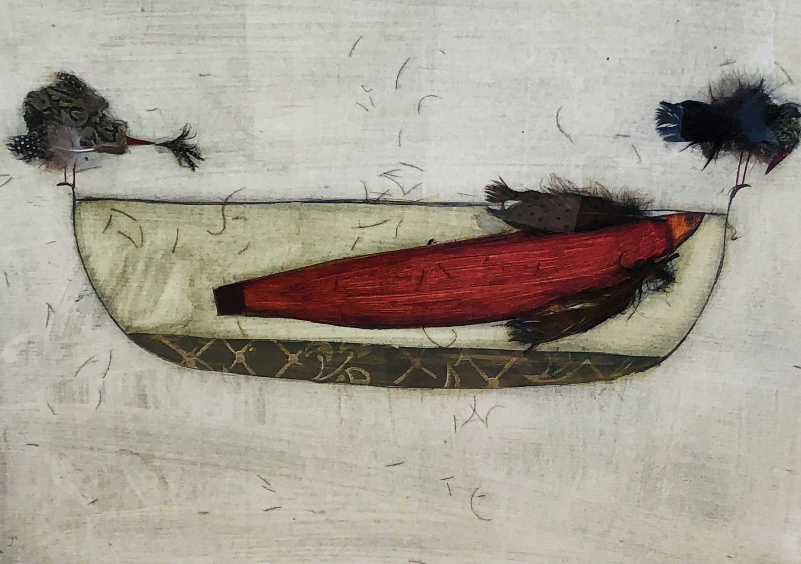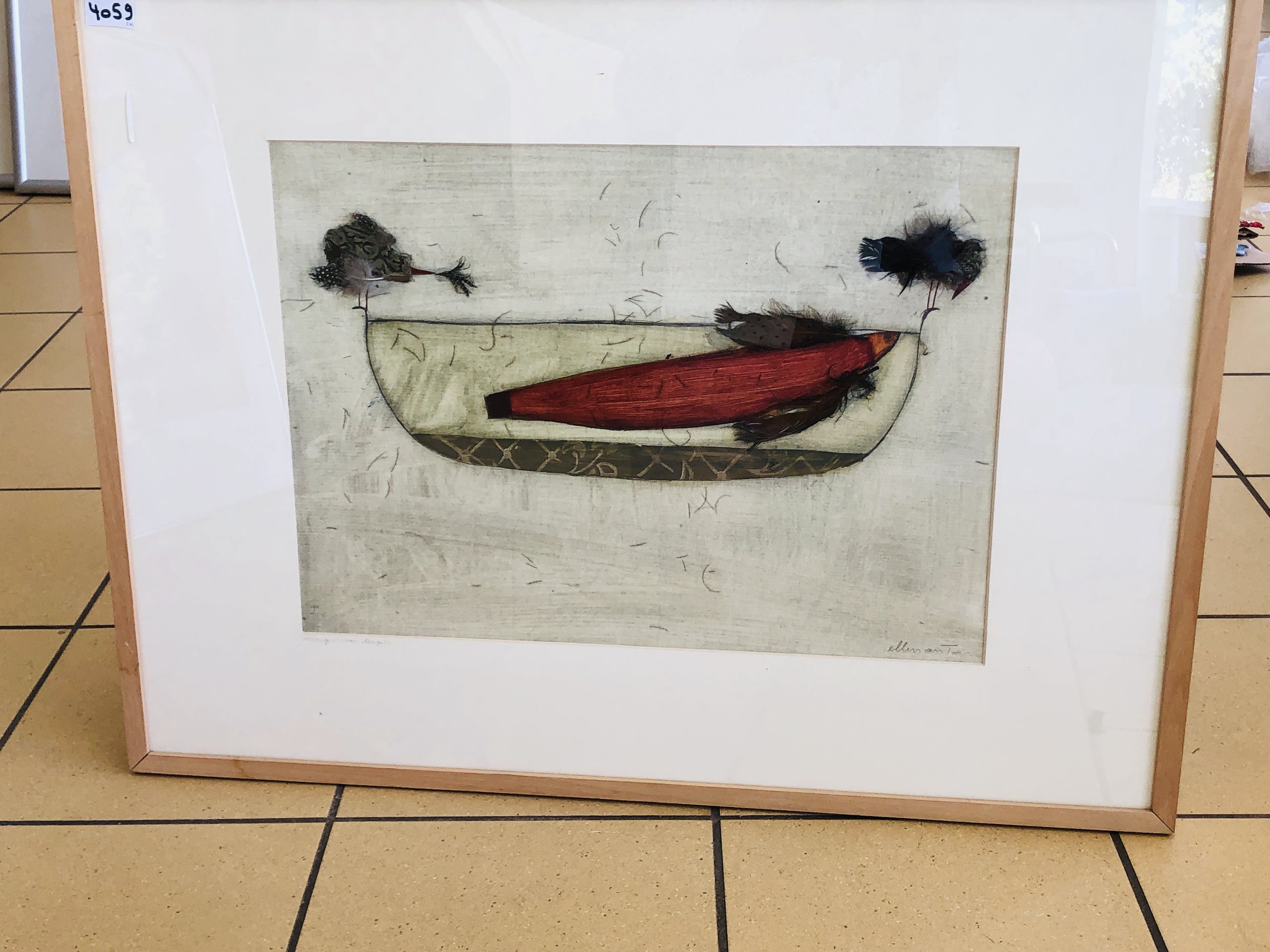 Origineel werk van Van Toor. Collage technieken ( beplakt met veren) en aquarel. Het werk zit in een lijst. De lijst heeft wat gebruiksporen. Kan in overleg worden opgehaald met lijst, verzonden worden zonder lijst of met lijst per koerier. De foto is door het glas van de omlijsting heen gemaakt.