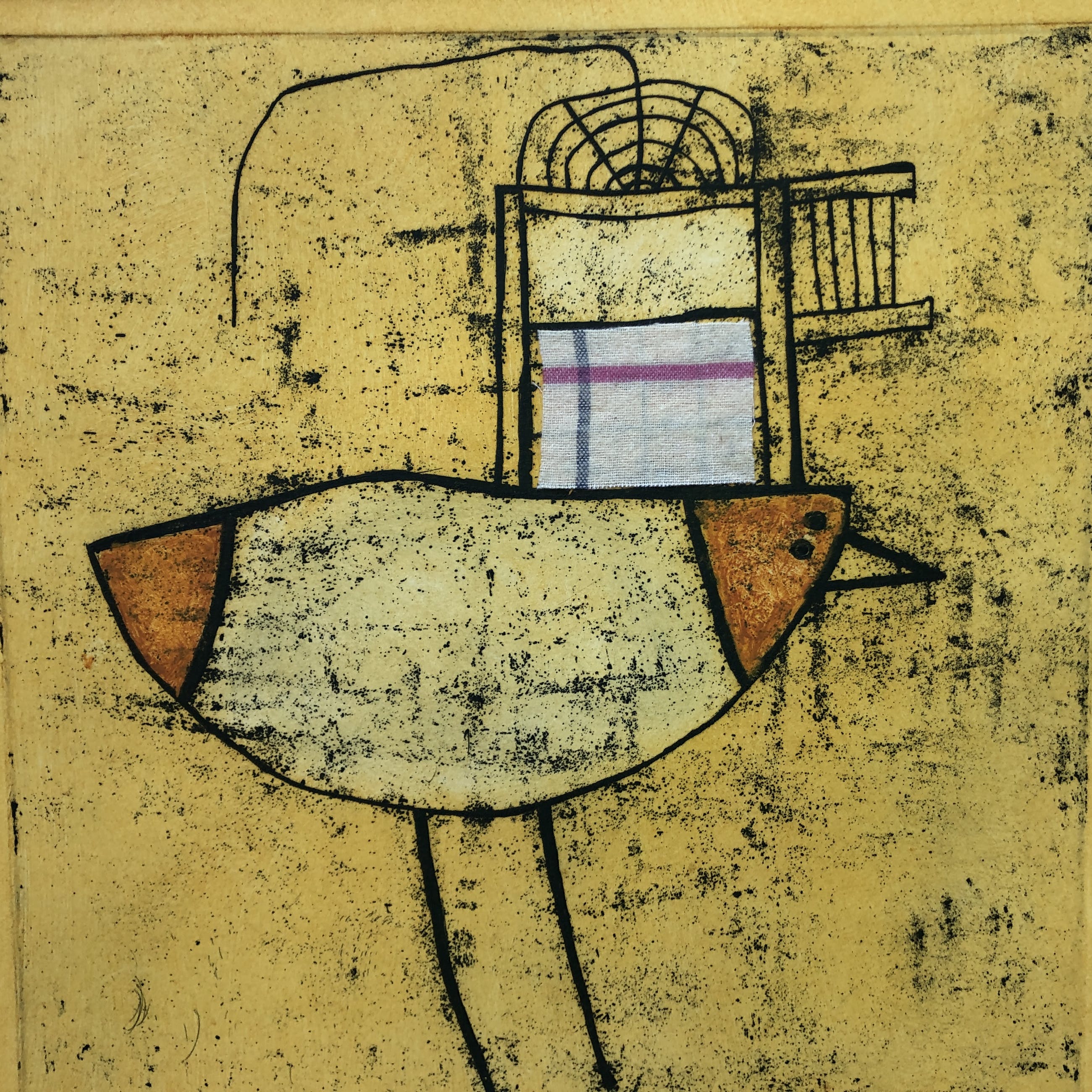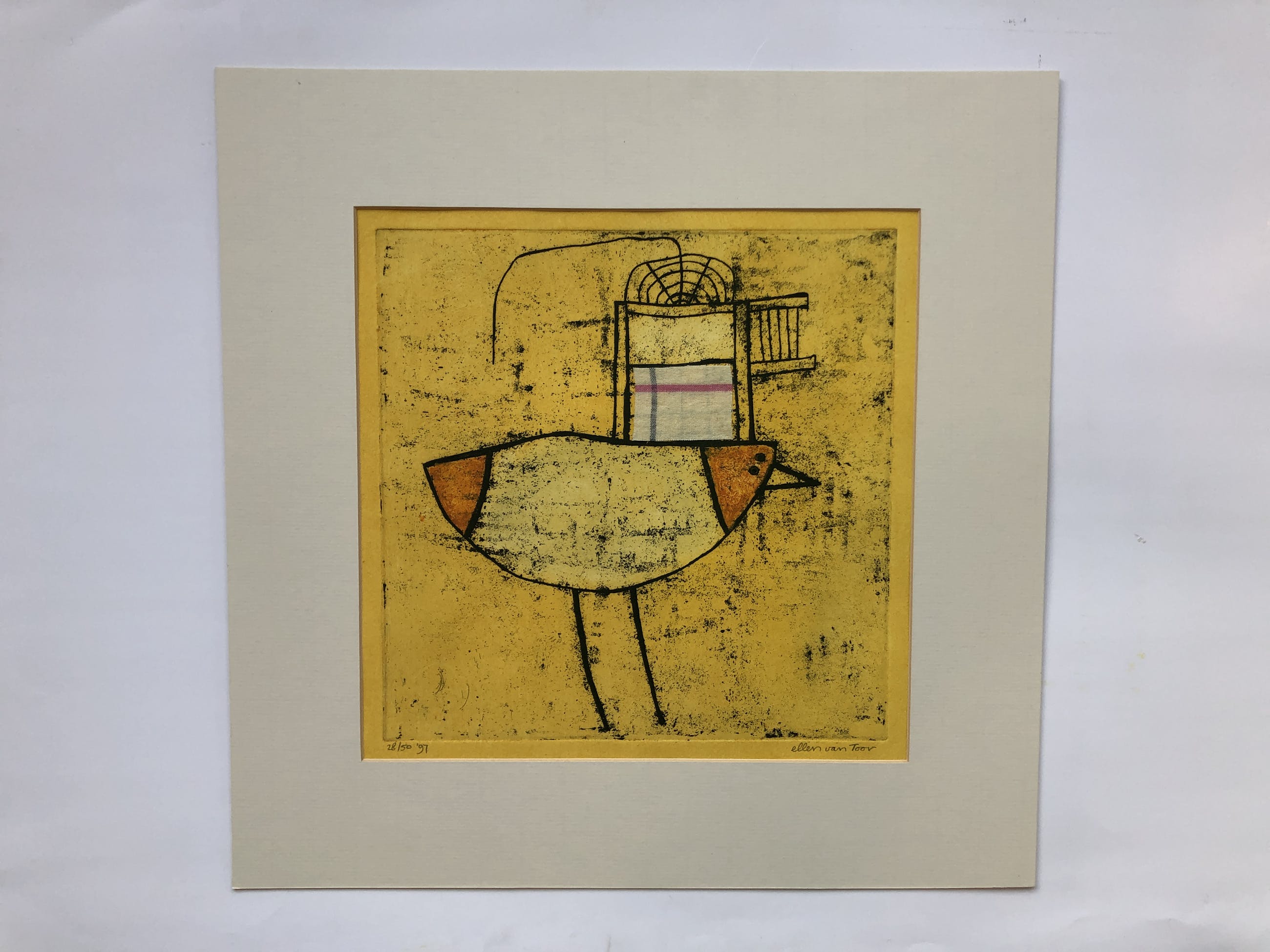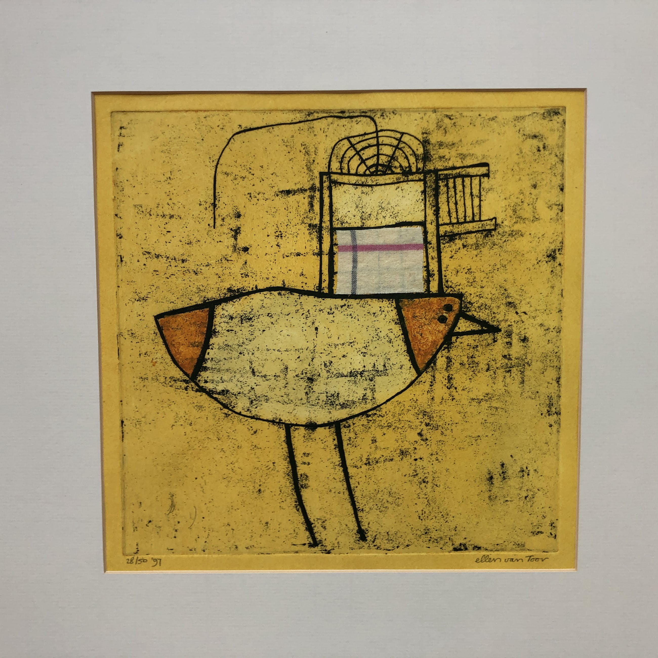 Ingekleurde ets en collagetechniek ( ingeplakt stukje textiel). Het werk kan worden verstuurd in een koker en heeft bij ophalen een passe partout van 55 x 55 cm. U kunt het werk vooraf komen bekijken in de schatkamer van Galerie Rotor in Gorinchem.