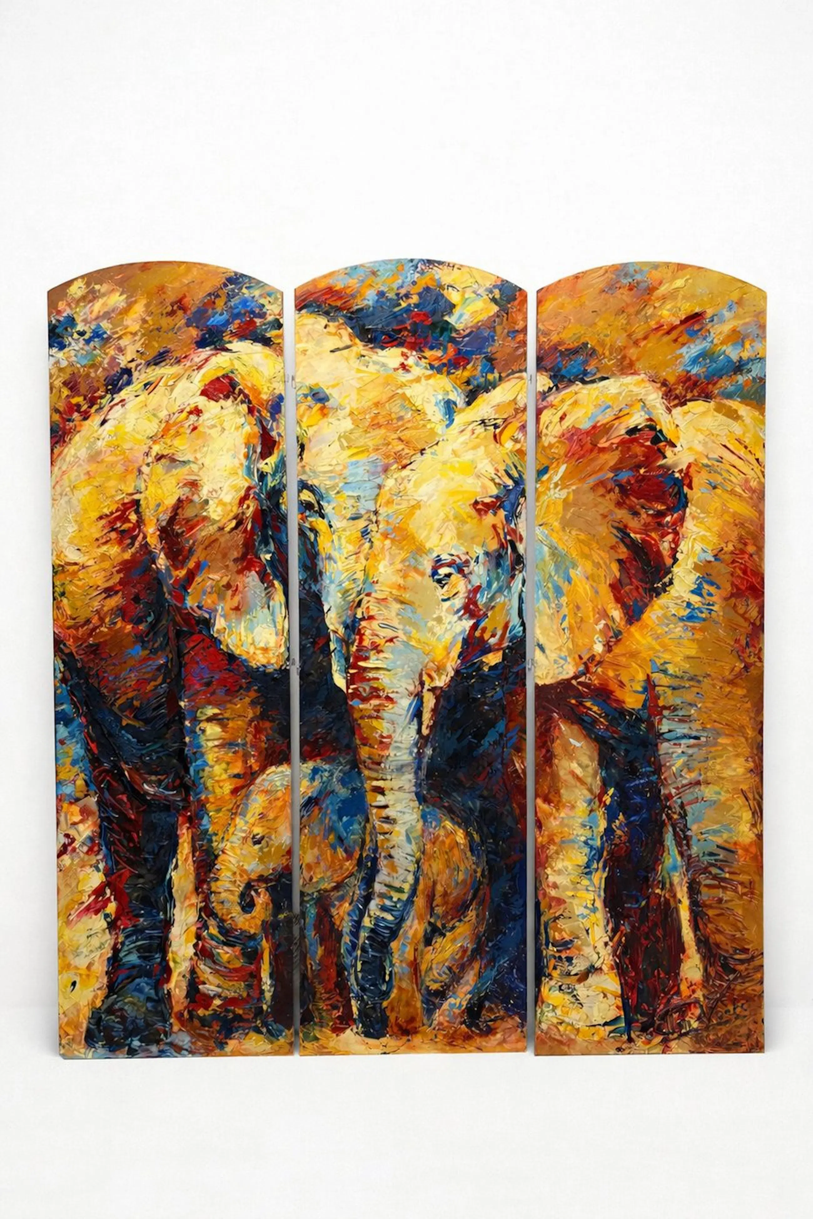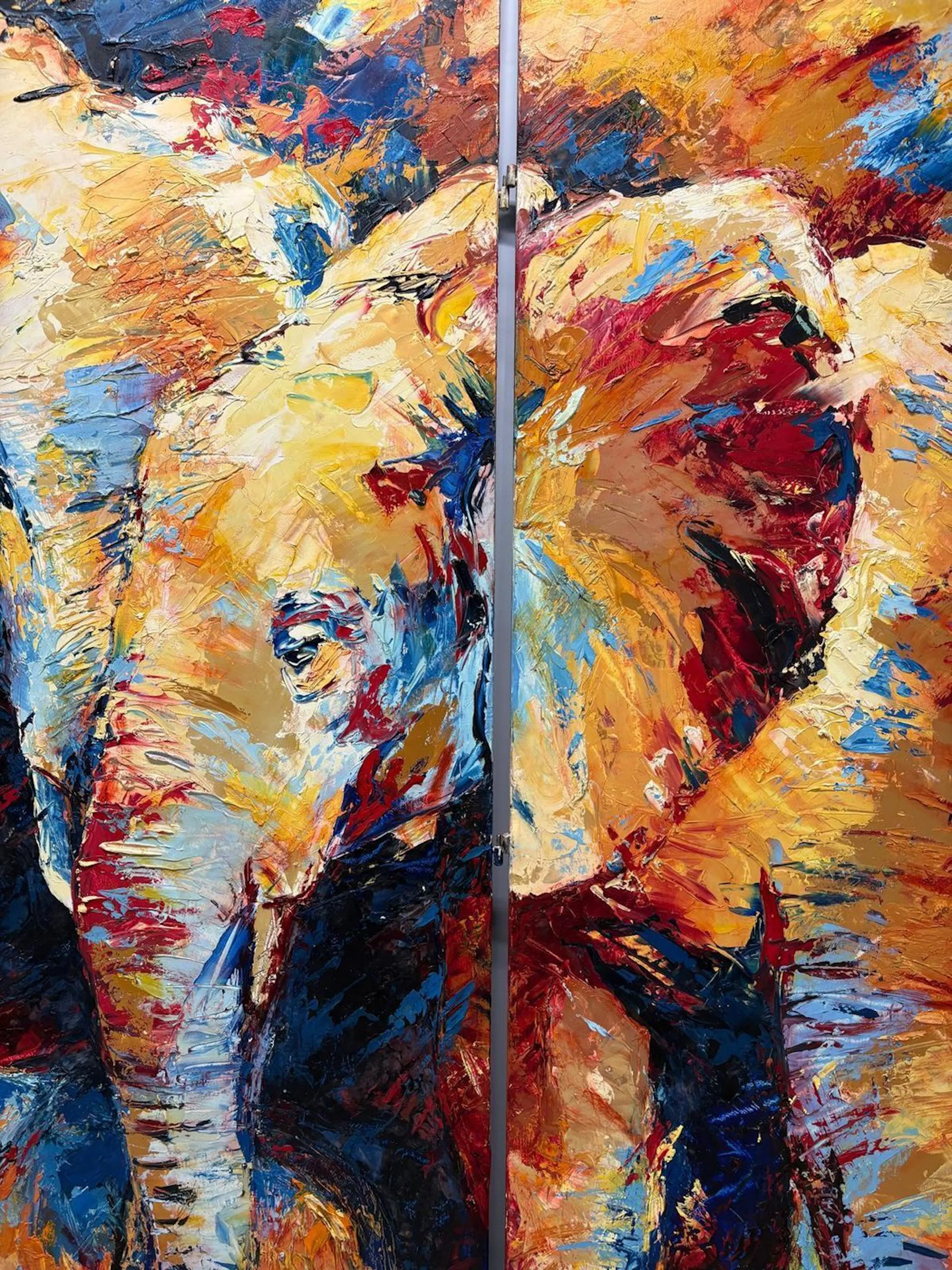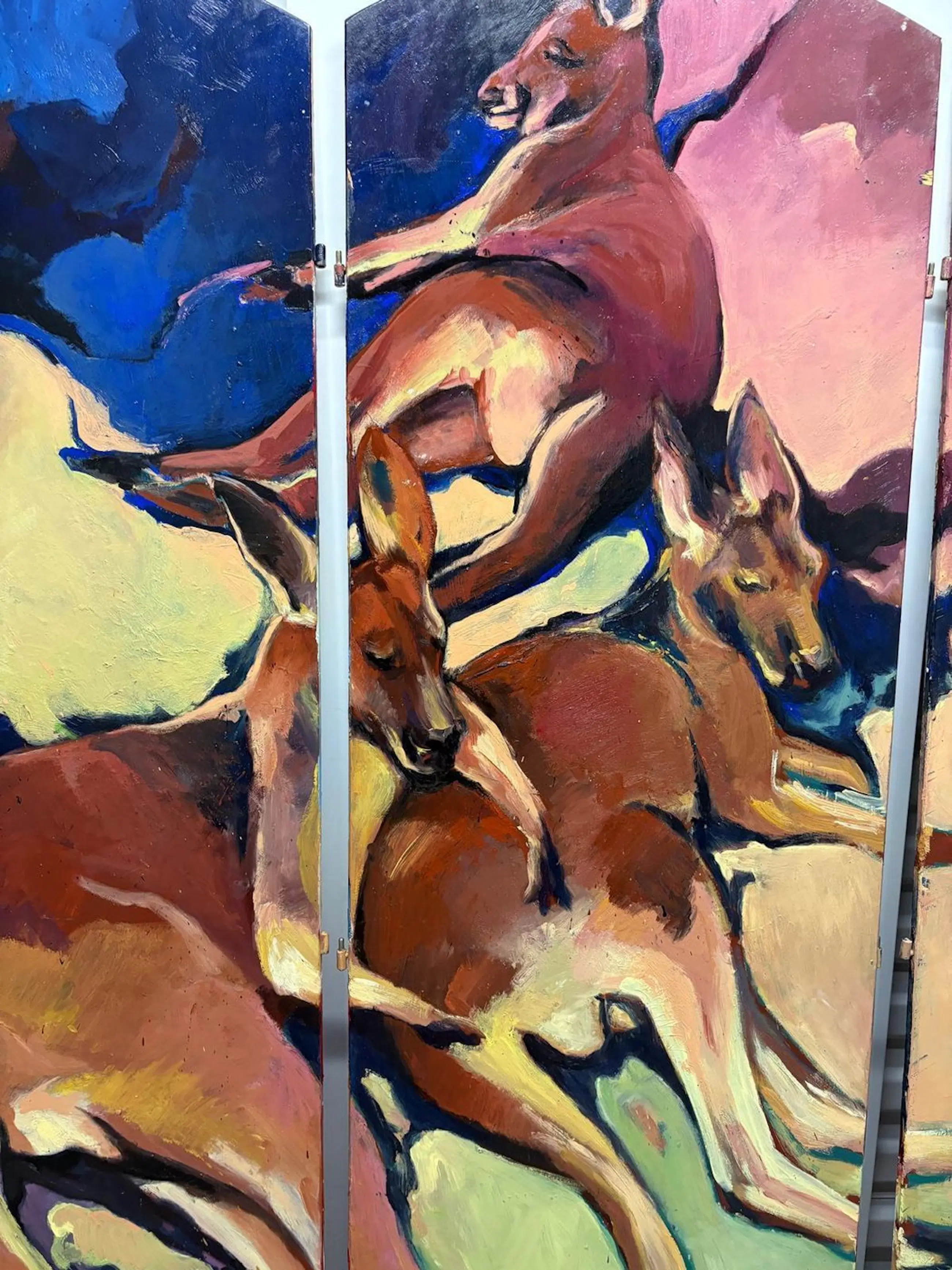 Olifanten en kangoeroes is een bijzonder en zeldzaam werk binnen het oeuvre van Ellen Voets. Het drieluik bestaat uit drie panelen die elk aan beide zijden zijn beschilderd. Aan de ene zijde zijn krachtige, expressieve olifanten te zien; aan de andere zijde levendige kangoeroes. Beide zijden zijn door de kunstenaar gesigneerd, wat het werk tot een volledig autonoom en uniek kunstobject maakt.